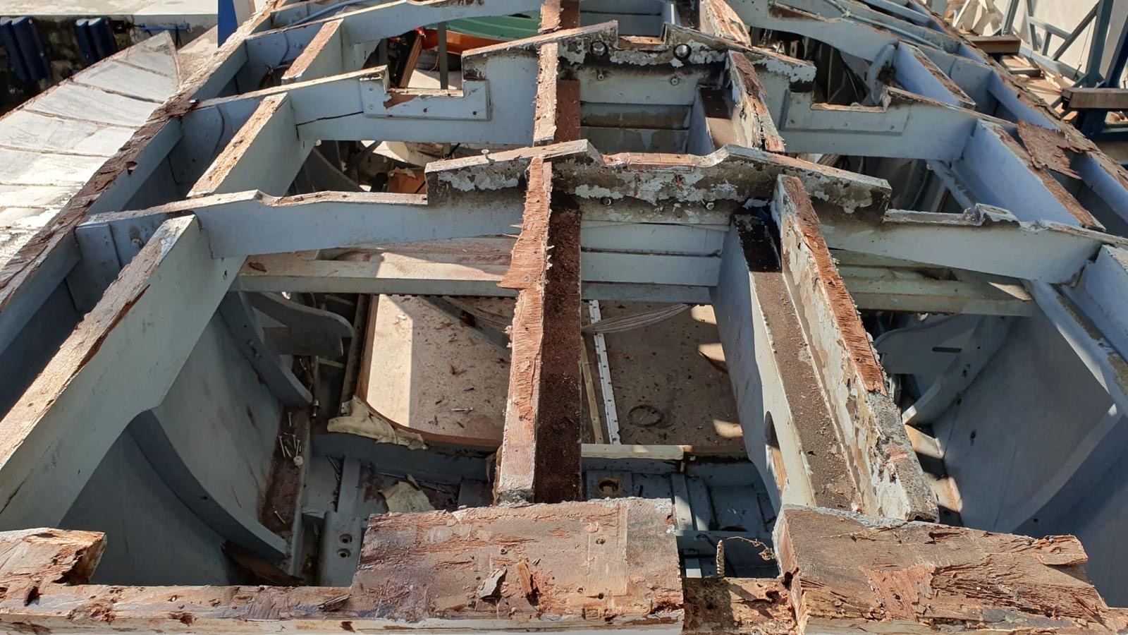 Hier ist der gesamte Unterboden schon abgenommen ... danach hat man festgestellt, dass auch der Kiel ersetzt werden muss