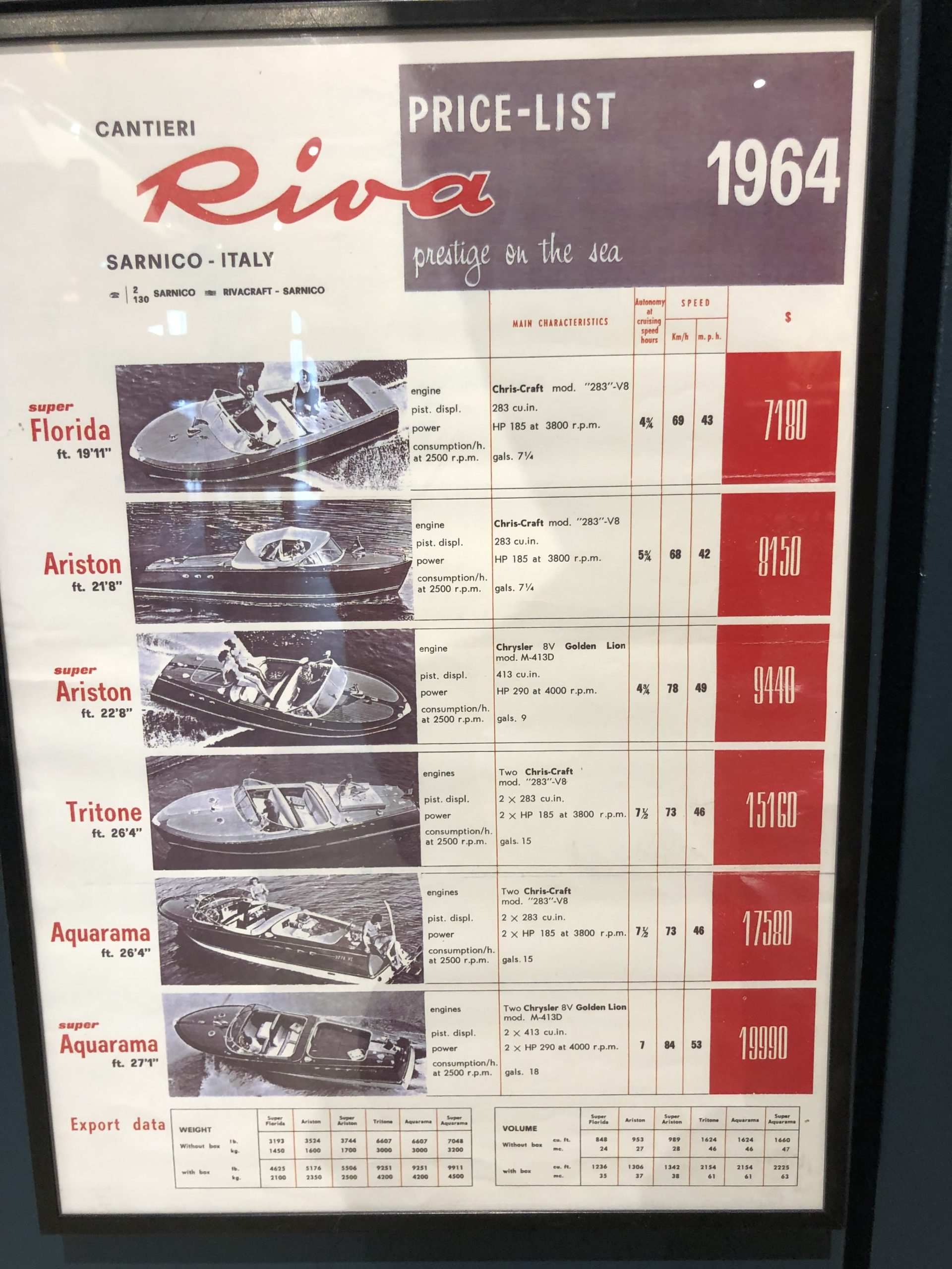 Die Preisliste aus dem Jahr 1964 weist für eine neue Riva Aquarama einen Preis von 17.580 US Dollar auf .... heute zahlt man für ein gebrauchtes, gut erhaltenes Modell gut 450 Tsd Euro