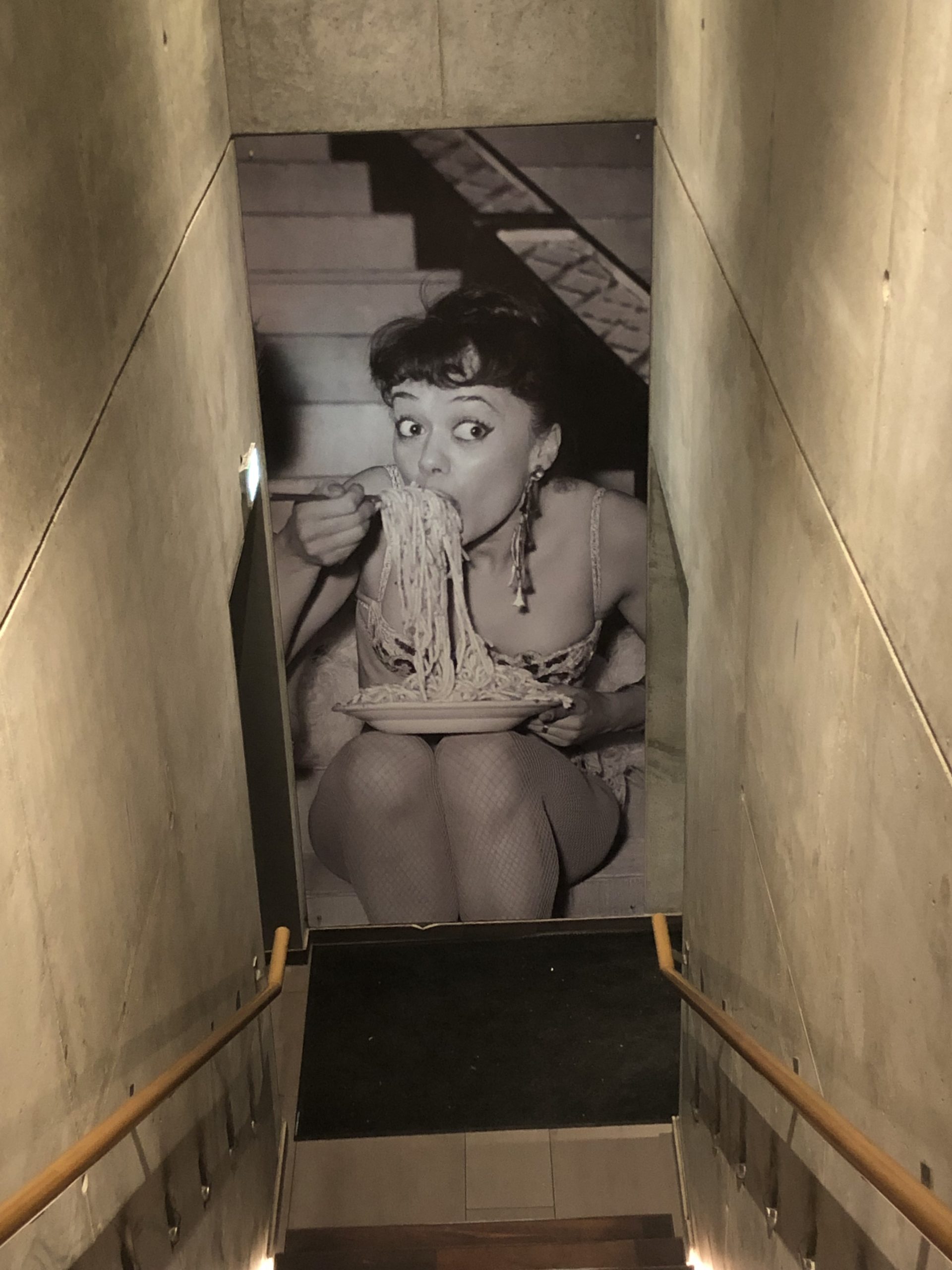 Diese italienische Dame zeigt den Herren den Weg zu den Toiletten im besuchten Restaurant in der Speicherstadt