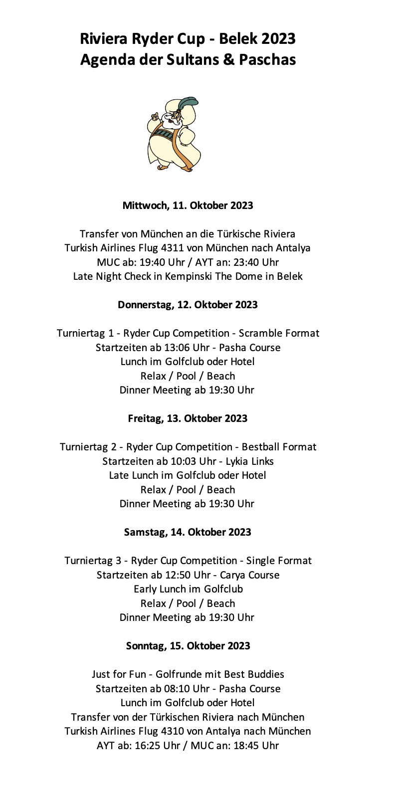 Mitte Juli haben wir uns nach einer finalen Abstimmungsrunde für eine gemeinsame Golfturnierreise der Ryder Cupper im Oktober ins türkische Belek entschieden. Seitdem wir im Frühjahr 2011 erstmals an der irischen Ostküste Golf spielten, unternehmen wir als eine über die letzten 12 Jahre auf aktuell 16 Mitspieler gewachsene Gruppe von Golf-Buddies jährlich eine gemeinsame mehrtägige Turnierreise zu interessanten internationalen Zielen. Erstmals hatten wir dabei in unserem im Frühjahr 2015 durchgeführten Event in Lissabon über drei Tage im Ryder Cup Format mit zwei Teams (LDI & RDI) gegeneinander gefightet. Das Team LDI setzte sich damals aus Spielern zusammen, die in Fluss-Fließrichtung "Links der Isar" ihren Wohnsitz haben, die Spieler vom Team "Rechts der Isar - RDI" kommen dagegen aus Bogenhausen, Haidhausen, Harlaching und Grünwald bzw. allen sonst noch rechts der Isar liegenden Heimatgemeinden. Nach unserem letzten Event im österreichischen Burgenland - welchen das Team Links der Isar souverän für sich entscheiden konnte - steht es auf unserer kumulierten Vergleichsliste aktuell 4:3 für die Linken. Durch die in diesem Jahr bedauerliche Absage von insgesamt neun Stammspielern (davon 70% Anhänger der Links-Fraktion) sowie der beiden Team-Captains Herbert und Jürgen sind unsere bisherigen beiden LDI und RDI Gruppen - und damit die Competition mit Isar-Orientierung leider nicht mehr darstellbar. Wir haben uns daher für eine andere Team Zusammensetzung auf Basis von Captains Picks sowie aktueller Leitungsniveaus entschieden und spielen in diesem Jahr mit den beiden neu zusammen gestellten Teams Sultan und Pascha wieder mit jeweils acht Spielern gegeneinander. Zum diesjährigen Vergleich unserer aktuellen Spielperformance treffen wir uns vom 11. bis zum 15. Oktober 2023 an der Türkischen Riviera. Von Mittwoch bis Sonntag geht es nach Belek, wobei wir am 11. Oktober mit der Abendmaschine von Turkish Airlines von München nach Antalya fliegen und im Kempinski The Dome Hotel in Beleg wohnen werden. In Belek spielen wir auf den PGA Courses Pasha, Carya und Lykia Links.