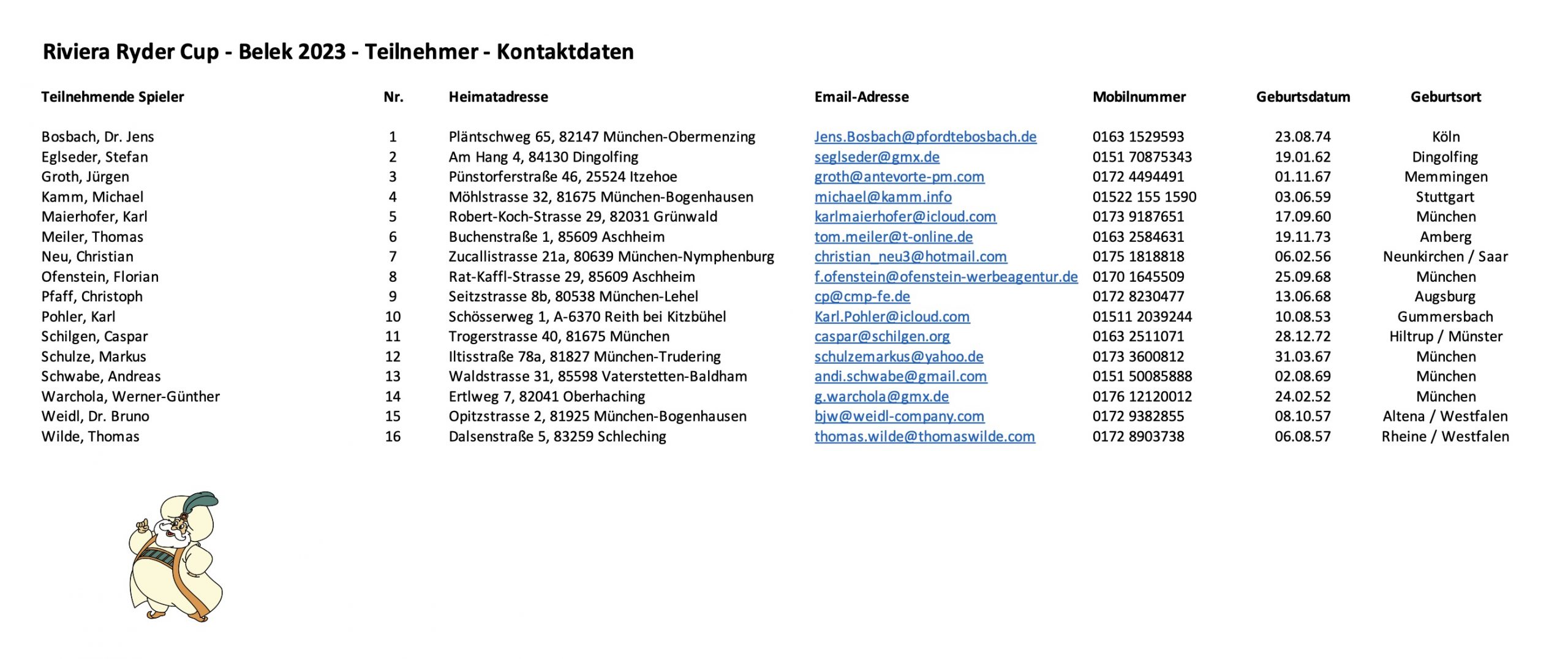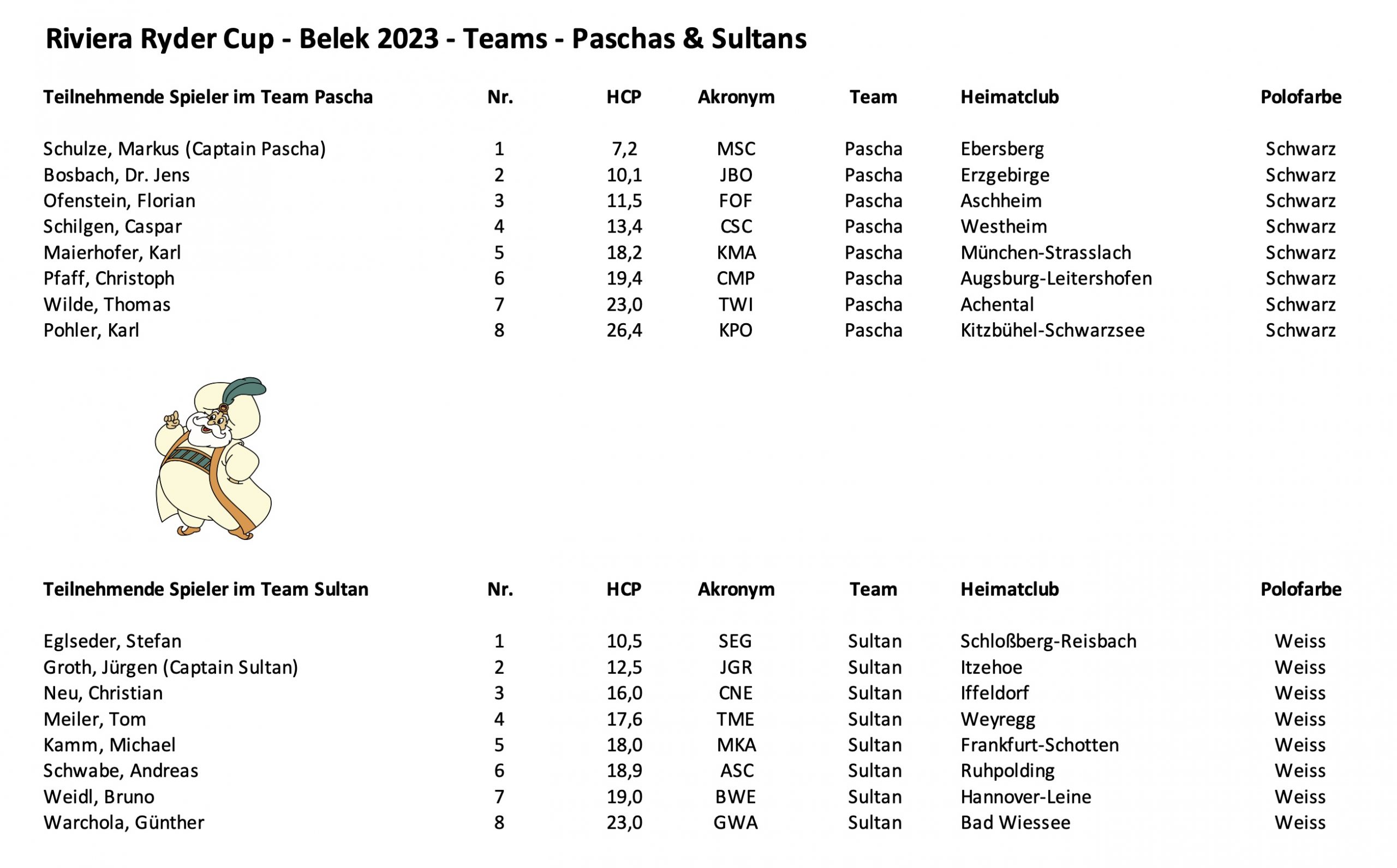 Beim offiziellen Ryder Cup Turnier – welches in diesem Jahr vom 29. September bis zum 1. Oktober 2023 als 44. Ryder Cup auf dem Course Campionato des Marco Simone Golf and Country Club im italienischen Guidonia Montecelio bei Rom ausgetragen wird – stellen die Golfregionen EUROPA und USA jeweils zwei Teams mit zwölf Spielern. Die Qualifikation der Teilnehmer erfolgt hauptsächlich über die Moneylists der internationalen Touren. In unserem Fall des Riviera Ryder Cup in Belek im Oktober werden wir wie in den Vorjahren mit insgesamt 16 Teilnehmern in zwei Teams mit jeweils acht Spielern antreten. Die Mitglieder unserer beiden Sultan und Pascha Teams wurden primär über ihre Qualifikation als besonders sozialverträgliche Sportsfreunde ausgesucht.