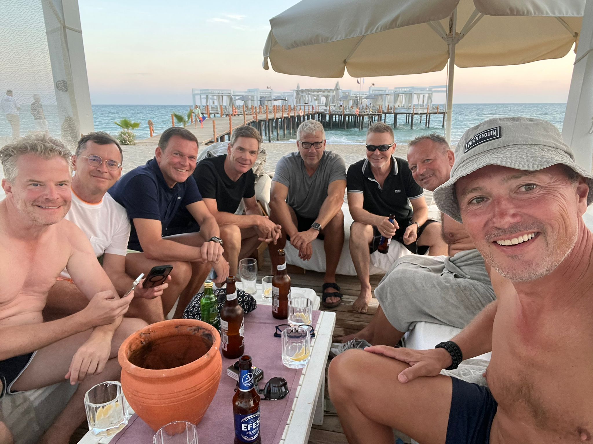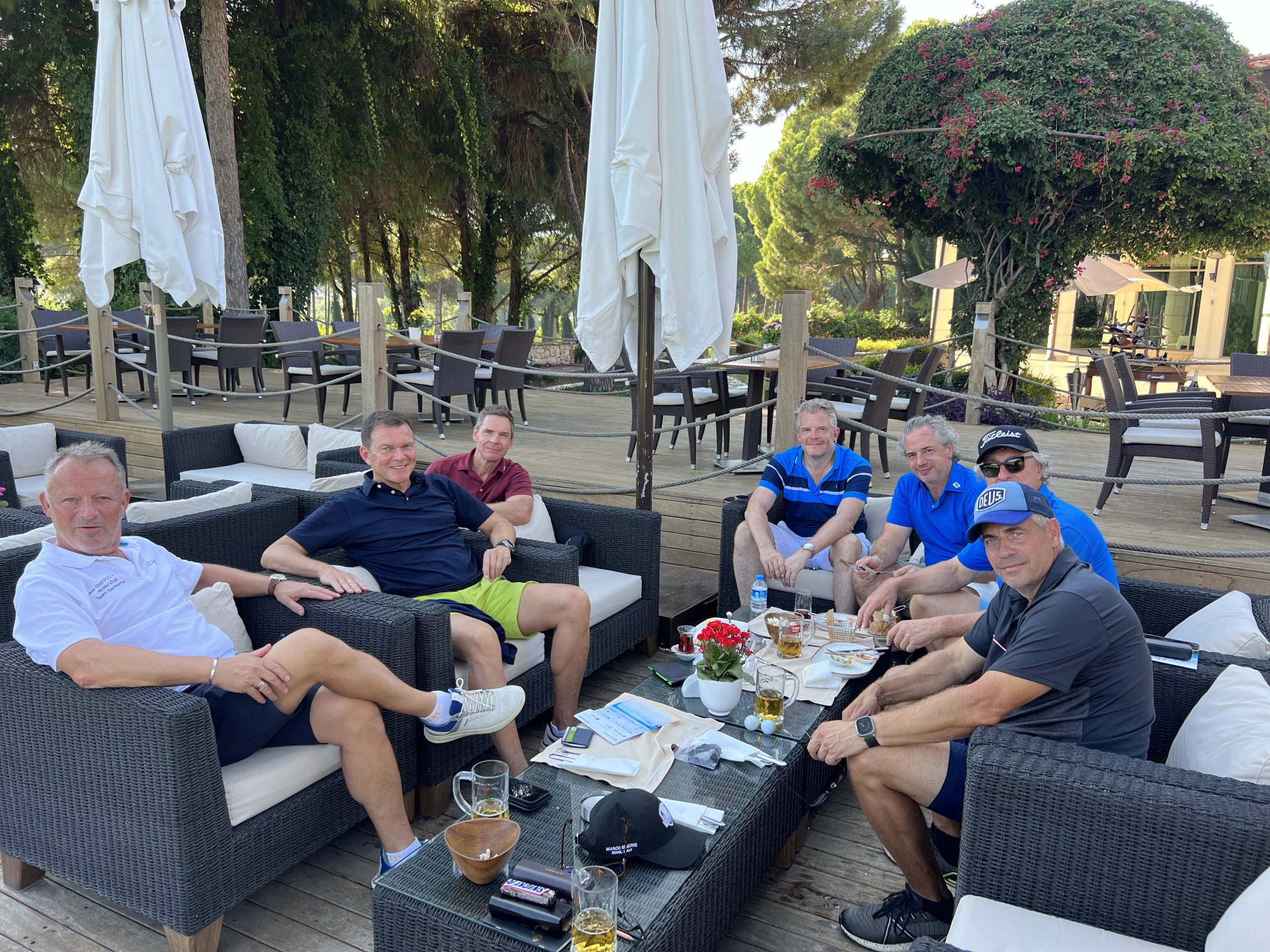 Mitte Oktober ging es zum Glück nicht - wie ursprünglich geplant - ins regnerische und kühle Hamburg, sondern ins sehr sonnige und ziemlich warme Belek an die türkische Riviera. Mit sechzehn Teilnehmern - Tom Meiler fiel am Tag zuvor leider wegen einer Verletzung aus - flogen wir mit dem Abendflug von Türkisch Airlines - bzw. deren Carrier Anadolu Jet - von München nach Antalya. Es war eine problemlose Anreise in einem halbleeren Fluggerät, komfortablen Mini Bussen bei der halbstündigen Weiterreise an die Küste und einem Late Night Check-In in Belek. Im Kempinski Hotel The Dome genossen wir noch Mitternachtssnacks bevor es in recht komfortable großzügige Zimmer zur Nachtruhe ging. Während unseres Aufenthaltes in Belek wachten wir immer bei herrlichem Wetter auf und konnten vor unseren Golfrunden nicht nur im Meer oder im riesigen Pool Baden bzw. auf den Hotelplätzen Tennisspielen, sondern auch praktische Dinge wie Friseurbesuche und Massagen in der Anlage geniessen. Durch den Tagesablauf mit Frühstück, Snacks und Abendessen im Hotel war der Trip extrem entspannt. Dinner Meetings waren jeweils um 20 Uhr terminiert und danach gab es Drinks & Talks bei Life Musik. Unseren sozialen Austausch empfand ich dabei als sehr inspirierend und es war schön, sich auch mit den Golf Buddies austauschen zu können, die man während des Jahres nicht so oft sieht. Daher empfand ich die diesjährige Gruppendynamic besonders anregend; auch die Plätze waren super und die Teams von den Captains perfekt zusammengestellt. @Markus und Jürgen ... das habt ihr großartig gemacht und umgesetzt ... vielen Dank für euren glorreichen Einsatz! Euch allen besonderen Dank für meine neue Jacke und den chicen Hut, den meine Gattin gerade eben verwundert in der Garderobe entdeckt hat. Hoffentlich sehen wir uns bald wieder ... bei Änderungs- und Ergänzungswünschen zum Protokoll bitte ich um entsprechende Rückmeldung ...😍 ... 😂 ... Der Riviera Ryder Cup 2024 wirft bereits heute seinen sehr langen Schatten voraus. Thomas Hellmann war erster Frühbucher und so geht es mit ihm und hoffentlich auch wieder allen weiteren ehemaligen sowie aktuellen Teilnehmern zu einem echten Ryder Cup Voll-Format im Jahr 2024. Unerschrockene echte Ryder Cupper kämpfen ja bekanntlich 12 gegen 12 ... 😂