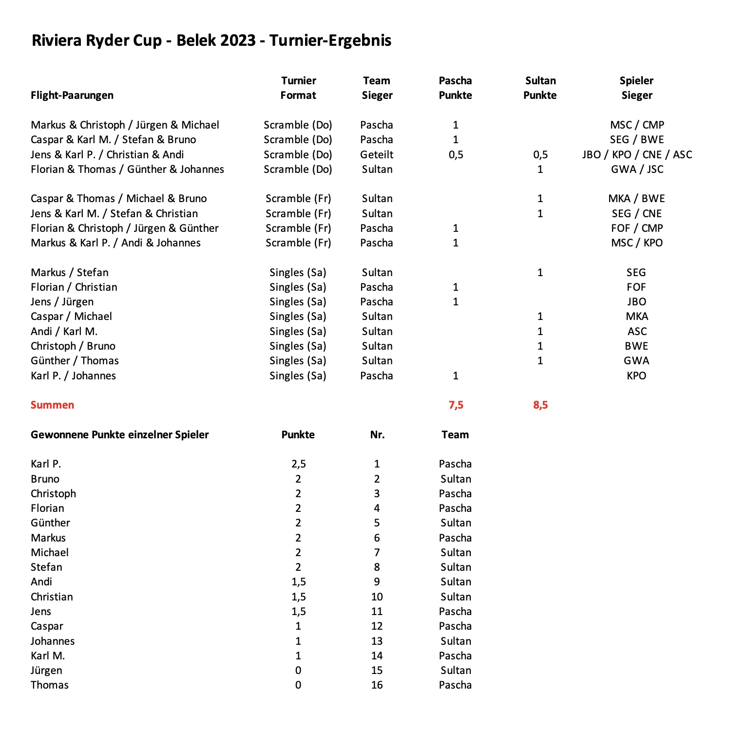... und so ging das Turnier übrigens im Detail aus ... Karl Pohler war bester Einzelspieler und die Sultans hatten knapp die Nase vorn