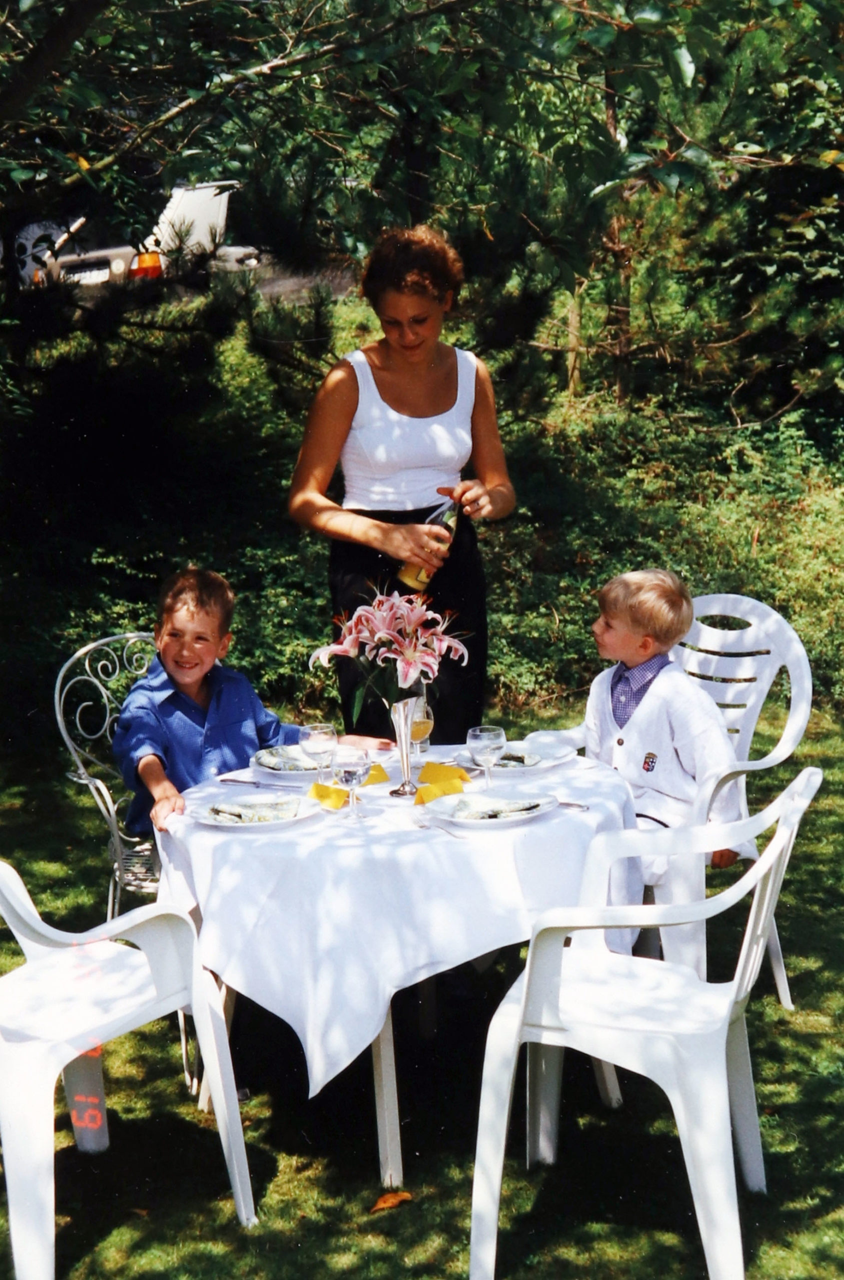 Die jungen Herren - wir haben es hier mit den beiden Enkelsöhnen Paul und Severin zu tun - haben ihren eigenen Tisch im Garten und wickeln später Oma und Opa wie immer um den Finger