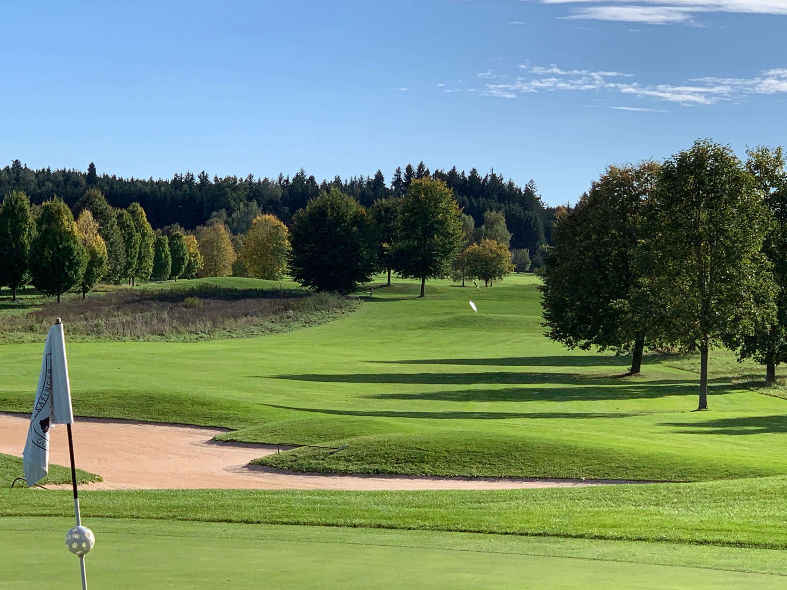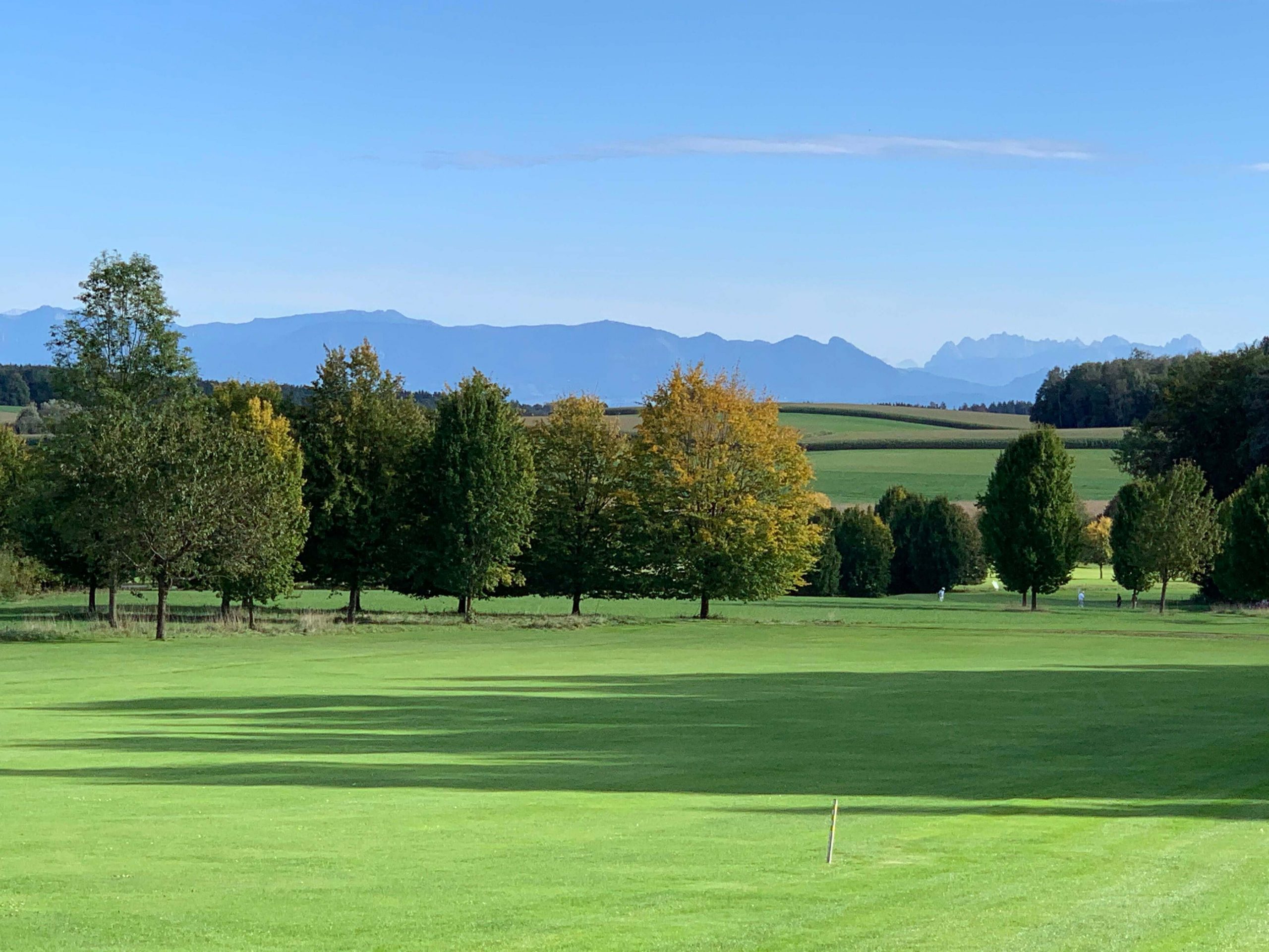 Der Blick über die Driving Range (links) und das dritte Loch (rechts) der Club Anlage in den Süden, wo sich die Bayerische Alpenkette ausbreitet