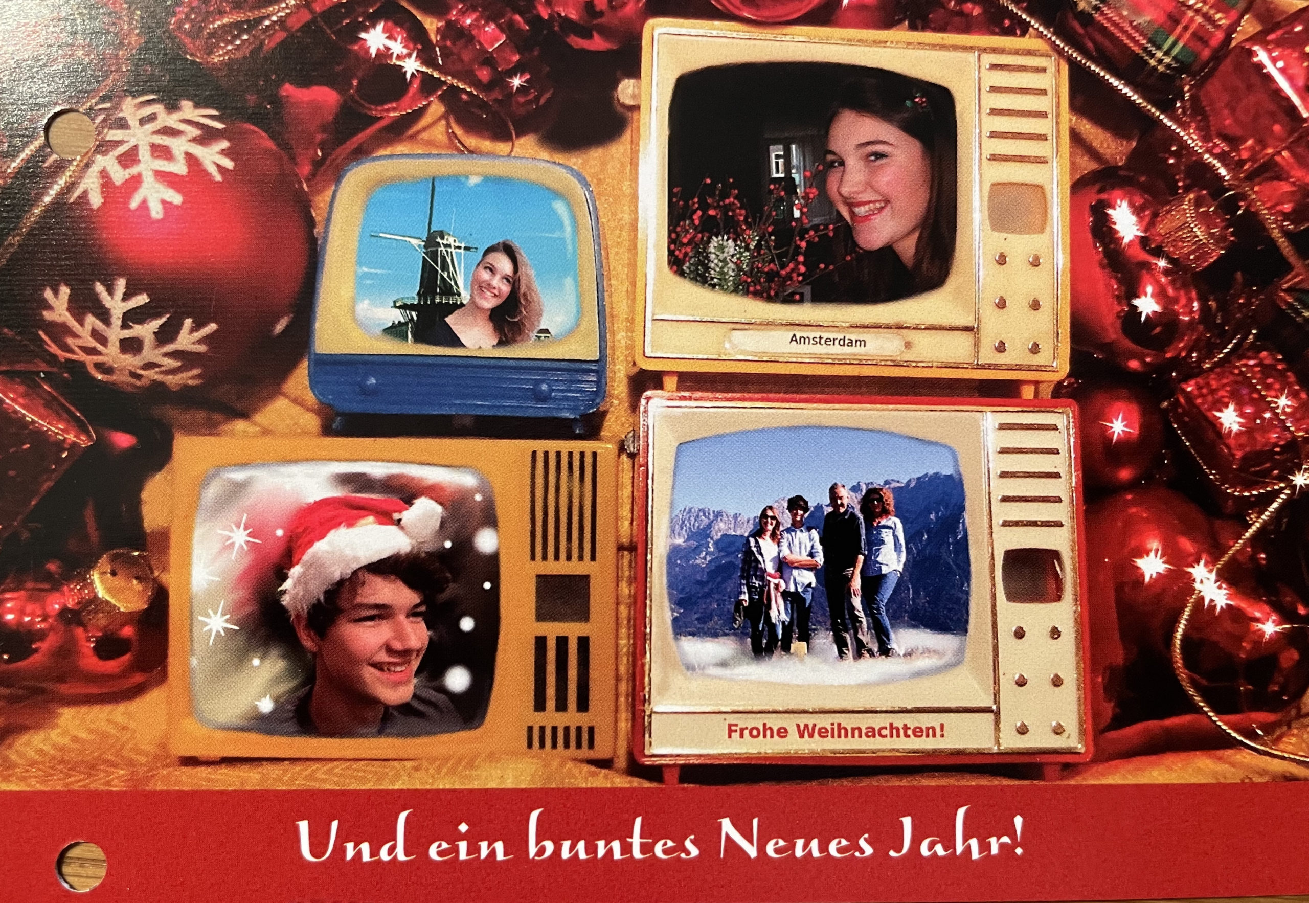 Im Monat Dezember finden wir jedes Jahr gerne die per Post eingehenden persönlichen Weihnachtskarten von Familie & Friends im Briefkasten. Wir freuen uns immer wieder aufs Neue auf die jeweils liebevoll und zum Teil auch mit erheblichem Aufwand hergestellten Karten mit Photos der Freunde unter Einbindung deren Kinder. Wir schätzen diese besonderen Grüße und Erinnerungen zu Weihnachten so sehr, daß wir sie seit Jahren konsequent ablegen und aufbewahren. Durch dieses Archiv, dessen antiquarisches Ablagesystem an den kleinen runden Löchern identifiziert werden kann, sind wir auch jetzt noch in der glücklichen Lage die Karten aus Ihren Ordnern im Aktenkeller zu befreien und auf unserer Website visuell dauerhaft sichtbar zu machen. In unserem digitalen Tagebuch werden sie uns daher auch immer einen eigenen Beitrag wert sein. An den Rückblicken der früheren Jahre können wir immer am schönsten sehen, wie die Kinder größer und erwachsener werden und auch die Eltern reifen. Zwar nehmen wir es uns auch immer wieder vor, selbst Weihnachtsgrüße mit persönlichen Photo Karten an unsere Lieben zu versenden ... bei dem Vorsatz blieb es allerdings bisher !!