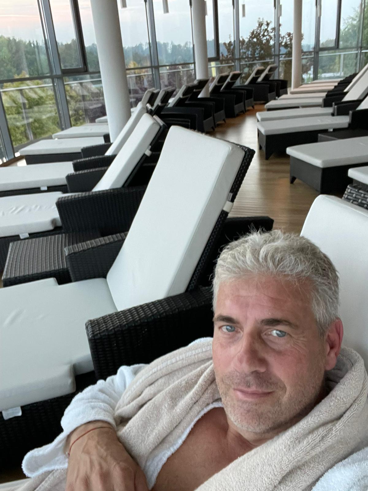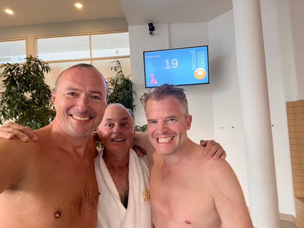 Nach der Runde war Badespass und Saunalandschaft verordnet: Flo wartet auf die Besetzung der neben ihm noch freien Liegen mit attraktiven Golferinnen, Caspar ist der Schnellste auf der Wasserrutsche und ich selbst bin zur Abschreckung korrekt mit Badehaube unterwegs