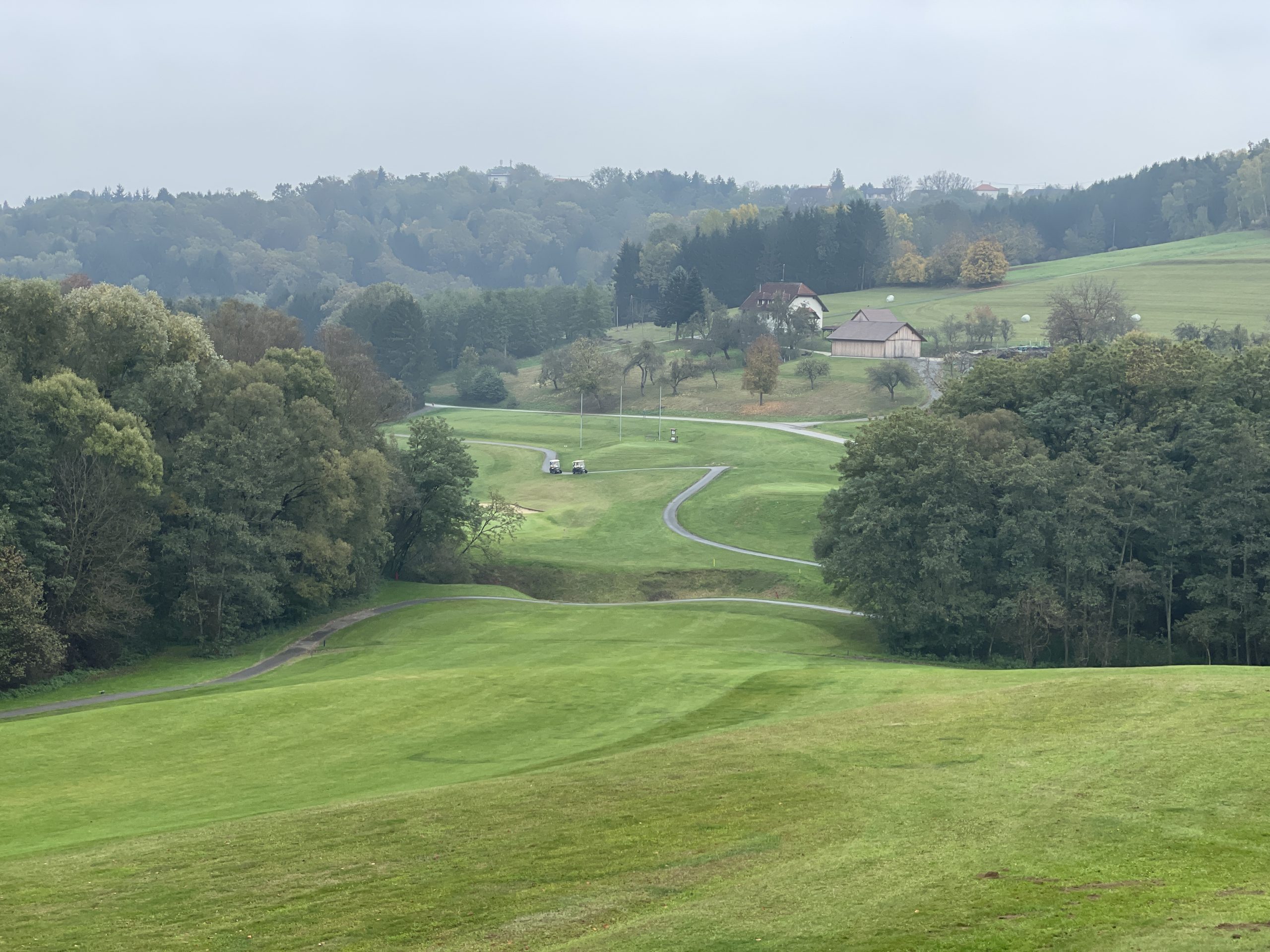 Der Panorma Kurs des Golfresorts in Stegersbach trägt seinen Bei-Namen "Die Streif" nicht ohne Grund. Zum Teil geht es richtig steil bergab. Auf dem Rückweg von einer feuchten Runde ins Hotel treffen wir uns zu aufwärmenden Snacks in der Mühle und verhocken hier bei einigen Flaschen Wein