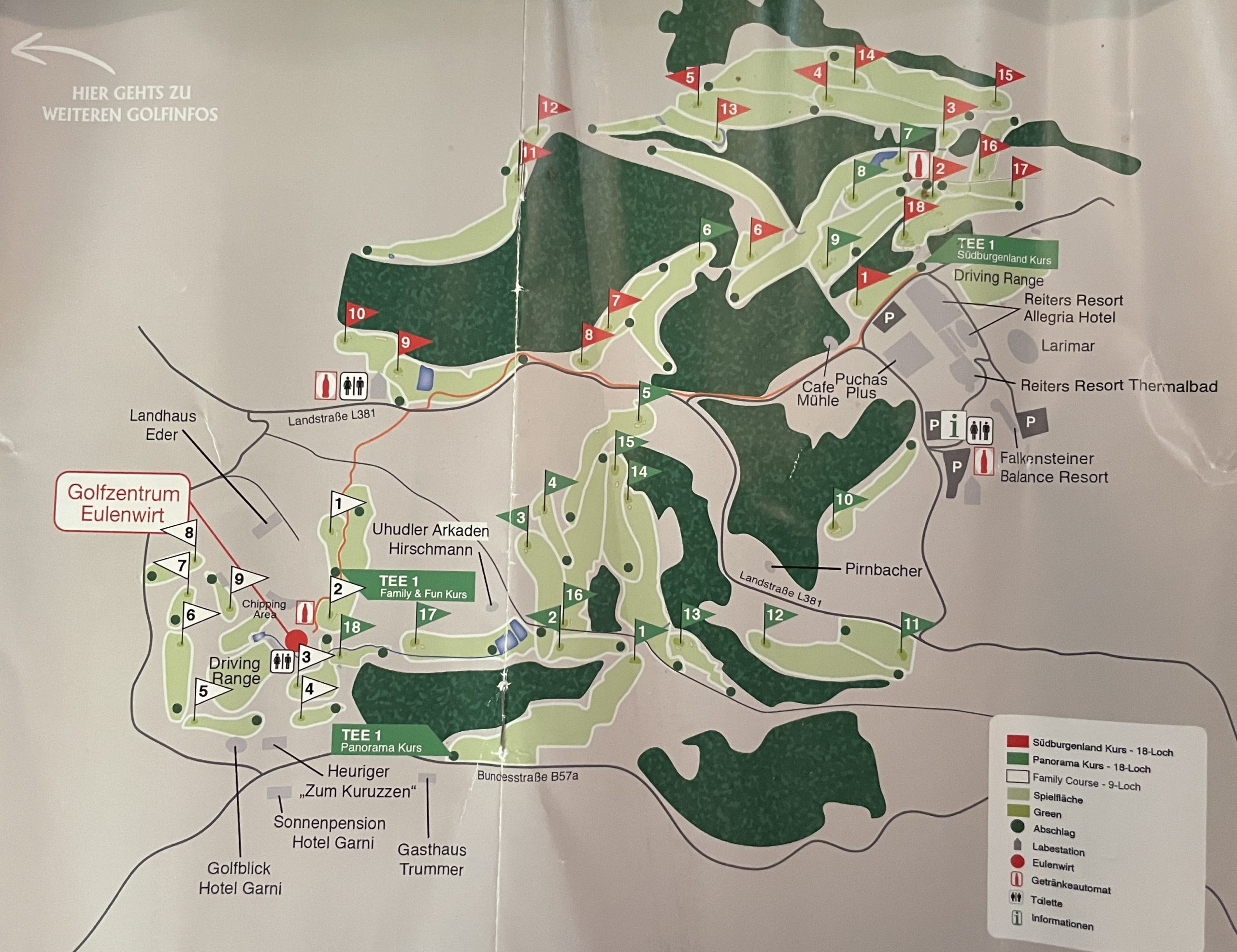 Man sollte vor dem Start auf die Golfrunden nochmals einen Blick auf die Übersichtskarte geworfen haben. Die beiden Plätze sind ineinander verschachtelt und durch Hügel und Täler nicht gerade übersichtlich