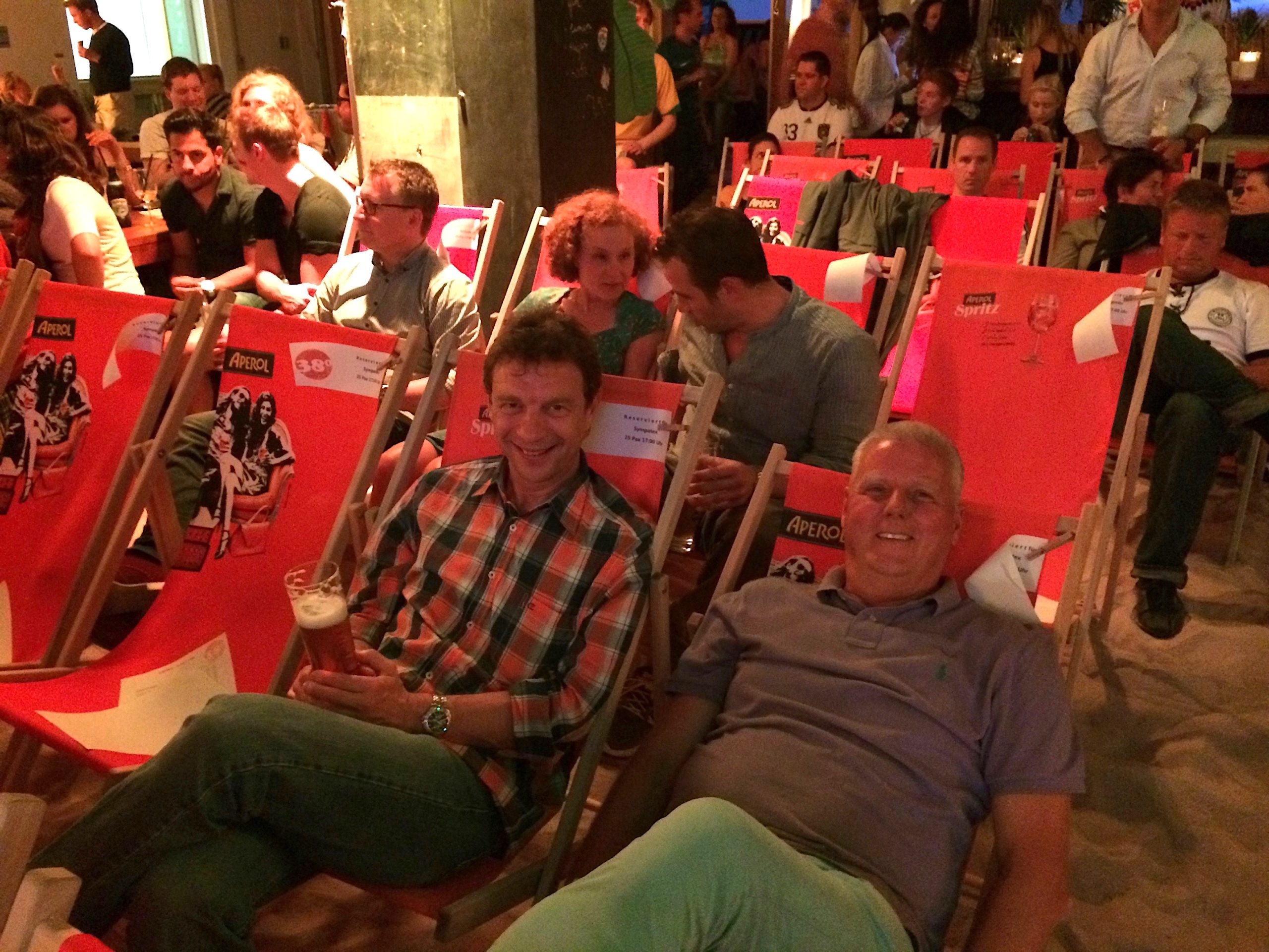 Als hätte ich es geahnt ... bei der Auswahl des Termins für unser jährliches Sympatex Sommerfest hatte ich mir den Fussball WM Spielkalender vorsichtshalber schon im Februar ausgedruckt und dann für unseren Event ganz optimistisch einen der beiden Halbfinaltermine im Juli definiert. Durch unsere gute Erfahrungen in früheren Jahren wurde als Location dann auch für Dienstag, den 8. Juli 2014 wieder das Beach 38° im "Kunstpark Ost" bestimmt. Und dort ging es dann richtig ab ... wer hält diesen Moment und Abend fest. Besser konnte es nicht sein! Das denkwürdige Halbfinale der Fussball WM in Brasilien haben wir nämlich im Rahmen unseres Sommerfestes mit der gesamten Belegschaft der Firmen Sympatex und Ploucquet im Beach 38° Club in Liegestühlen angesehen. Genauso lässig und bestimmt noch relaxter als Trainer Jogi am Strand. Das phänomenale Ergebnis ist ja allseits bekannt ... 7 : 1 für Deutschland! Es war ein Highlight .... und wir waren brasilianisch gestimmt mit dabei