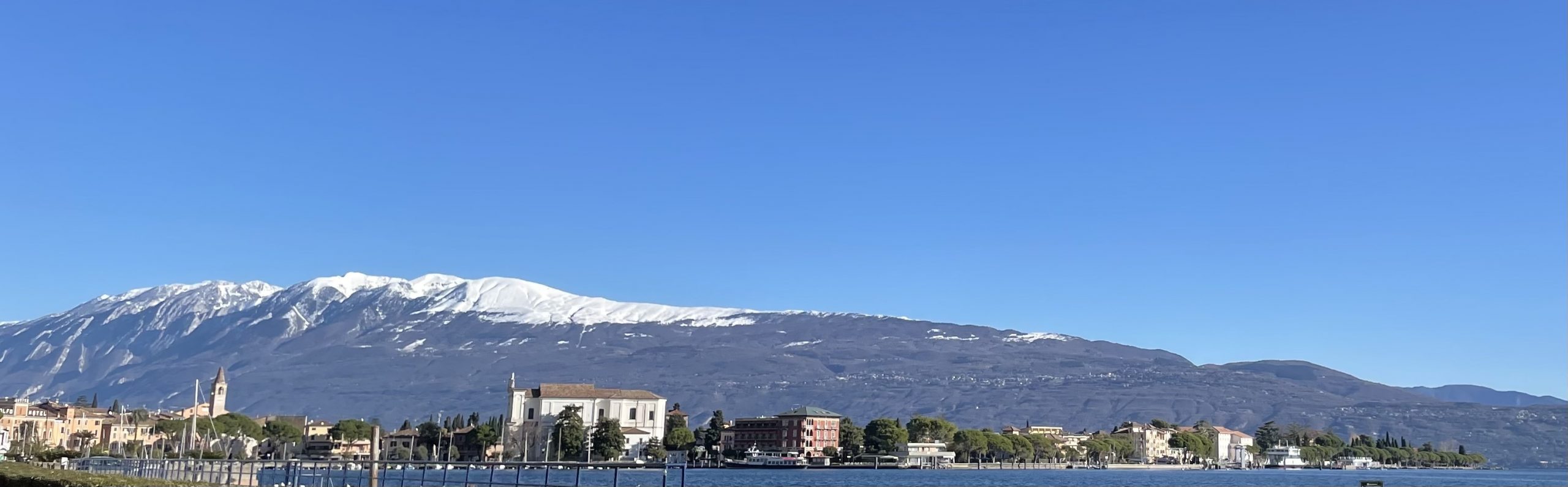 Blick auf den Lungolago von Salò mit dem verschneiten Monte Baldo im Hintergrund