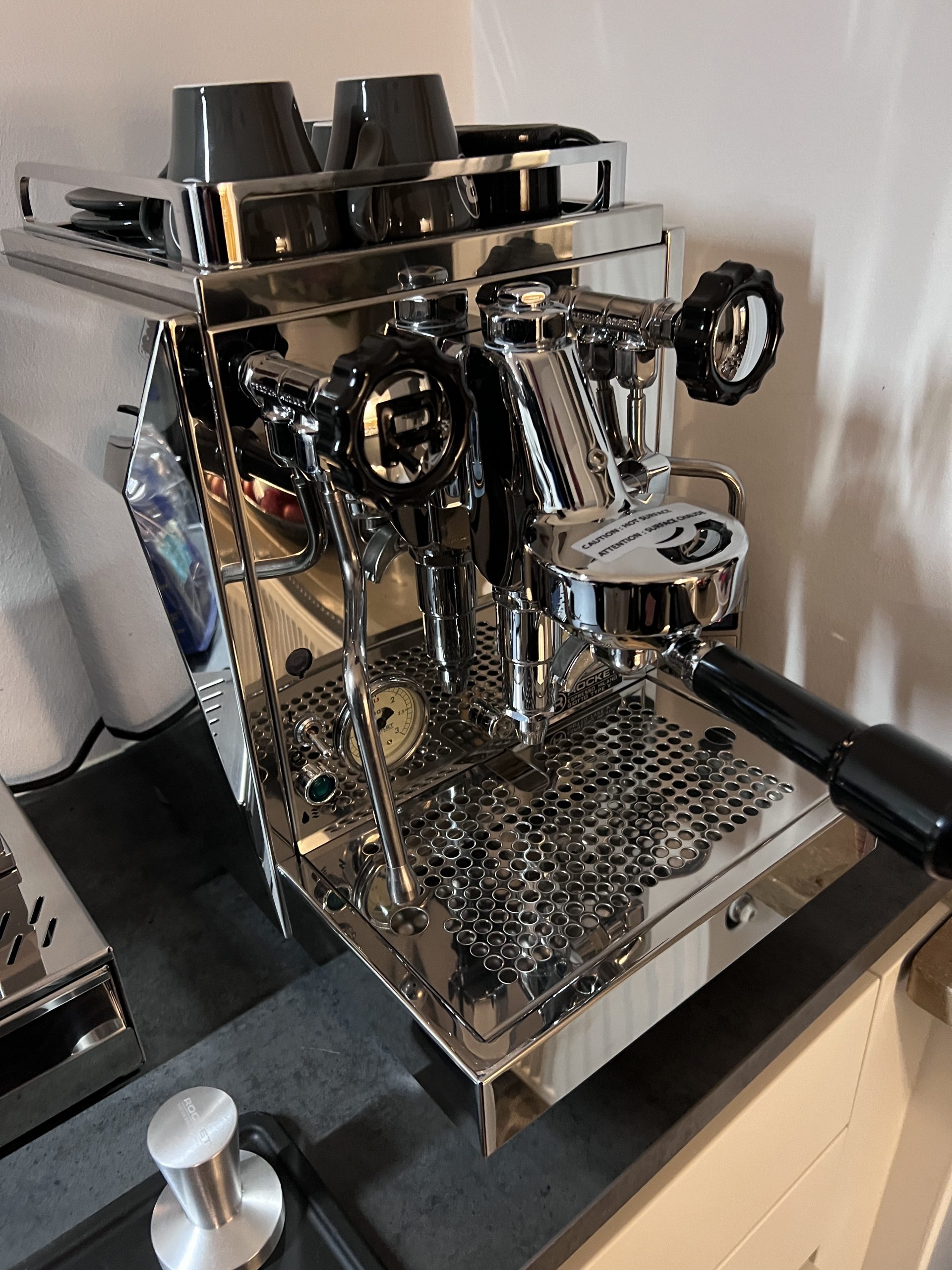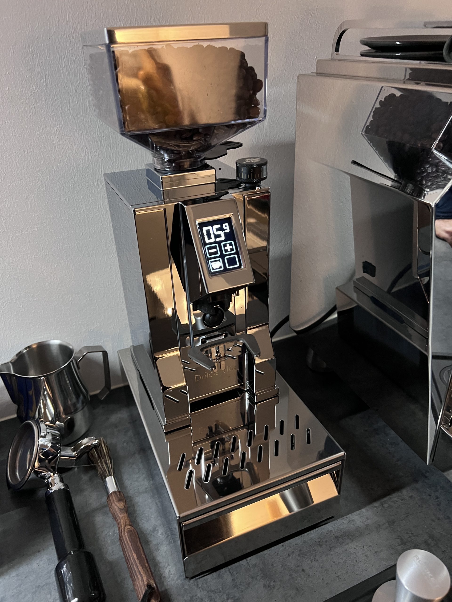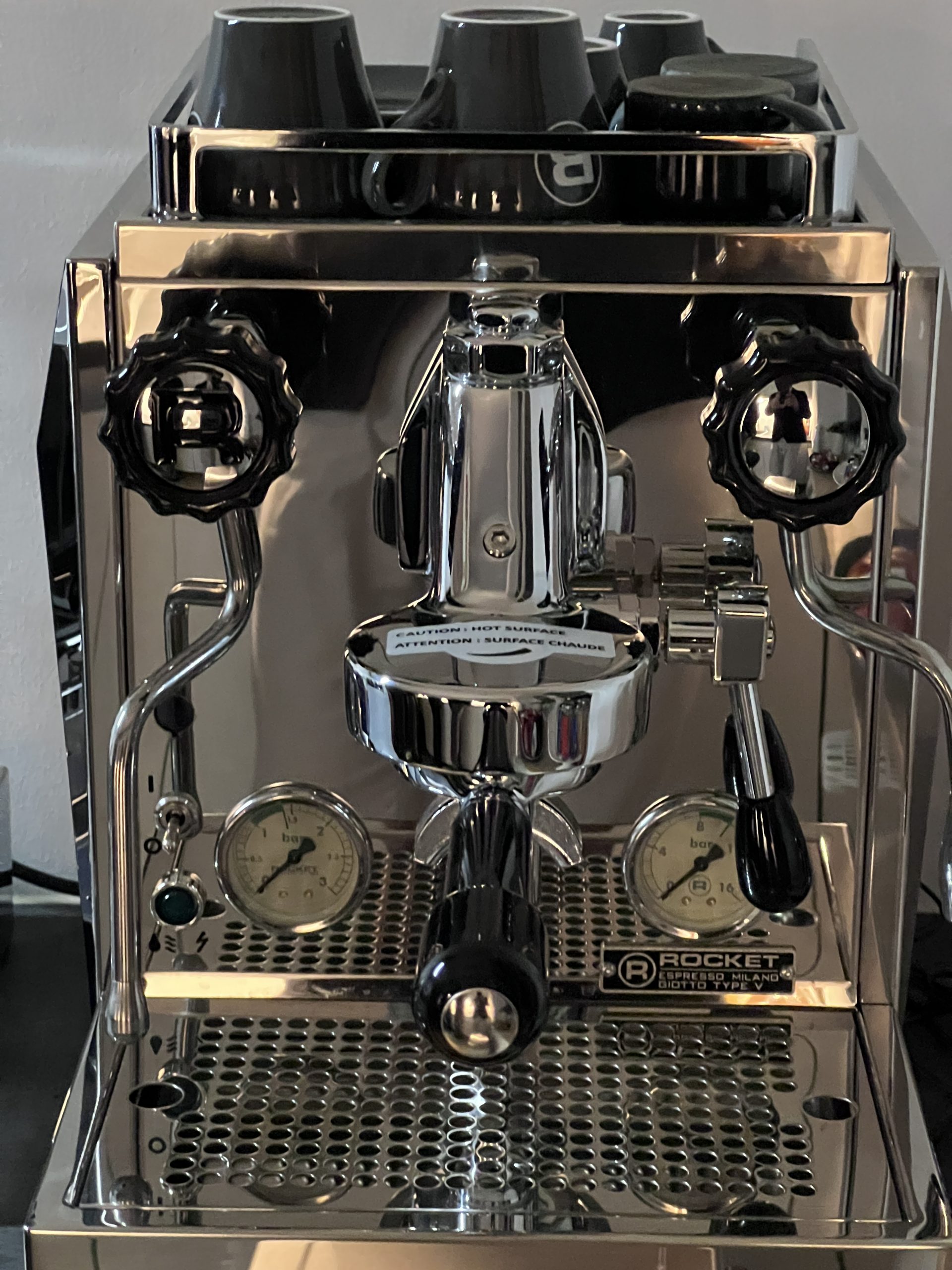 Die Zweikreis Lady Giotto Type V (Vibration) der Firma Rocket Espresso Milano sowie die direkt daneben platzierte Espresso-Kaffee-Mühle der Marke Eureka Mignon Dolce Vita 55 Chrom haben sich die interessierten Herren detailliert von Pascal vorführen lassen