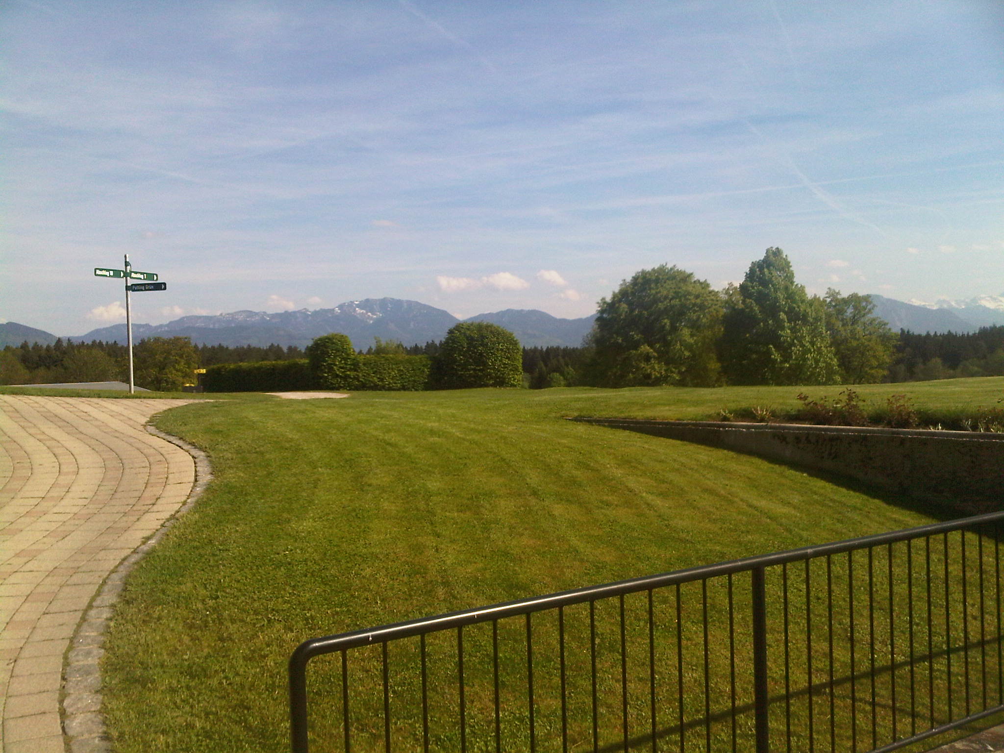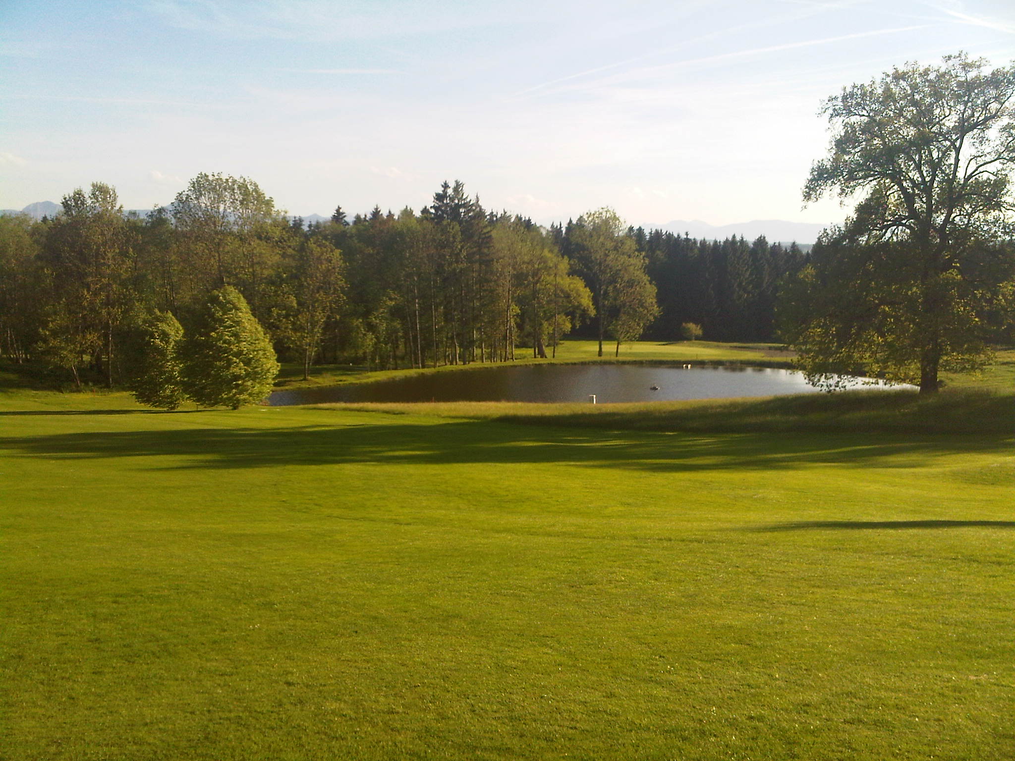 Der Blick in Richtung Süden reicht über den großen Teich zwischen dem 7. und dem 9. Loch bis zur Alpenkette mit der Zugspitze bei Garmisch