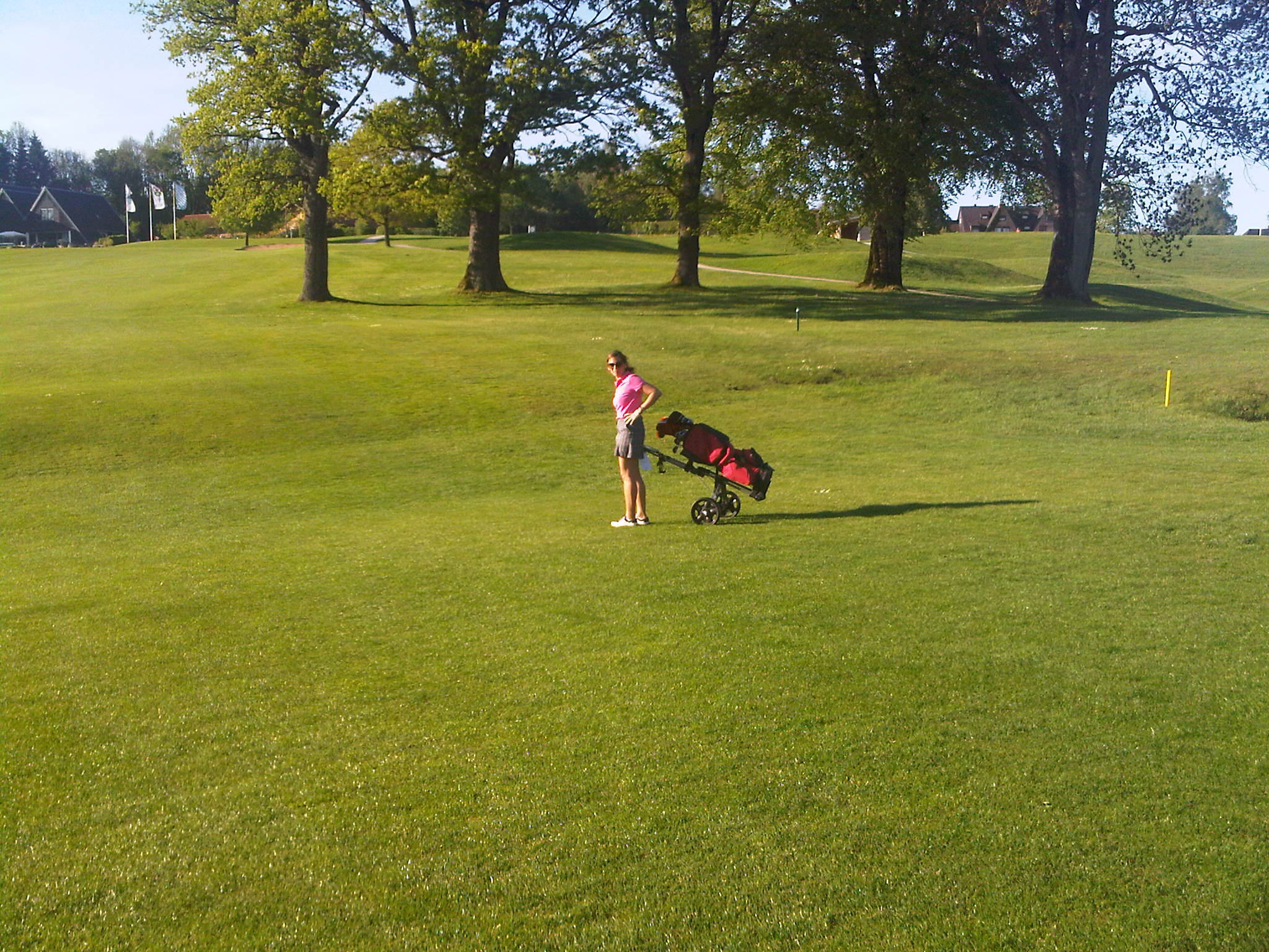 Das 9. Loch führt als leichtes rechtes Dogleg nach dem Abschlag flott nach oben, weshalb man bei einem langen Schlag auch blind auf dem Green landet ... Maria macht´s ganz ordentlich