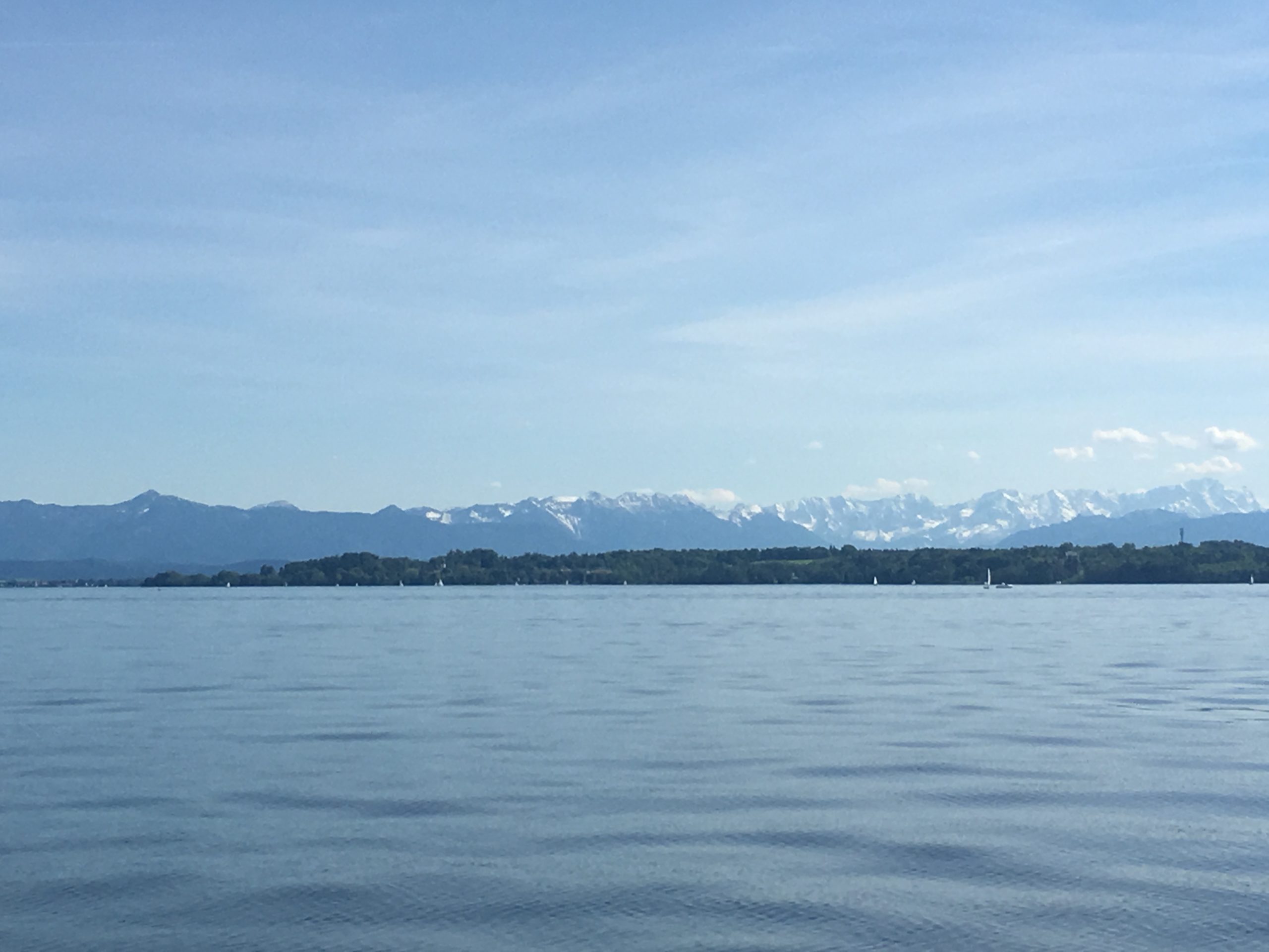 Der südliche Starnbergersee liegt ruhig vor uns und der herrliche Blick reicht weit bis in das Karwendelgebirge hinein