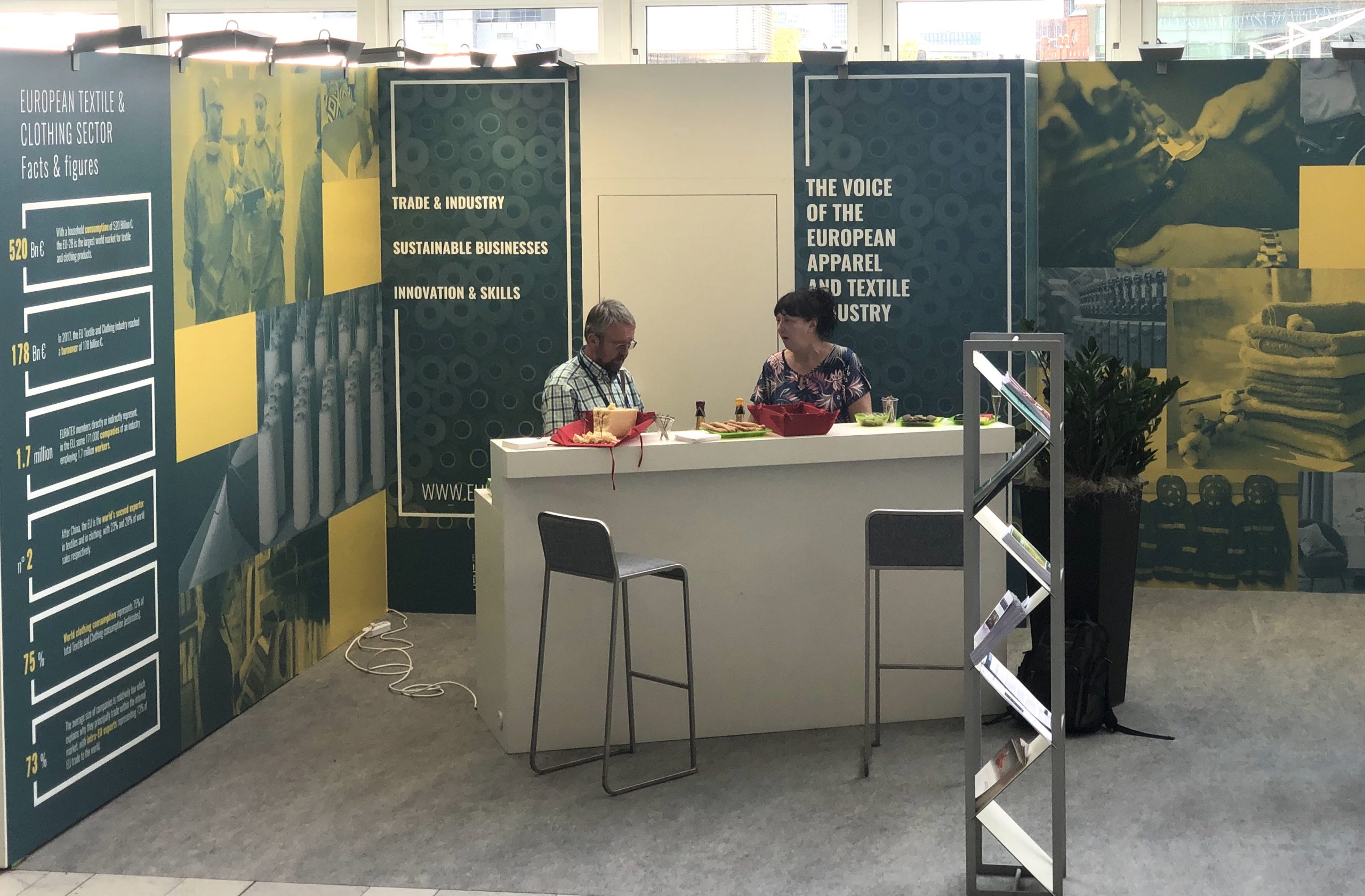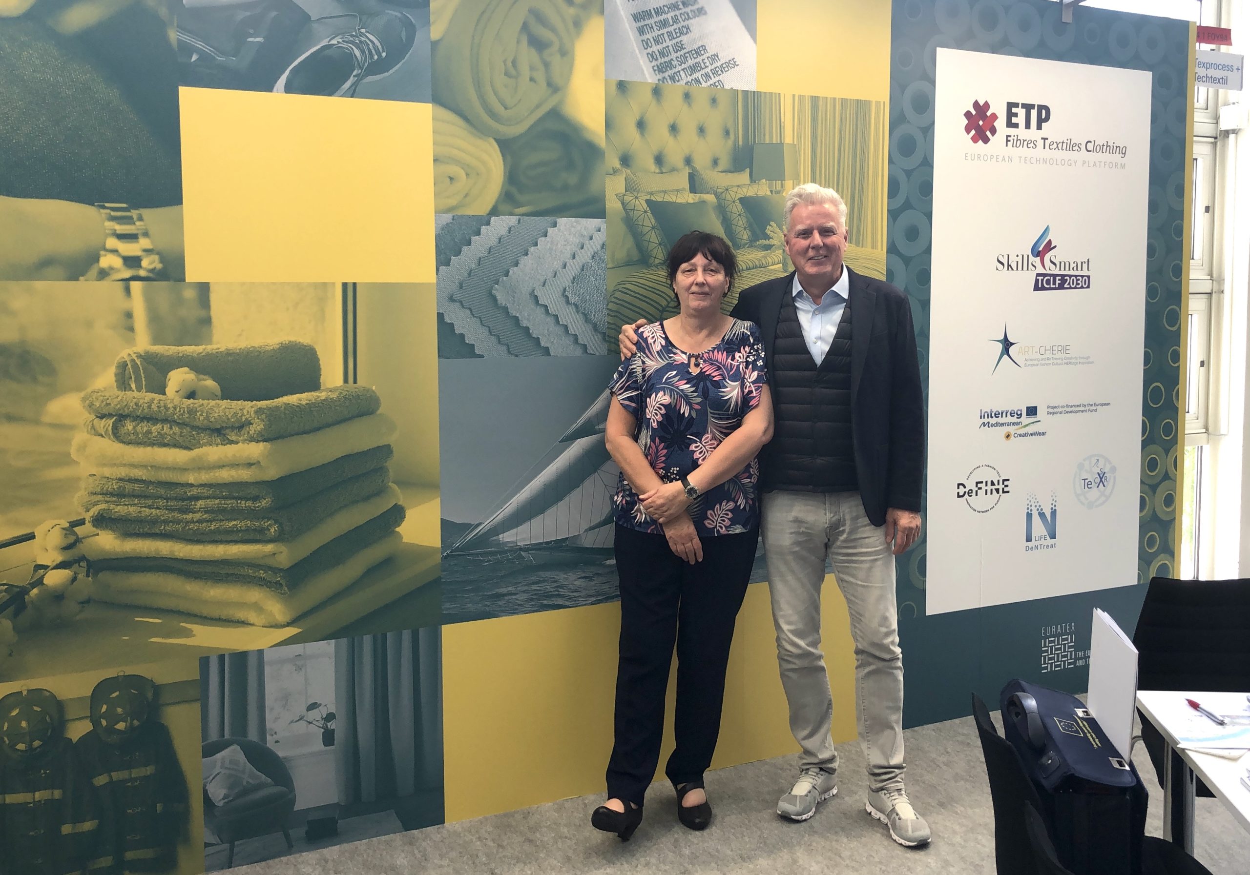 Hier mit Paulette - der guten Seele der ETP - am Messestand der European Technology Platform für Fibres, Textiles und Clothing. Die ETP ist die führende europäische Verbandsplattform für die Zukunft von Textilien und Kleidung mit Sitz in Brüssel und wird von mir aktuell als deren President vertreten.