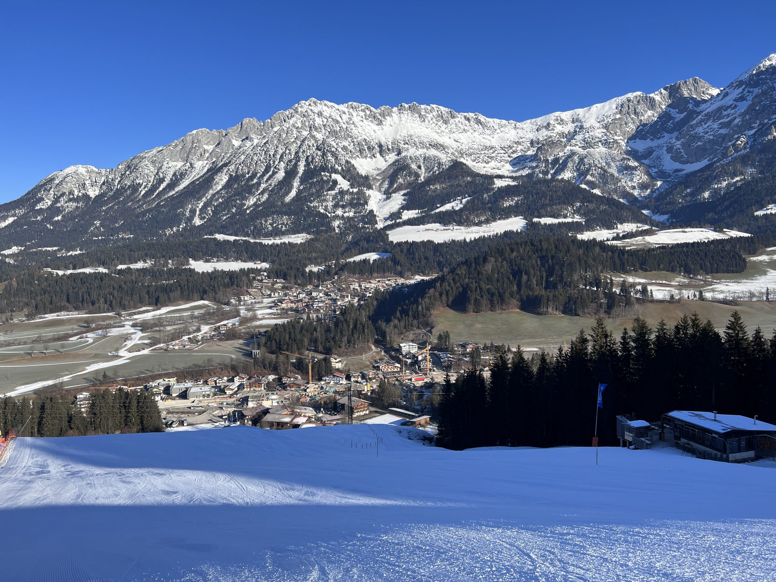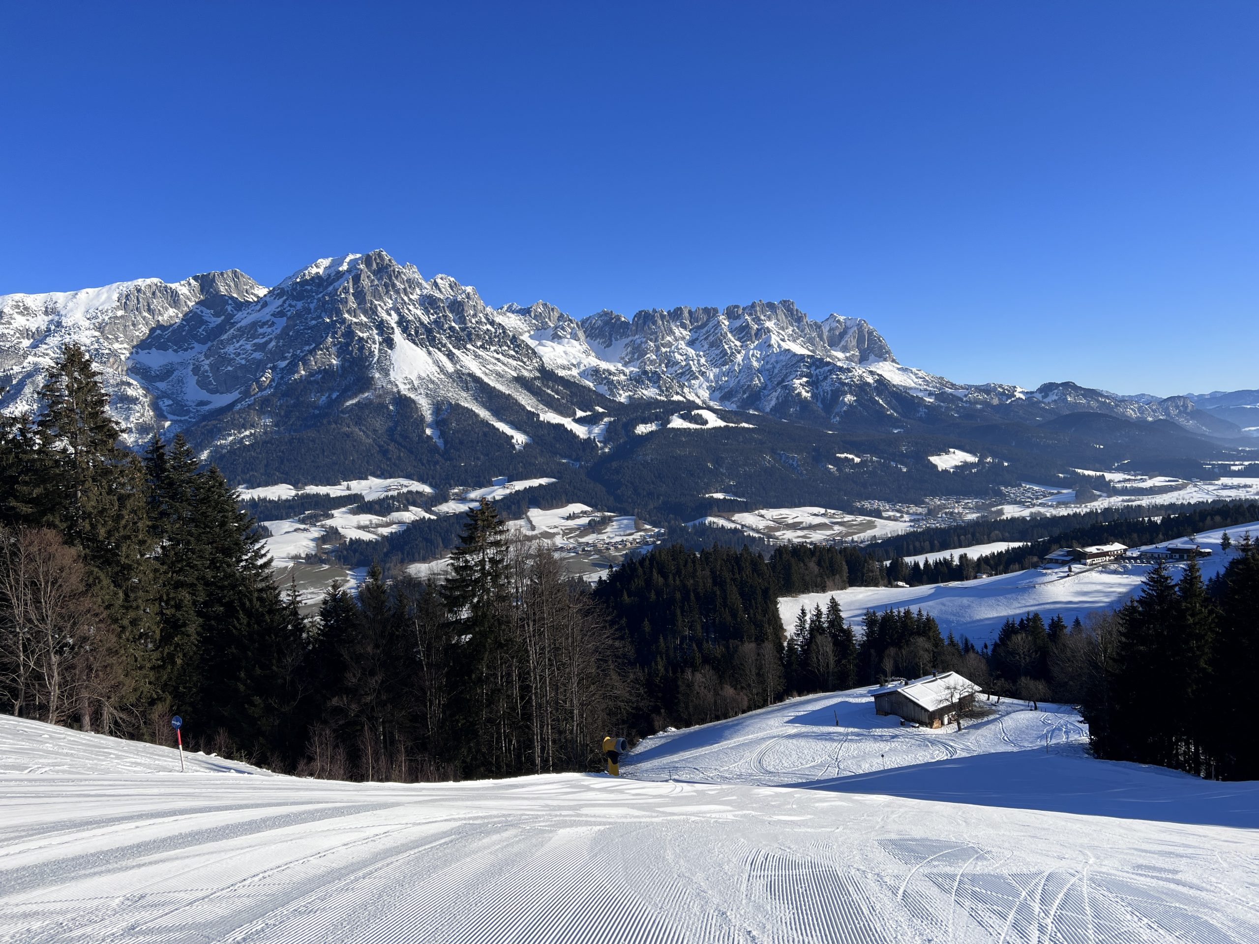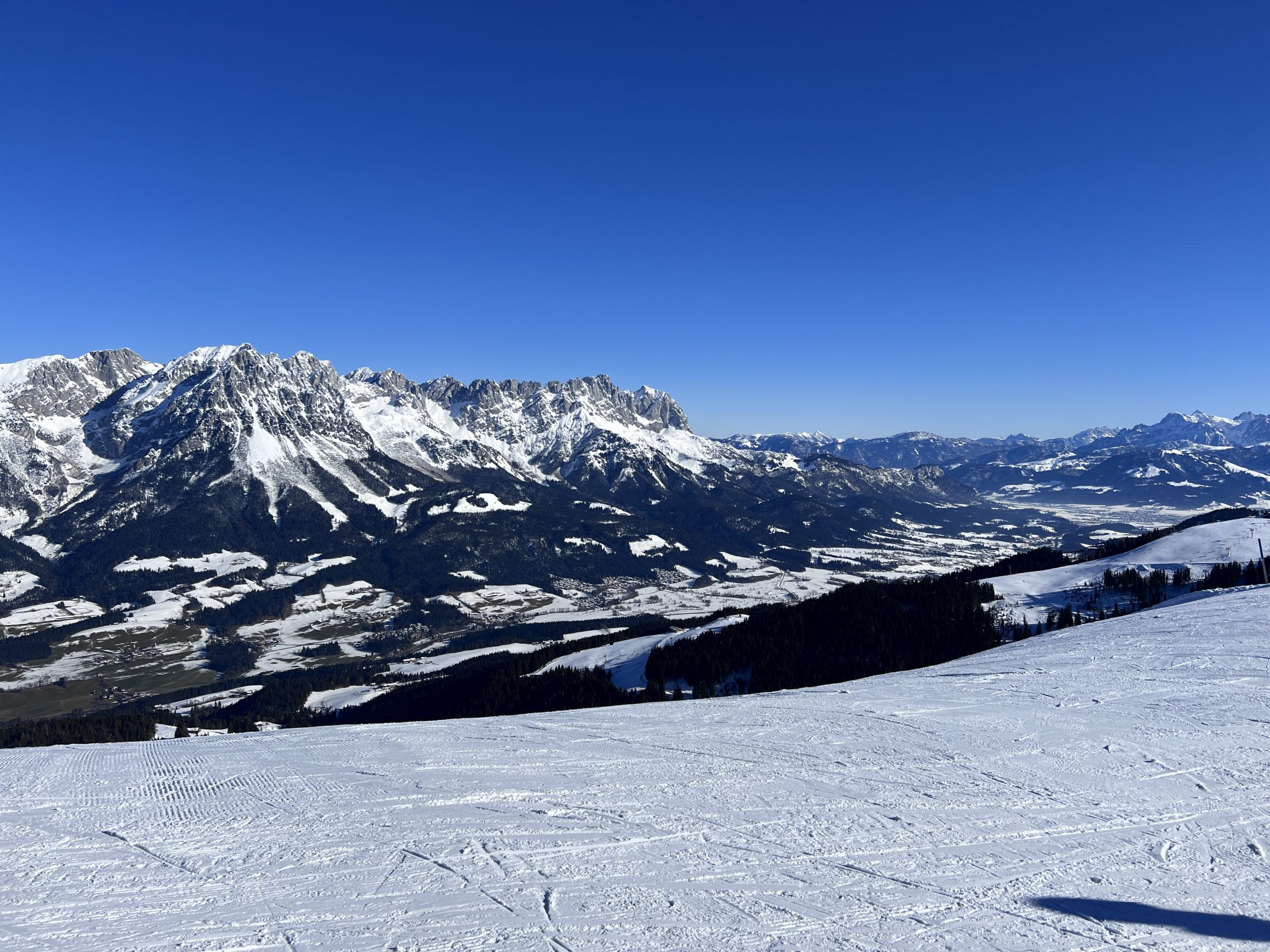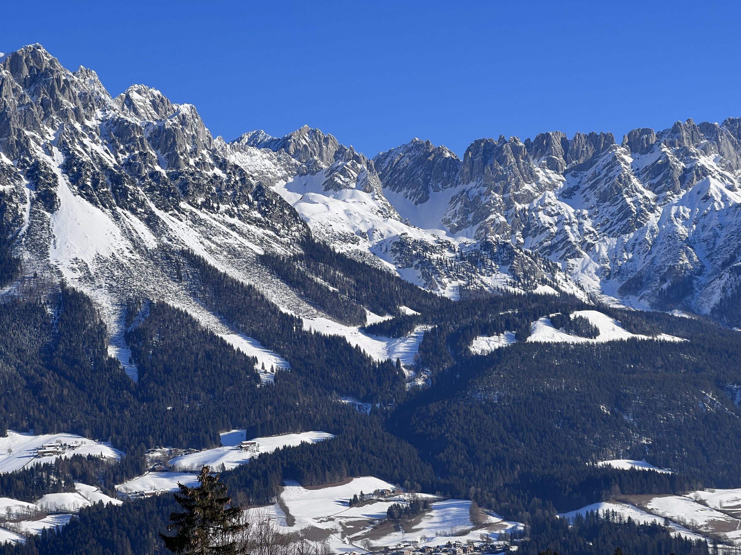 Wie immer bietet sich bei stahlblauem Himmel ein herrlicher Blick auf die Südflanken des Kaiser Gebirges