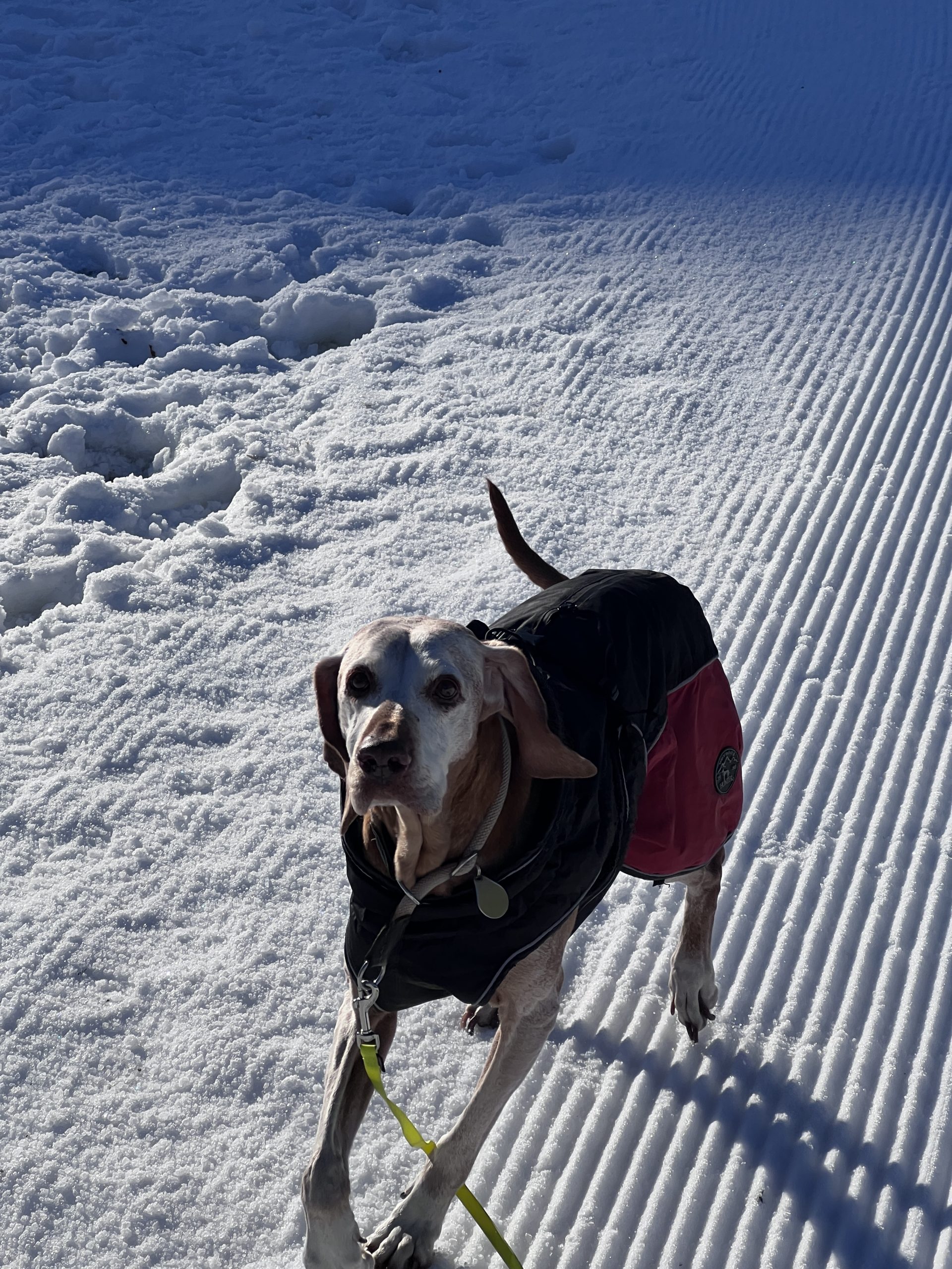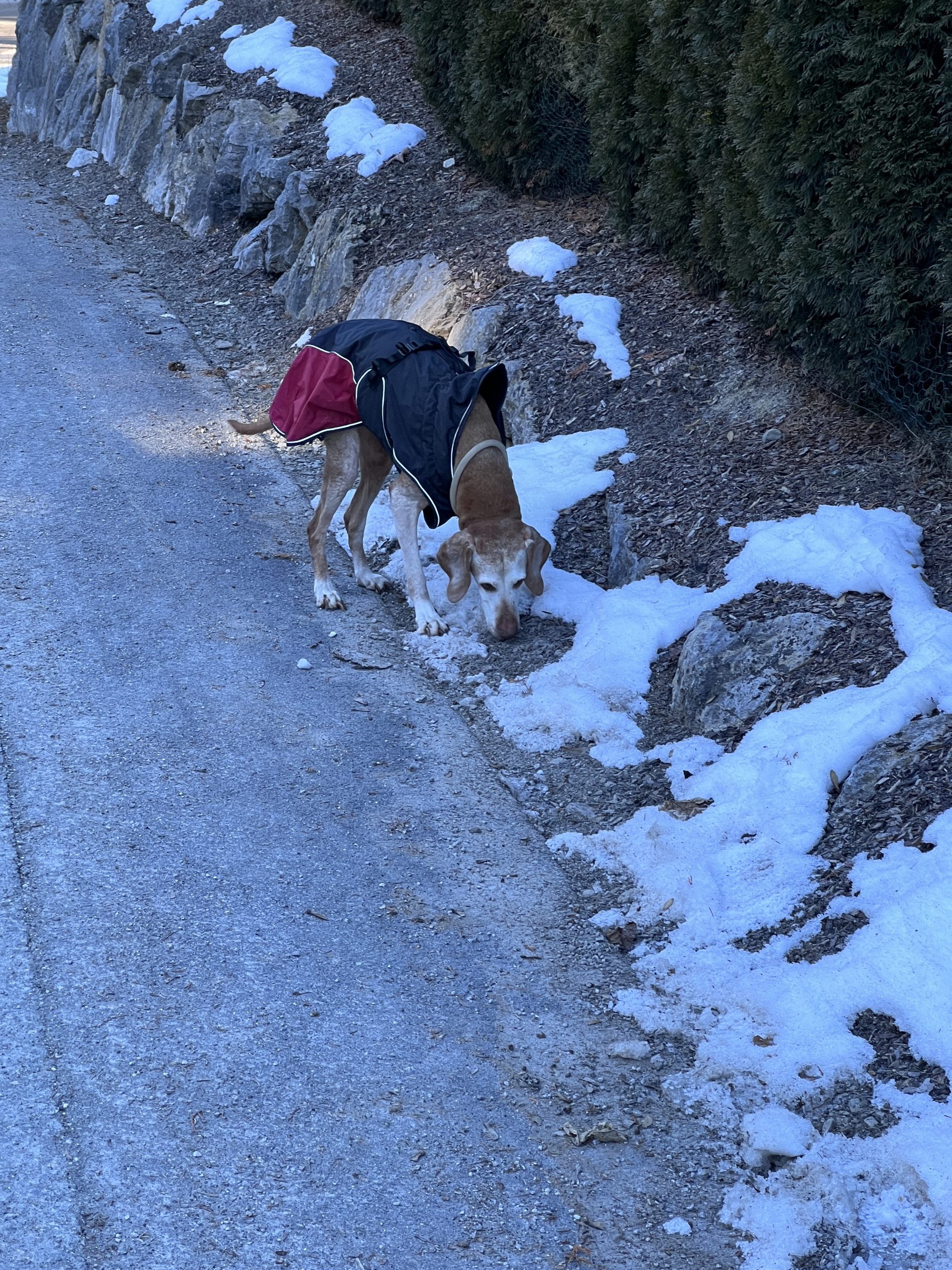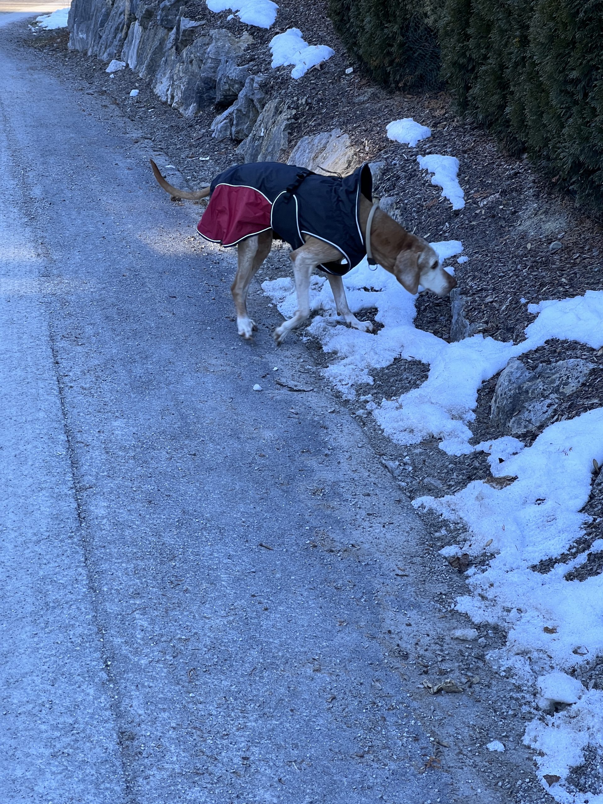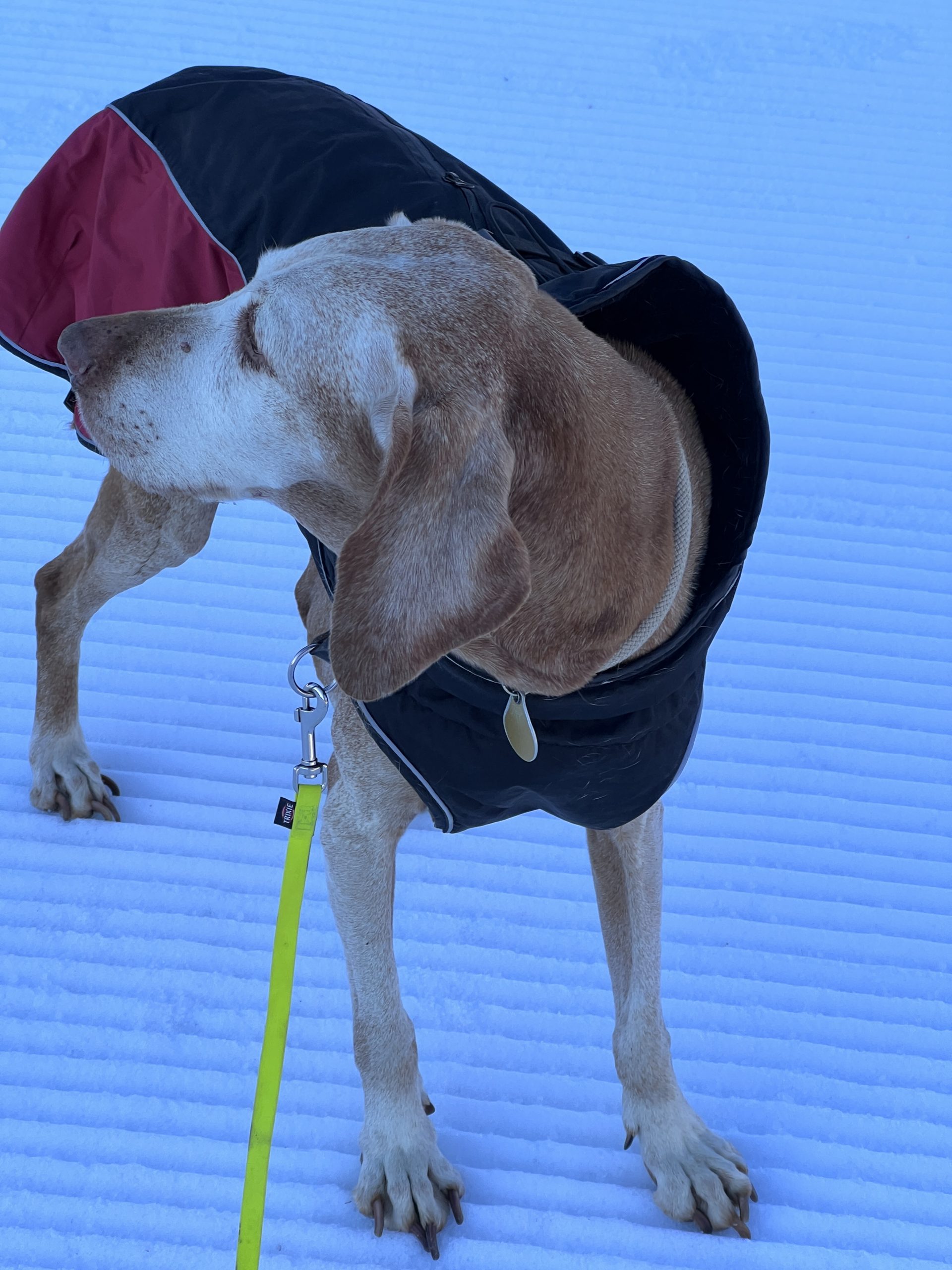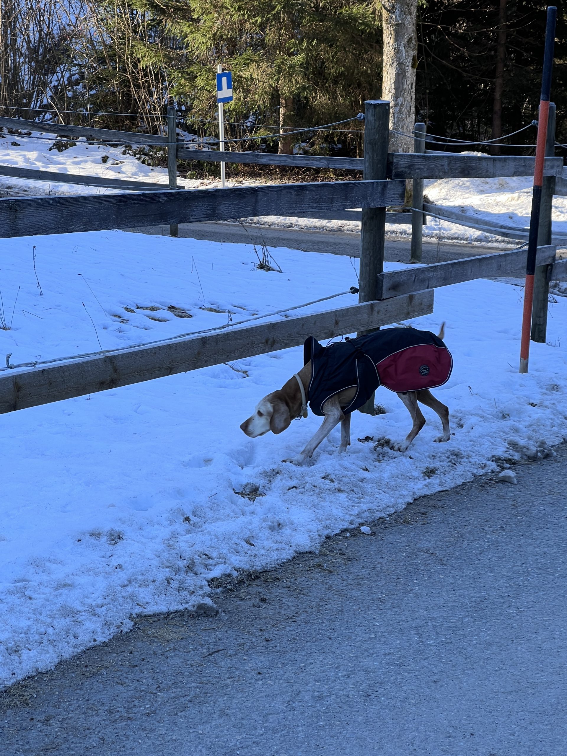 Bestens in ihr wärmendes Jäckchen verpackt schnüffelt sie jeder neuen Spur nach