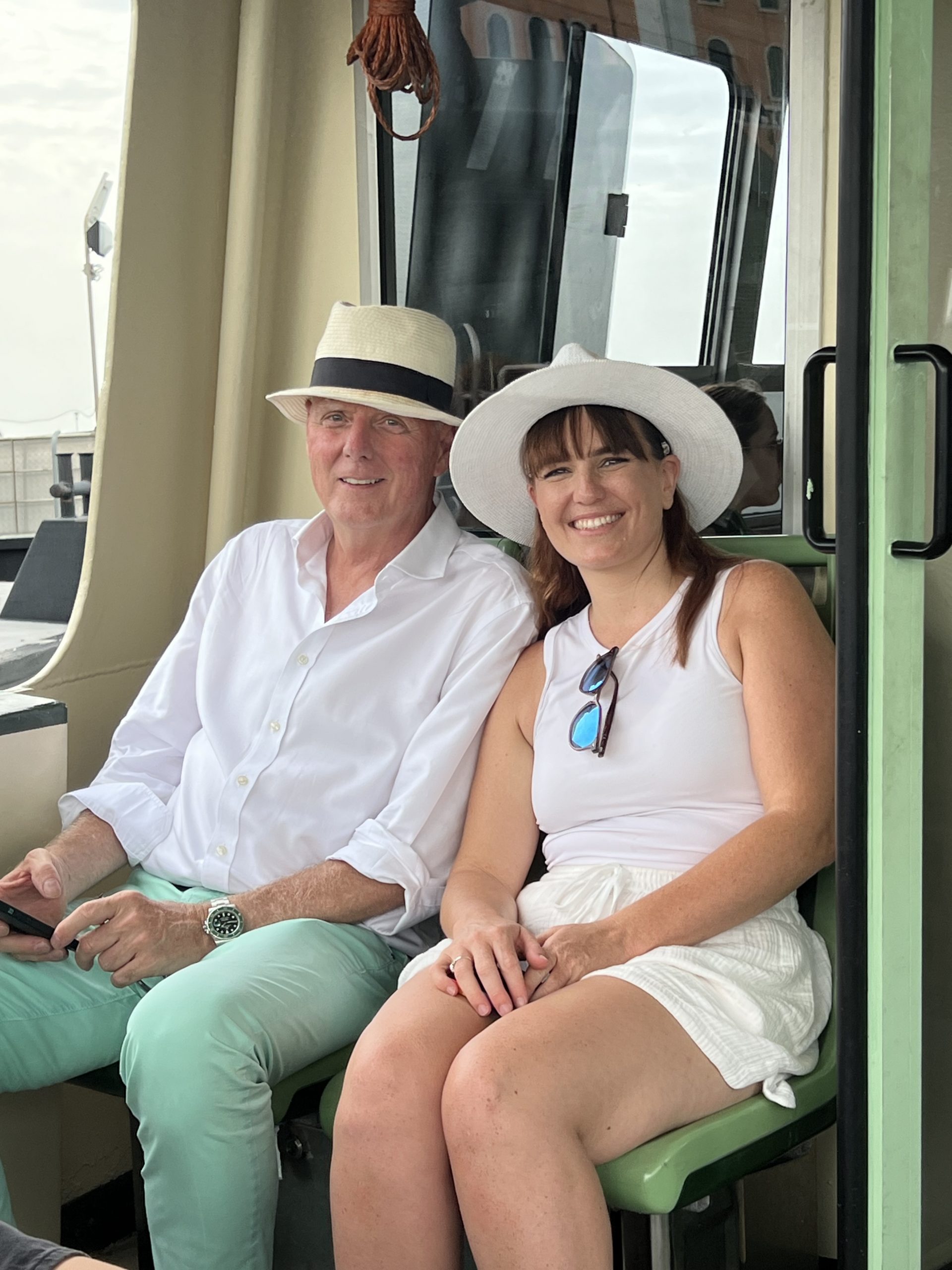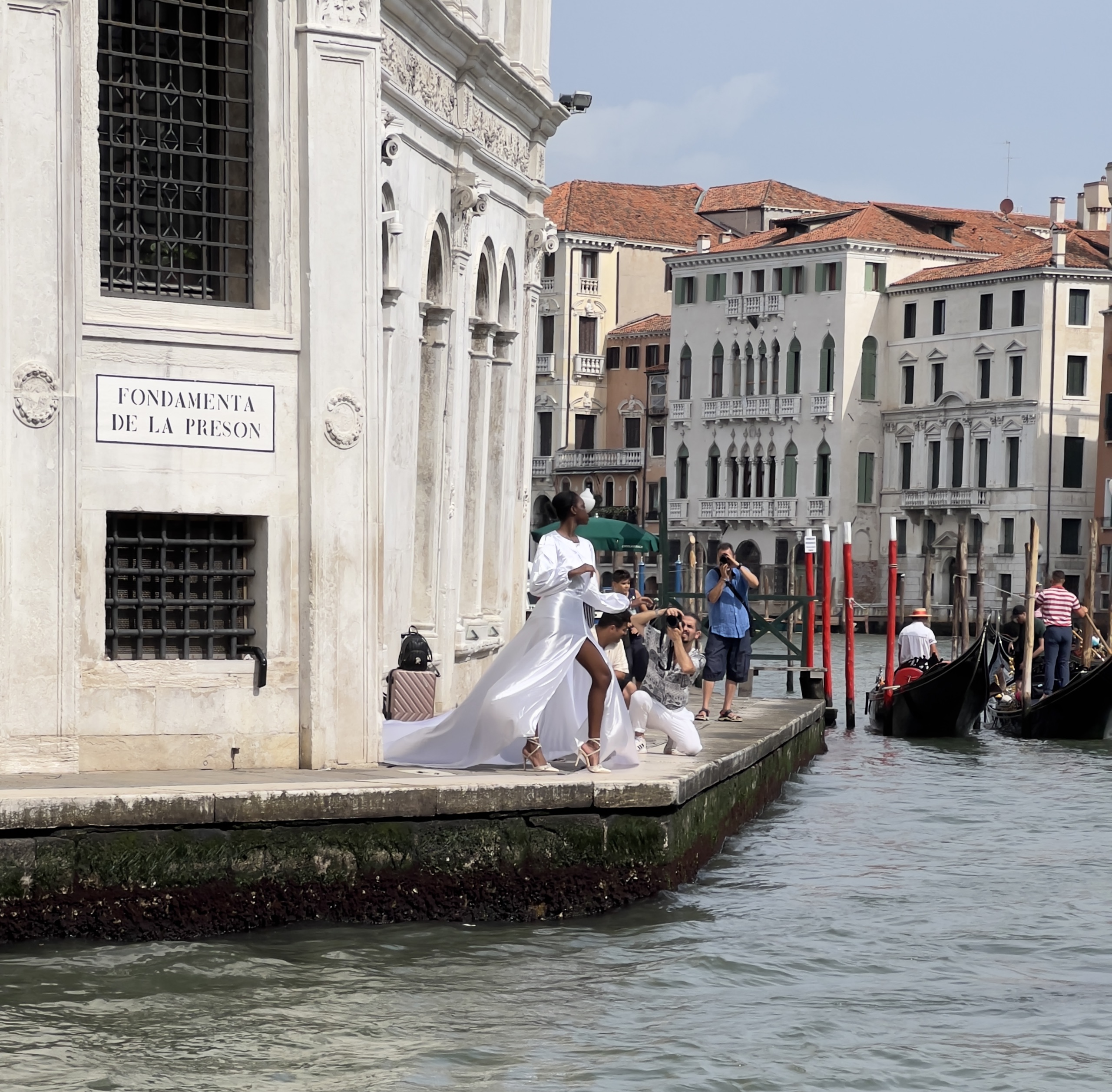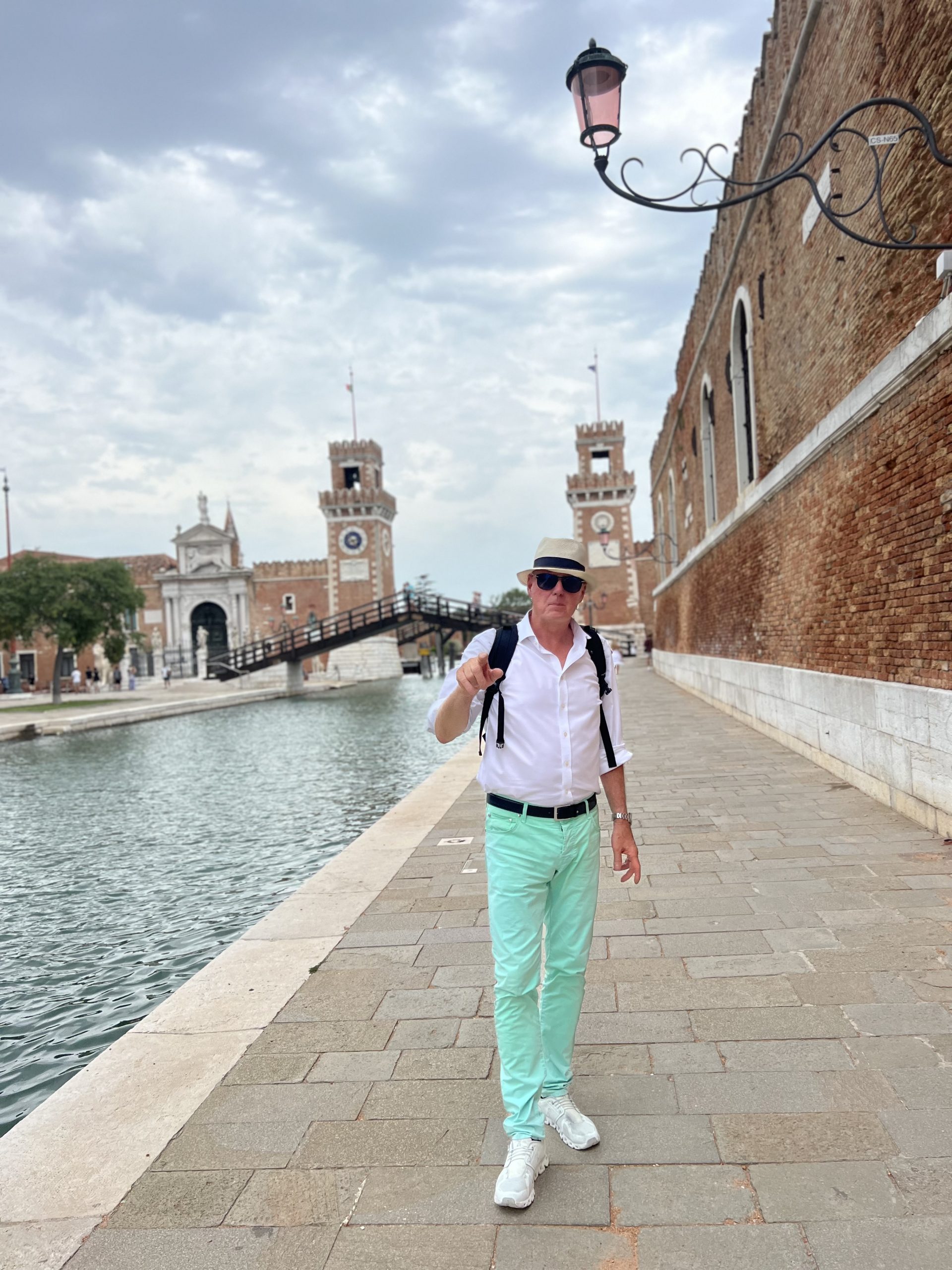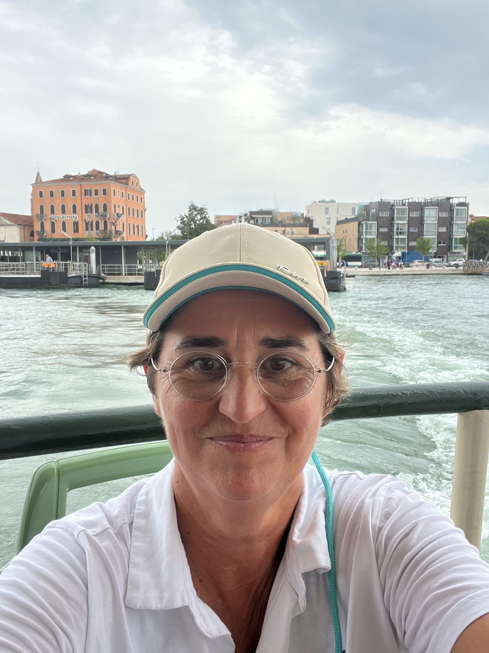 Cari und ich sind hier mit dem Boot auf dem Weg vom Lido di Venezia zur Biennale di Venezia unterwegs. Biennalen sind alle zwei Jahre stattfindende Ausstellungen, Festivals oder Schauen. Der Begriff ist vom Biennium abgeleitet, einem Begriff für den Zeitraum von zwei Jahren. Die ursprüngliche Biennale war die Idee eines Bürgermeisters von Venedig, der seit 1895 alle zwei Jahre eine Weltausstellung der Bildenden Kunst unter dem Titel La Biennale di Venezia veranstalten ließ. Für diese Weltschau wurden in einem Gartengelände noch heute bespielte Länderpavillons gebaut.