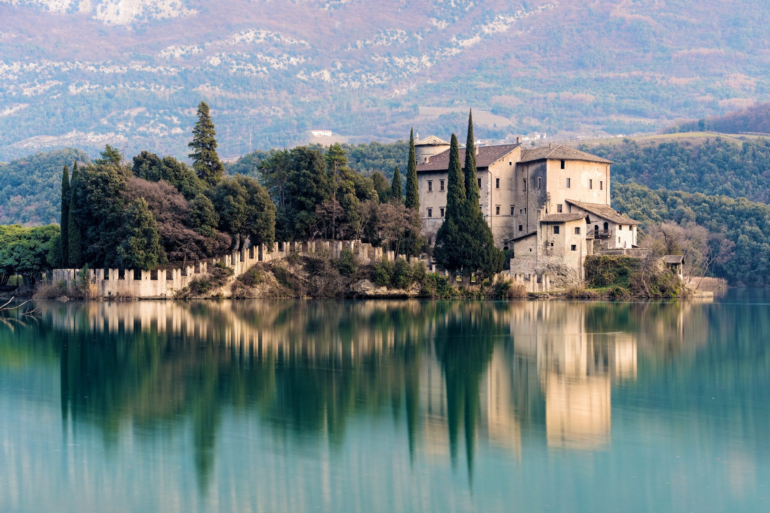 Der Lago di Toblino ist der romantischste See des Trentino, oft von Nebel umhüllt, von Schilf und Steineichen umgeben. Auf einem Felsvorsprung liegt das Castel Toblino, eine prächtige Burg aus dem 16. Jahrhundert, erbaut auf den Fundamenten eines antiken Tempels.