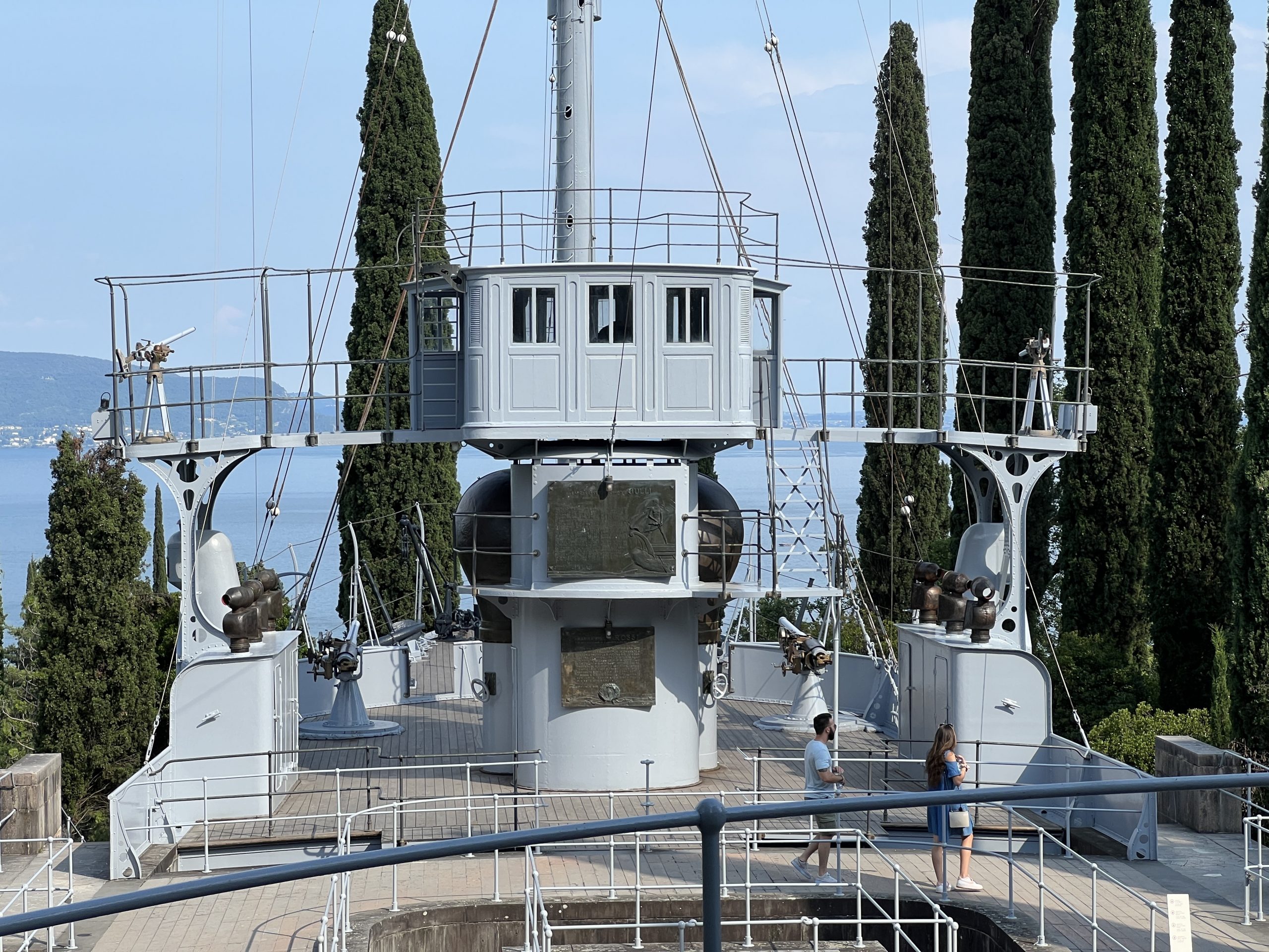 Vom Bug des Panzerkreuzers Puglia aus konnte ich während meines Besuchs unsere Freunde Heike und Charlie Hornberger beim Aufbauen ihrer großen Sonnenschirm auf ihrer Terrasse beobachten