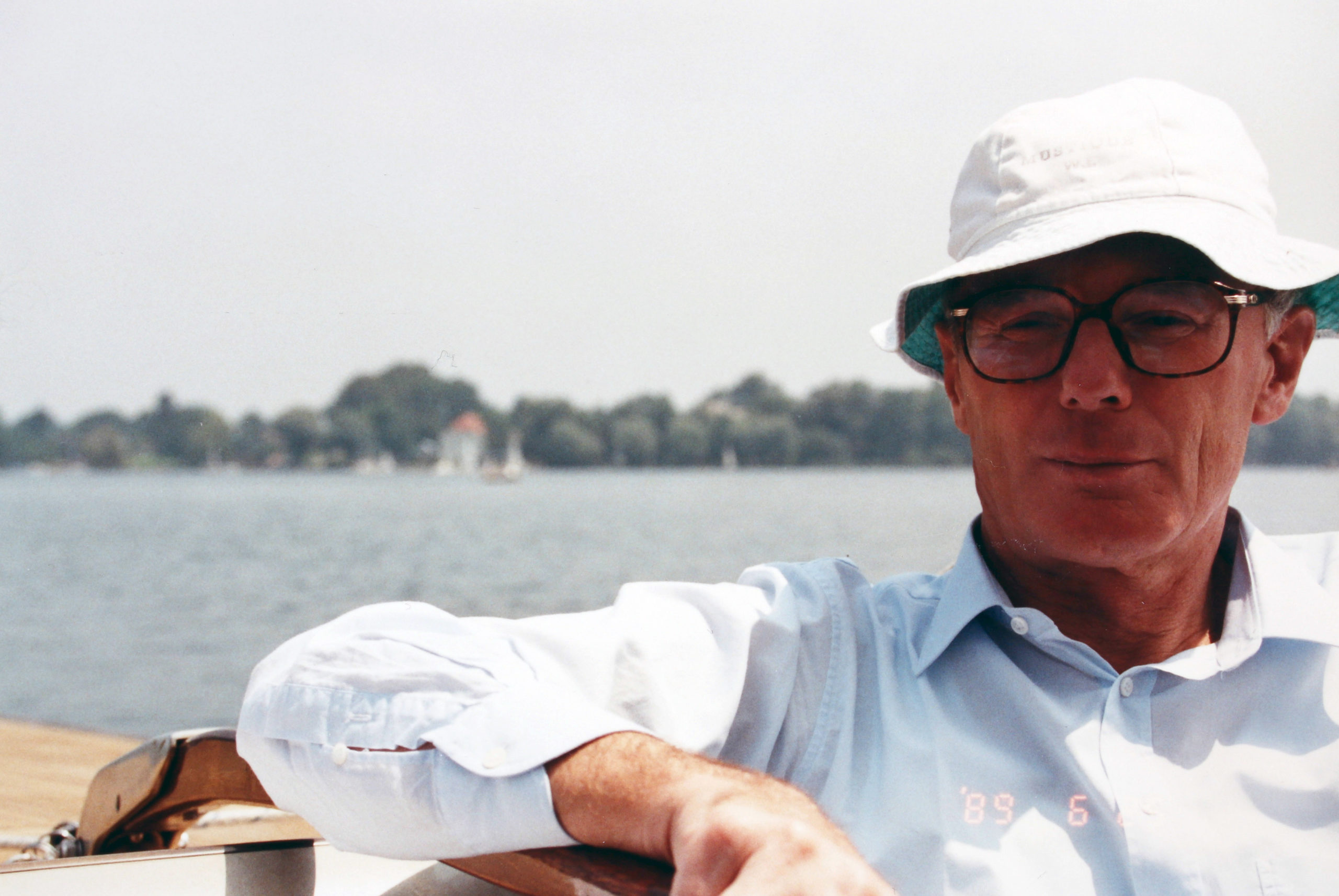 Vater Karl-Heinz immer durch einen Sonnenhut beschützt mit der Fraueninsel im Hintergrund