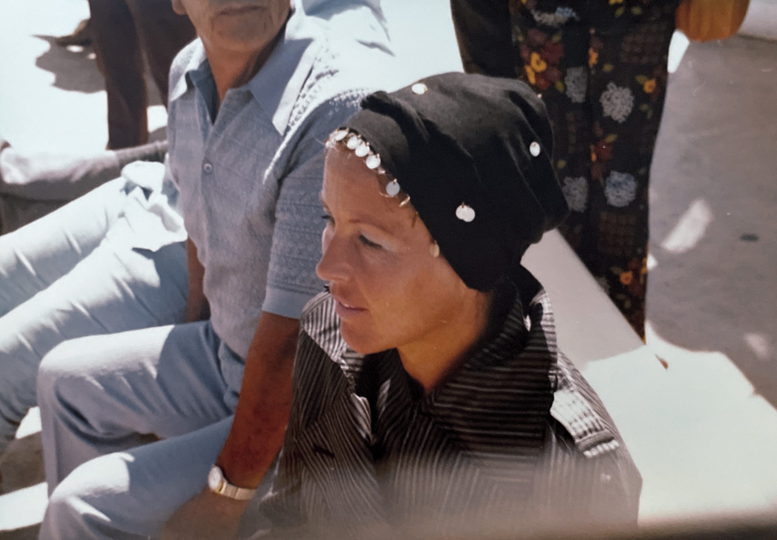 Unsere Mutter hat sich sehr elegant an die hier angesagte Hippiemode angepasst. Zwar keine Blumen im Haar, aber ihr Bandana mit Silberplättchen steht ihr hervorragend.