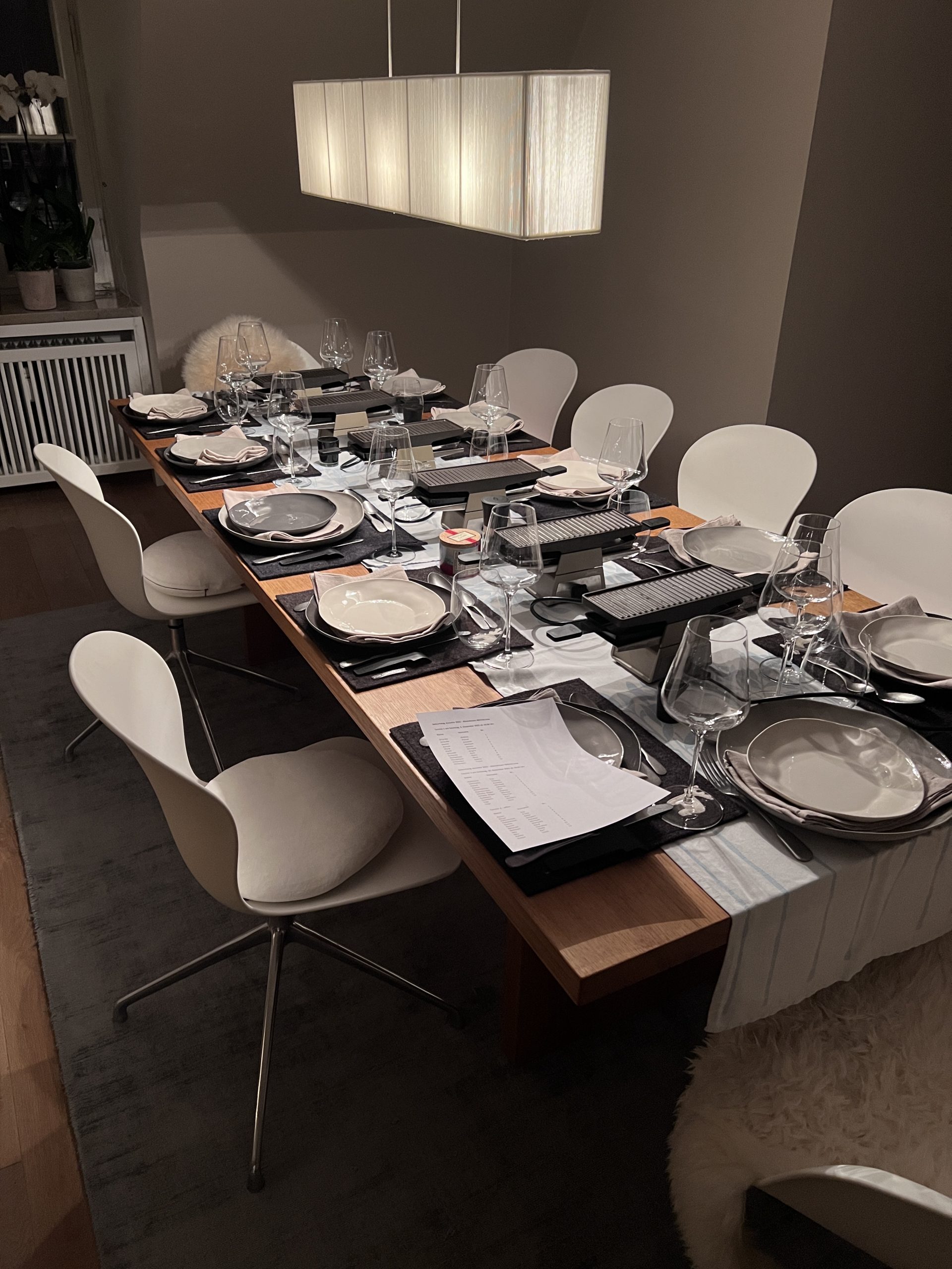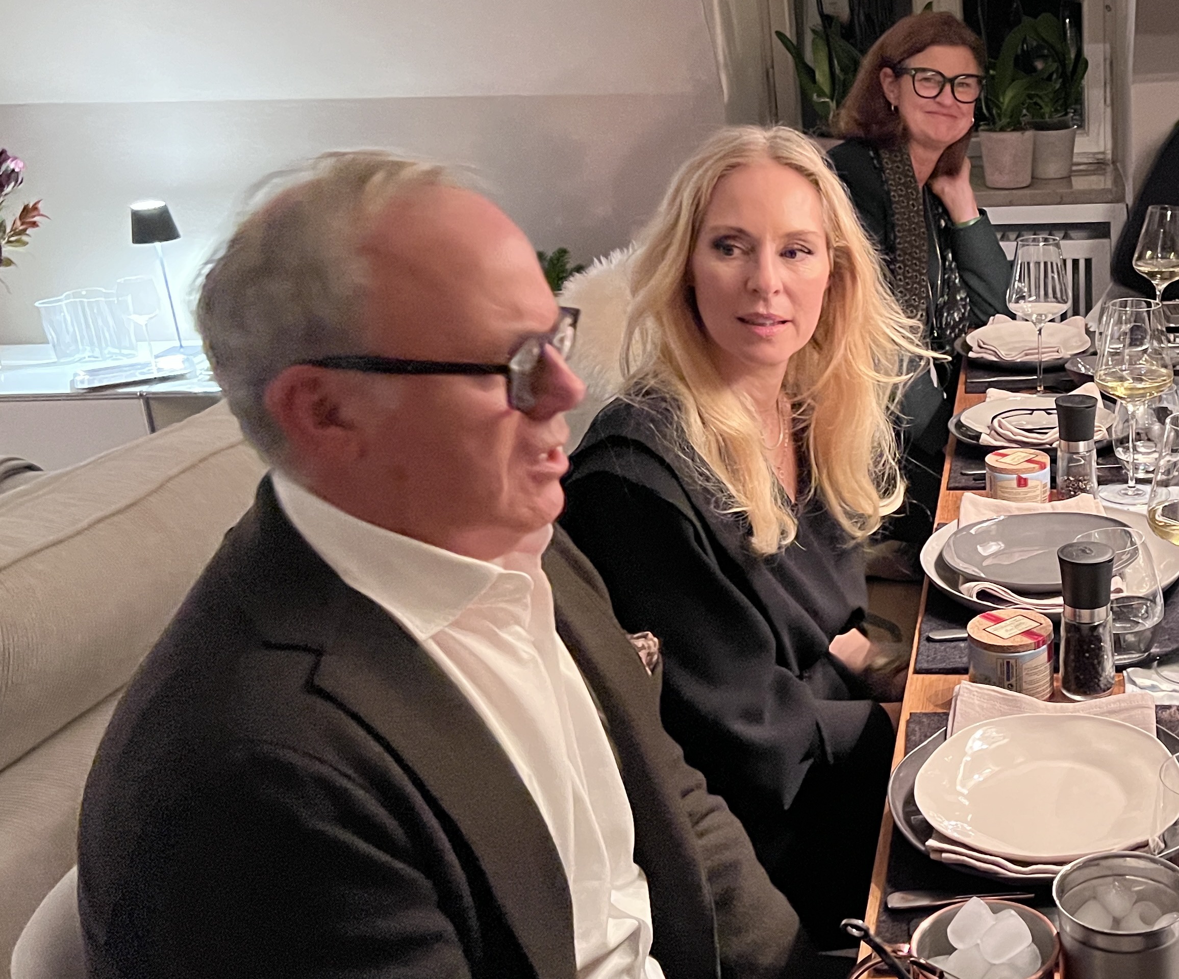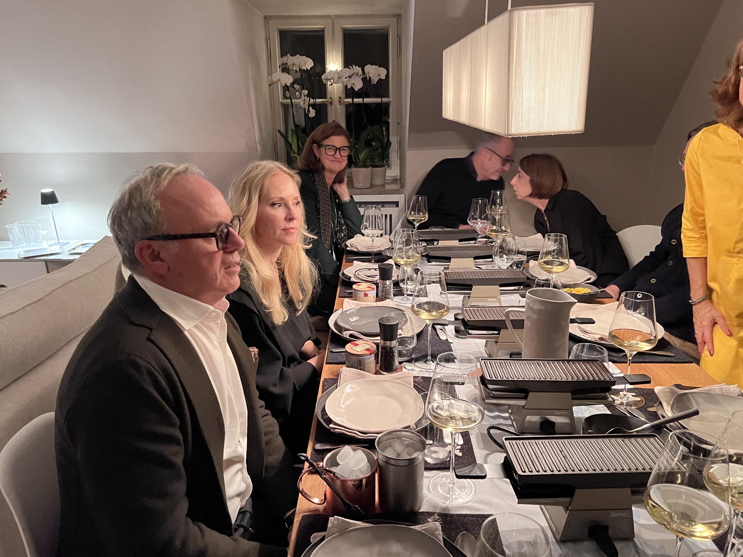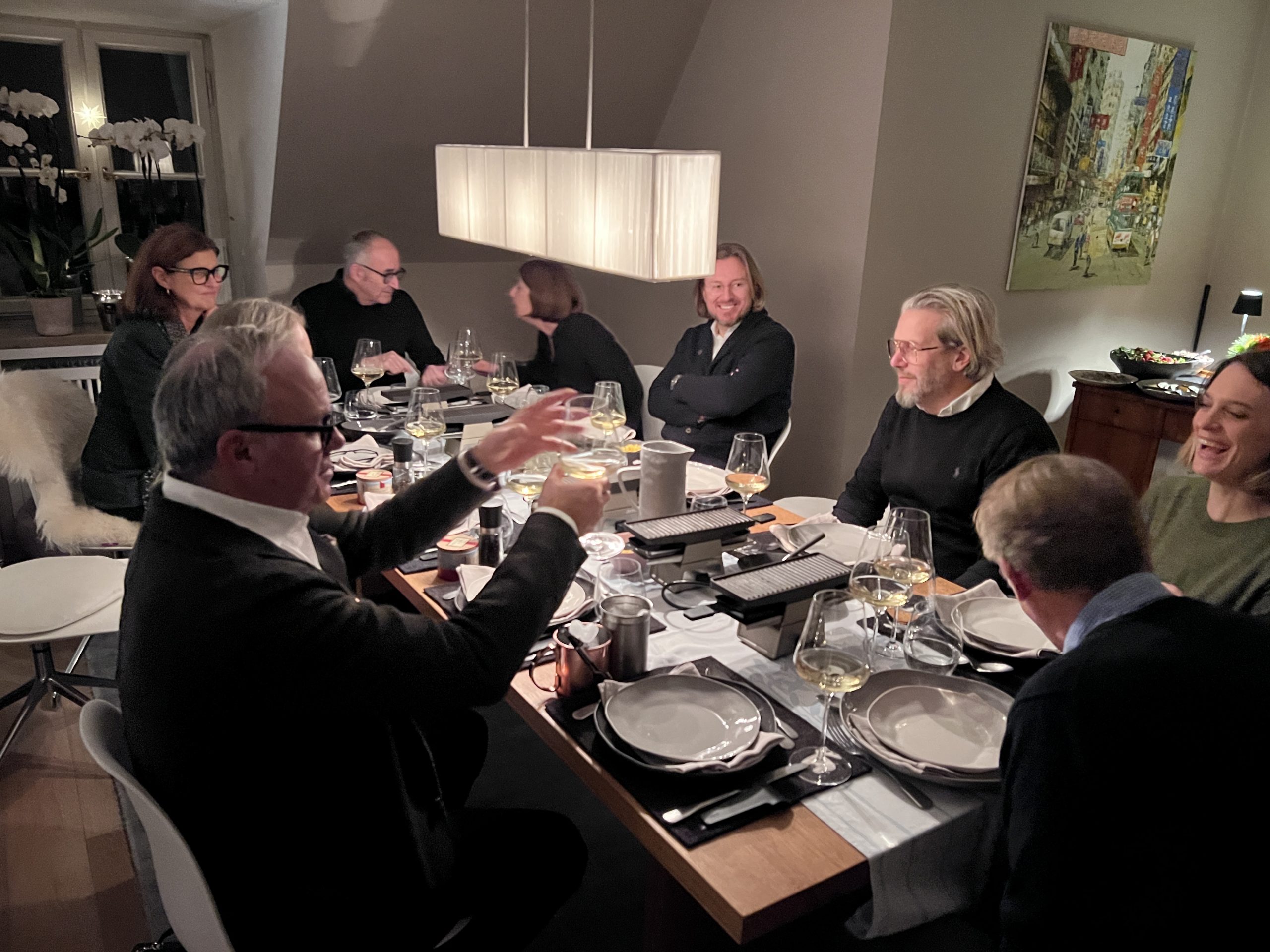 Bei Annettes Entscheidung welche netten Gäste Sie zu einem Abendessen anlässlich ihres Geburtstages einlädt hatte sie die Qual der Wahl. Bei 30 Freunden auf ihrer Liste und einer Maximalkapazität von zehn Gästen sowie zwei Gastgebern, die an unserem 12 Personen Esstisch in der Möhlstrasse Platz zum Essen haben, mussten insgesamt drei Events geplant werden. Beim ersten Essen am Geburtstagsabend selbst gab es Raclette. Raclette ist dabei sowohl der Name eines beliebten Kuhmilchkäses als auch der Name des von uns genossenen warmen Gerichts, das wie das Käsefondue durch langsames Schmelzen von Käse entsteht. Der Name Raclette stammt vom französischen Walliserdialektwort racler, das schaben heisst, da die an der Feuerglut gegrillte und geräucherte obere Schicht des halben Käselaibs mit einem Messer auf einen Teller oder ein Stück Brot abgeschabt wurde. Mit ihm wurde ab 1874 im Schweizer Kanton Wallis offiziell der entsprechende Käse benannt. Im Jahr 1909 wurde Raclette als nationales Walliser Gericht einer erweiterten Öffentlichkeit bekannt. Die Bezeichnung Raclette für sich ist nicht geschützt, deshalb wird der Käse heute über die Walliser Kantonsgrenzen hinaus auch in Teilen der übrigen Schweiz, Frankreichs, Österreichs, Deutschlands, Finnlands und der Vereinigten Staaten hergestellt. Von den über 14.000 Tonnen Raclette, die heutzutage in der Schweiz pro Jahr hergestellt werden, kommen rund 2.000 Tonnen aus dem Kanton Wallis. Annette und ich nutzen übrigens seit Jahren das Raclette Equipment der Schweizer Firma Spring, die sehr professionelle Geräte produzieren. Goldgelb schmilzt der Käse im Pfännchen, Kartoffeln und Mixed Pickles stehen bereit. Die zünftige Mahlzeit verbindet Gaumenfreuden mit Geselligkeit. Als Unternehmen mit Schweizer Wurzeln und Spezialist für das Kochen am Tisch bietet Spring Ihnen alles für ein gemütliches Raclette-Essen. Jeder füllt sein Pfännchen und schaut, was der Nachbar macht. Die Raclettes sind in verschiedenen Größen erhältlich, eine Alu-Grillplatte oder ein heißer Stein erweitern die Möglichkeiten. Die Geräte sind sicher und einfach in der Bedienung sowie leicht zu reinigen. Gute Gründe, das Raclette häufiger herauszuholen. Das werden wir dann auch sicher noch zwei weitere Male machen, denn der gemeinsame Abend war sehr nett und extrem unterhaltsam und Andrea und Pascal waren am längsten da.