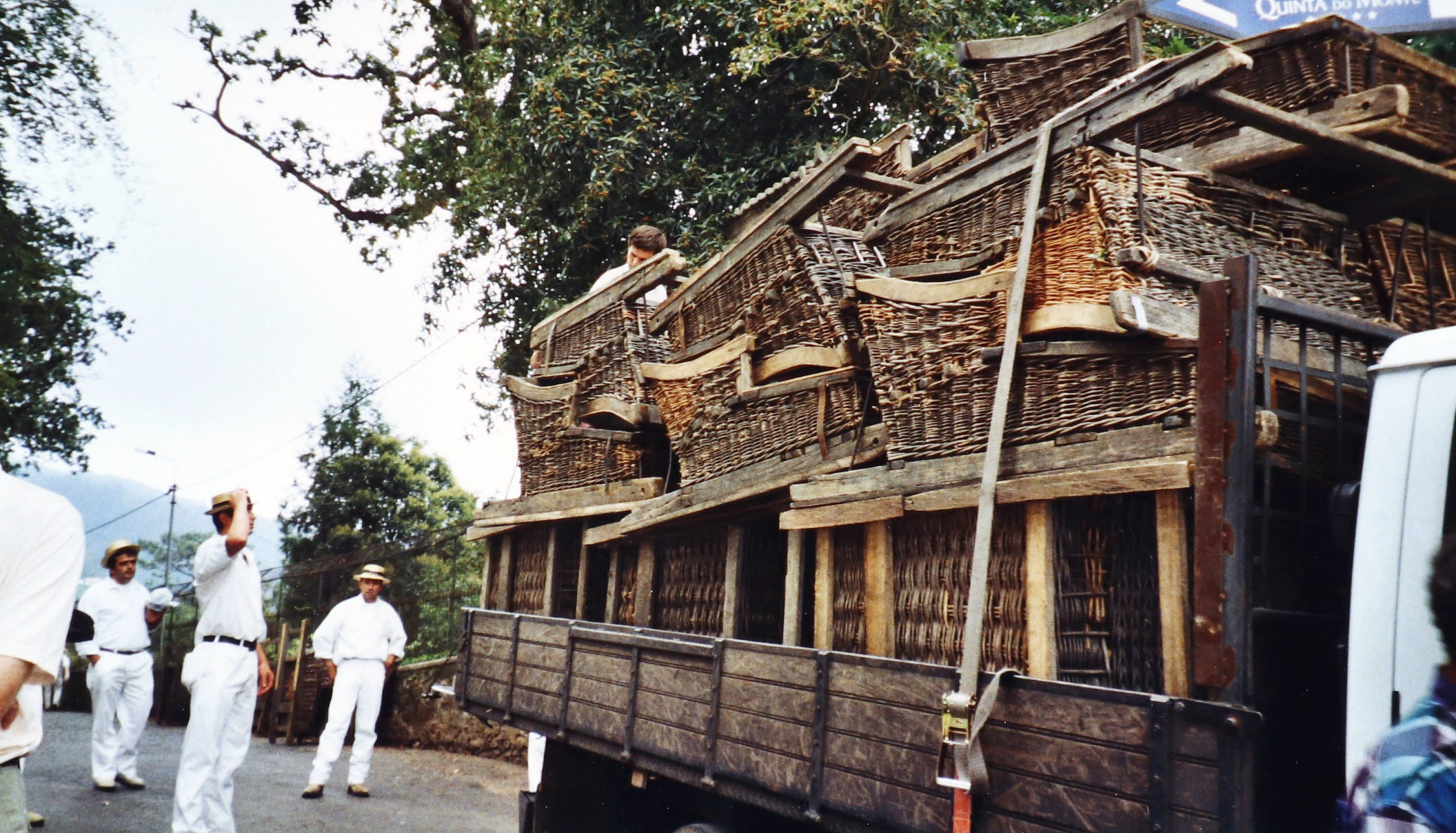 Die Lenker der Korbschlitten - wie auch die Schlitten selbst - müssen für die Talfahrt alle wieder hoch auf den Berg. Die Schlitten reisen auf LKWs, auf die auch die Lenker springen. Am Ziel unten wird alles sofort wieder verzurrt und aufgeladen und dann wieder nach oben gefahren und dort abgeladen.
