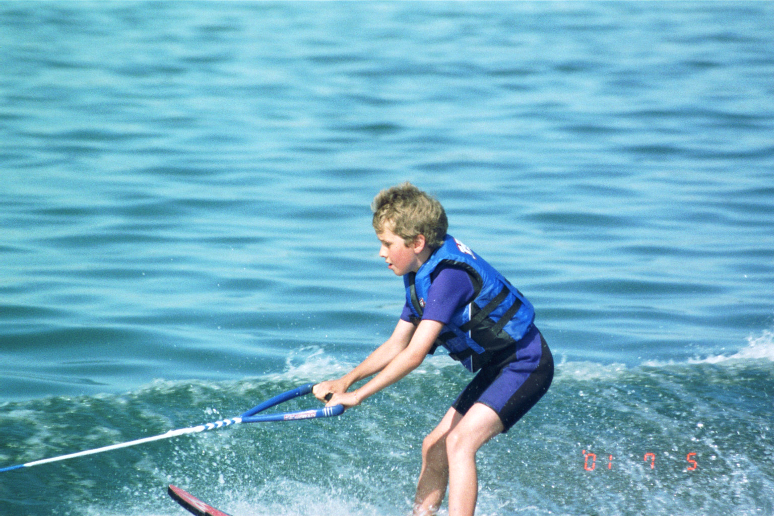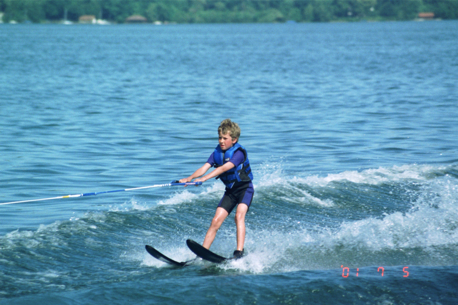 Mit Paul auf dem Boesch Boot am Starnbergersee; im Jahr 1990 habe ich Theo Freundorfer sein Wasserskiboot der Marke Boesch 580 Acapulco de Luxe abgekauft und danach zunächst mit einer Firmenlizenz auf Namen der Firma North Sails und später auf meinen privaten Namen genutzt. Unzählige Tage haben wir dadurch auf dem Wasser gebracht, habe Freunde besucht und sind in Lokale zum Essen gefahren. besonders gerne waren wir auch immer wieder beim Wasserskifahren, wie hier im Sommer 1997, als Paul noch ein kleiner Junge war. Achtung ändern: Müsste das laut Photo im Juli 2001 gewesen sein ...