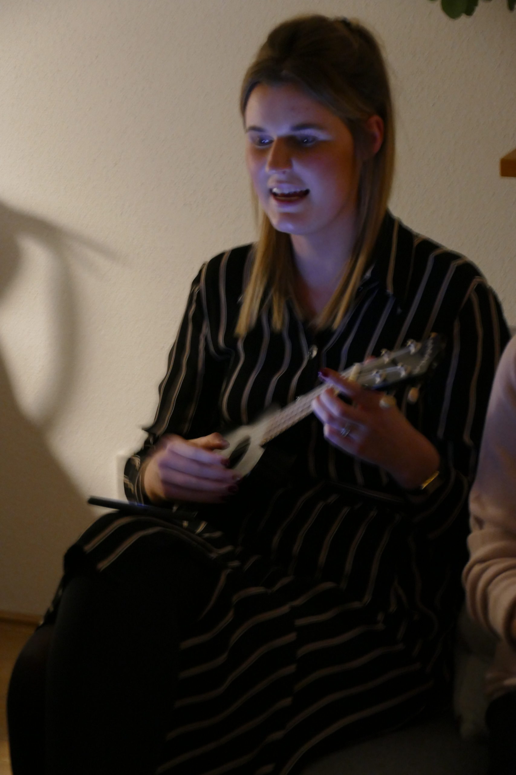 Beim Spiel der musikalischen Lehrerin Anna-Lena mit ihrer Ukulele strahlt der herrlich geschmückte Weihnachtsbaum noch heller