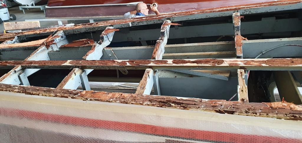 Upside Down und Tabula Rasa - das Boot wird komplett zerlegt und anschliessend auf den Kopf gedreht, damit das gesamte Unterwasserschiff besser ausgetauscht werden kann