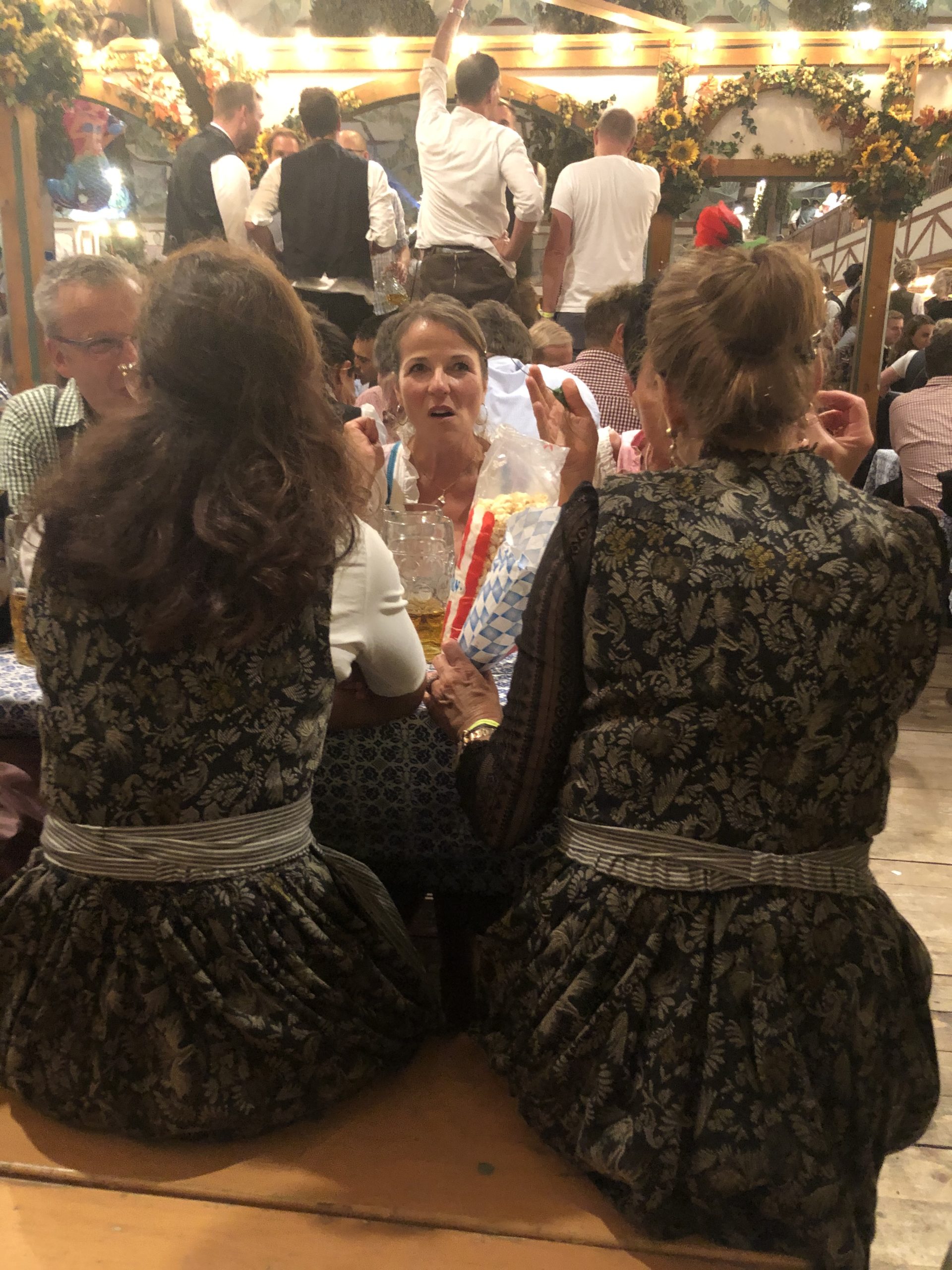 Gemeinsam mit Jürgen Groth, meinem Gründungspartner der Firma Antevorte, lud ich Ende September zwei Geschäftspartner, die zu engen Freunden wurden, zum Besuch des Oktoberfests 2019 ins Hofbräu Wiesn Festzelt nach München ein. Natürlich waren wir alle in Tracht unterwegs - zwei unserer Damen allerdings ohne vorherige Absprache im selben Outfit - und genossen den lustigen gemeinsamen Abend. Die Hausbox des riesigen Hofbräu Festzelts war in diesem Jahr als Folge unseres engen nachbarschaftlichen Kontakts mit Mika Petersenn und dem damit ermöglichten direkten Zugang zur "Wiesnzelt Reservierung" mehrfach Anlaufstelle für unsere Besuche auf dem Oktoberfest. Es hat extrem viel Spaß gemacht und wir waren als Tänzer und Sänger ein Hingucker in unserer Zeltecke.
