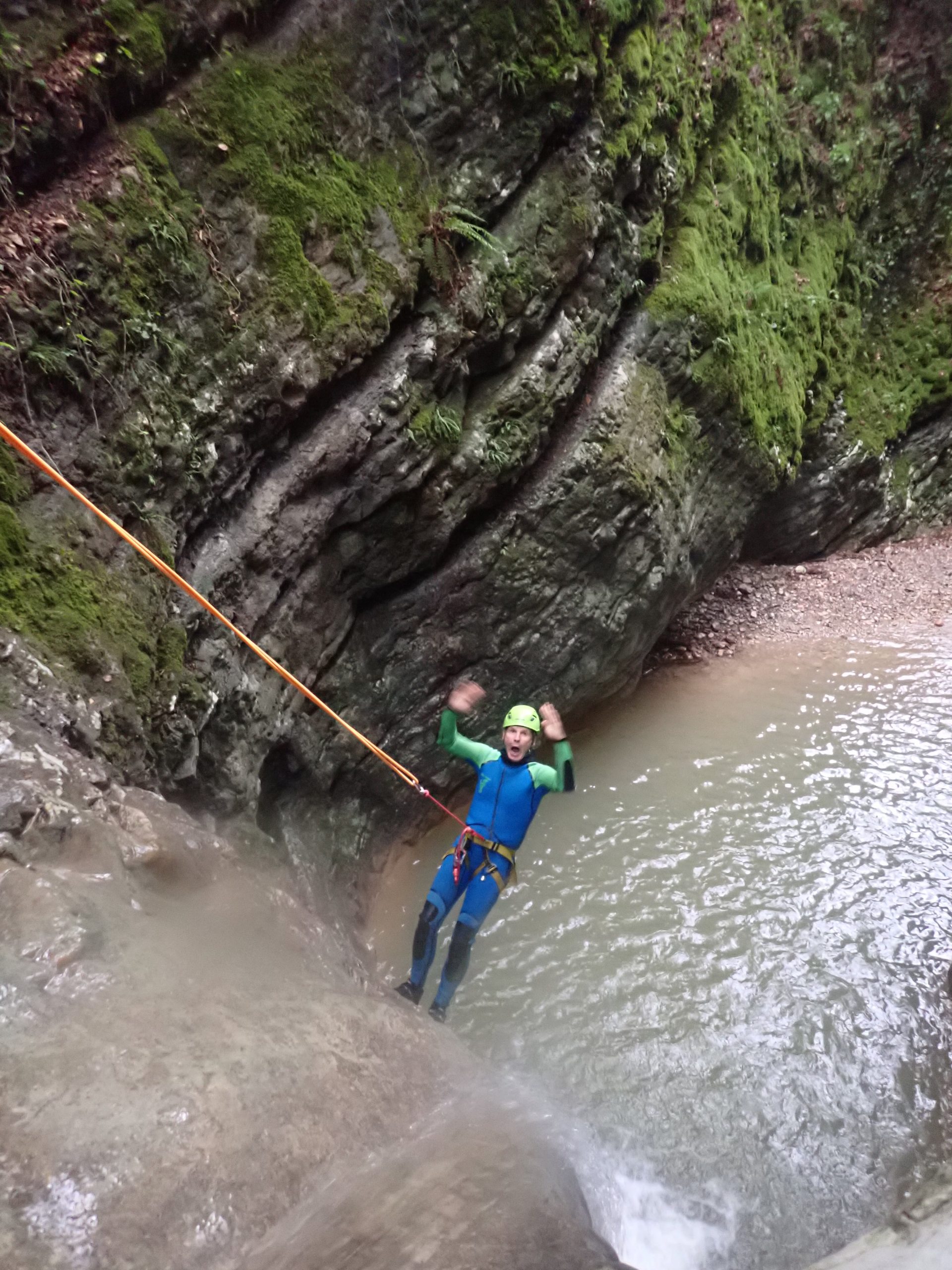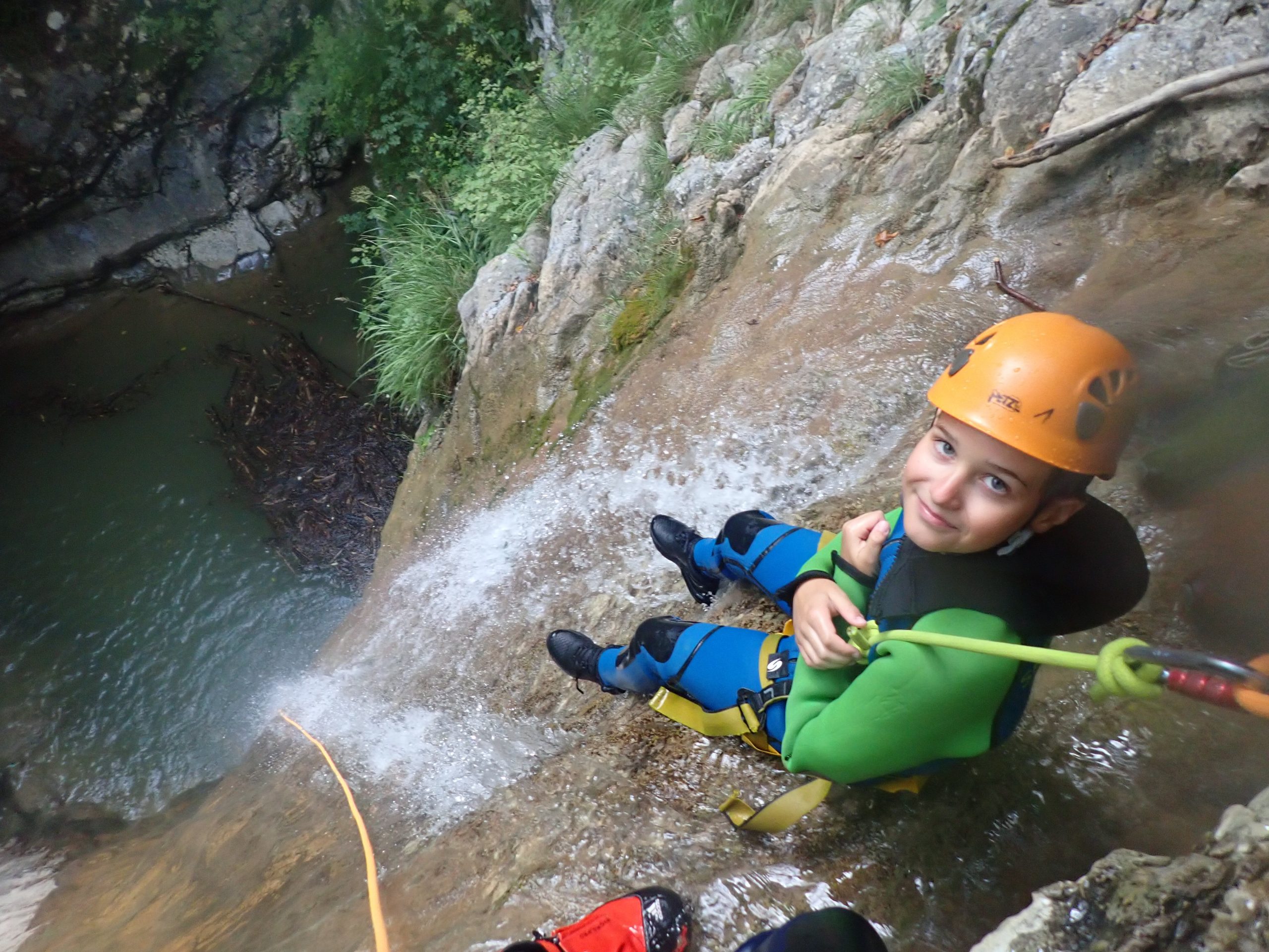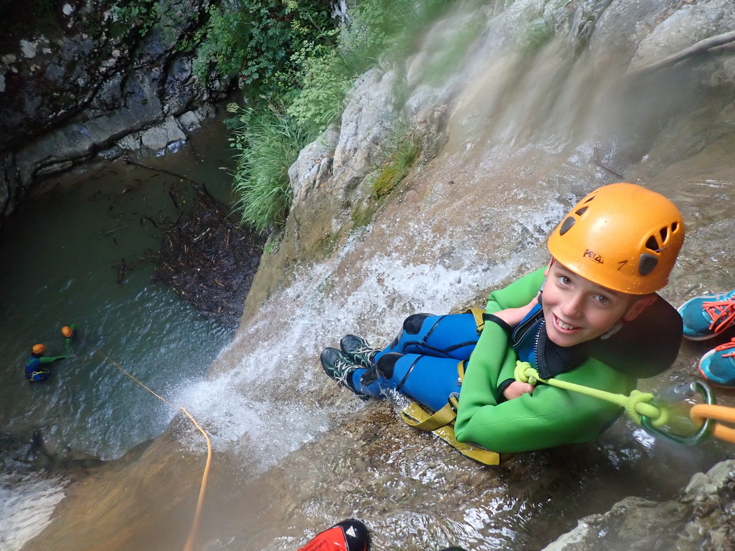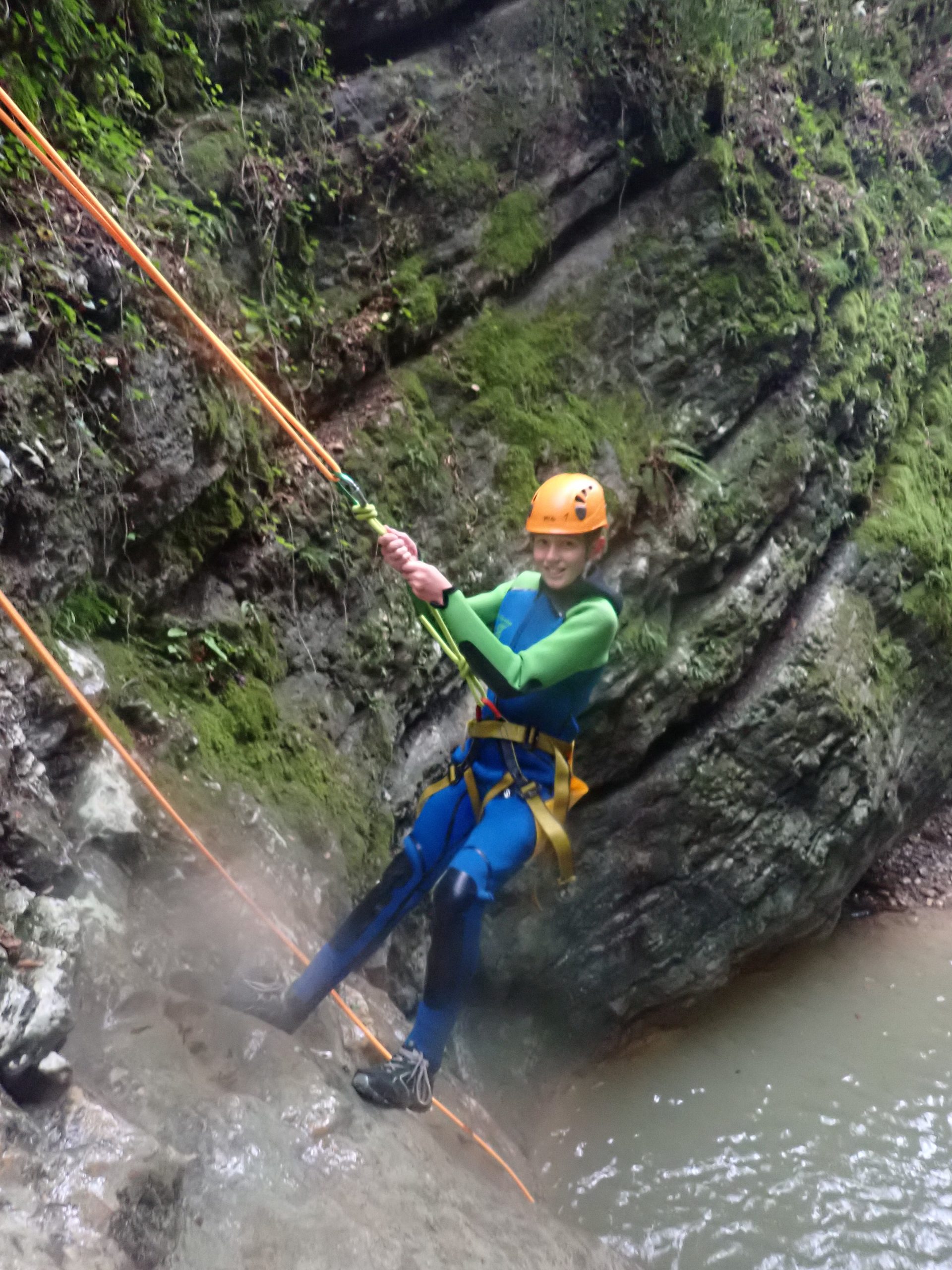 Justus, Hugo und Henri im nächsten langen und steilen Abseiler mit finalem Abgang per Rutscher in die tiefe Gumpe
