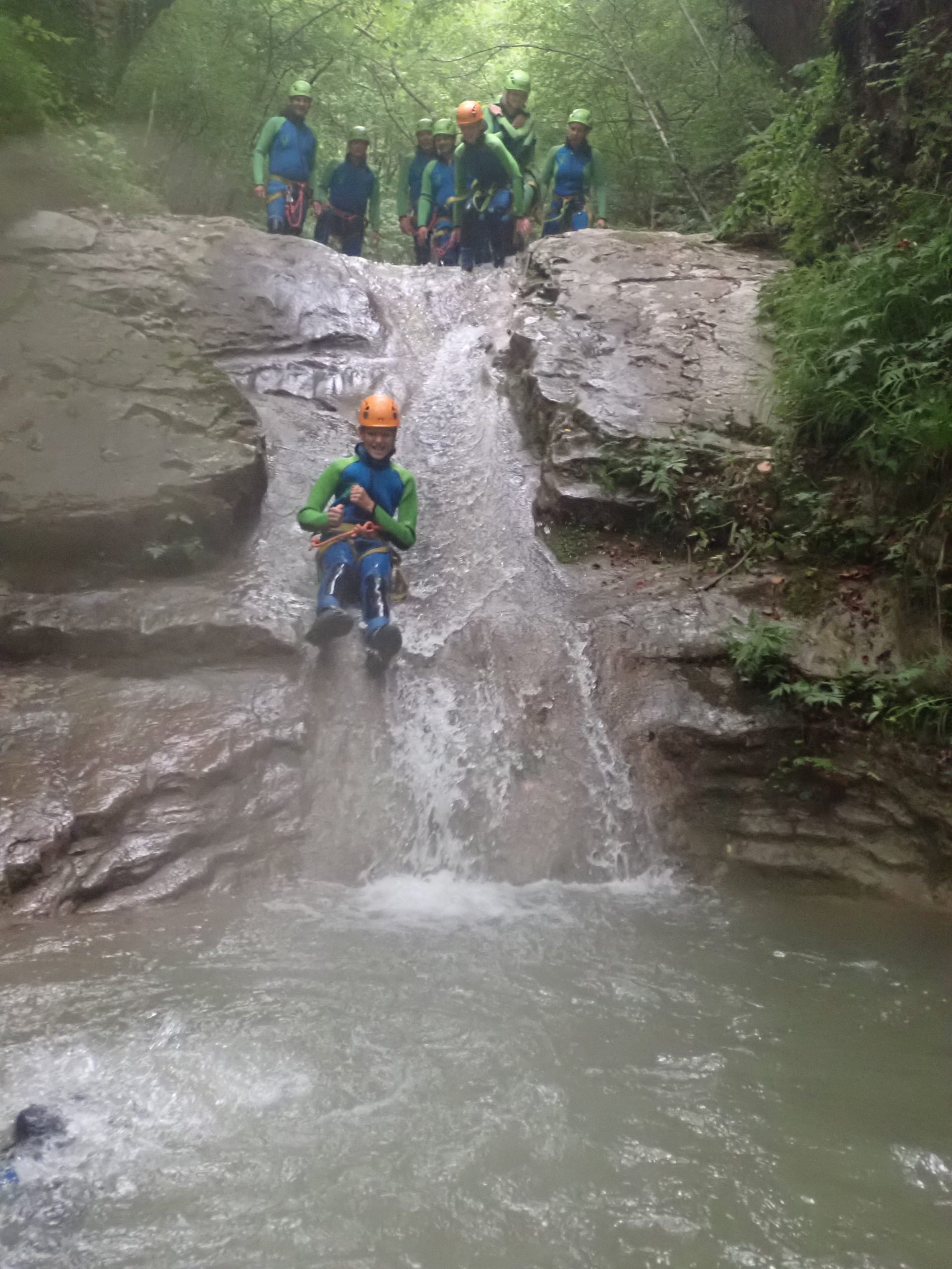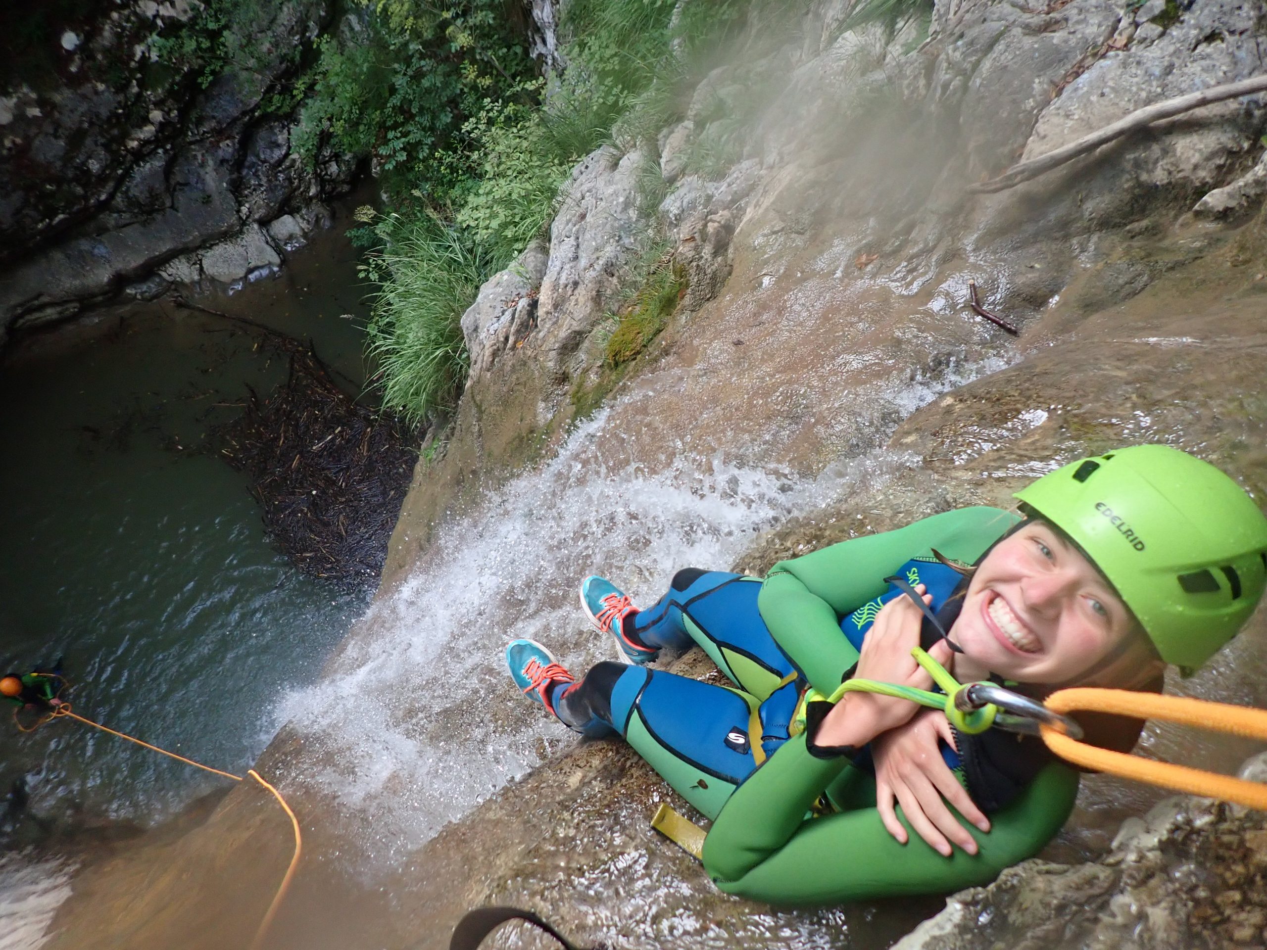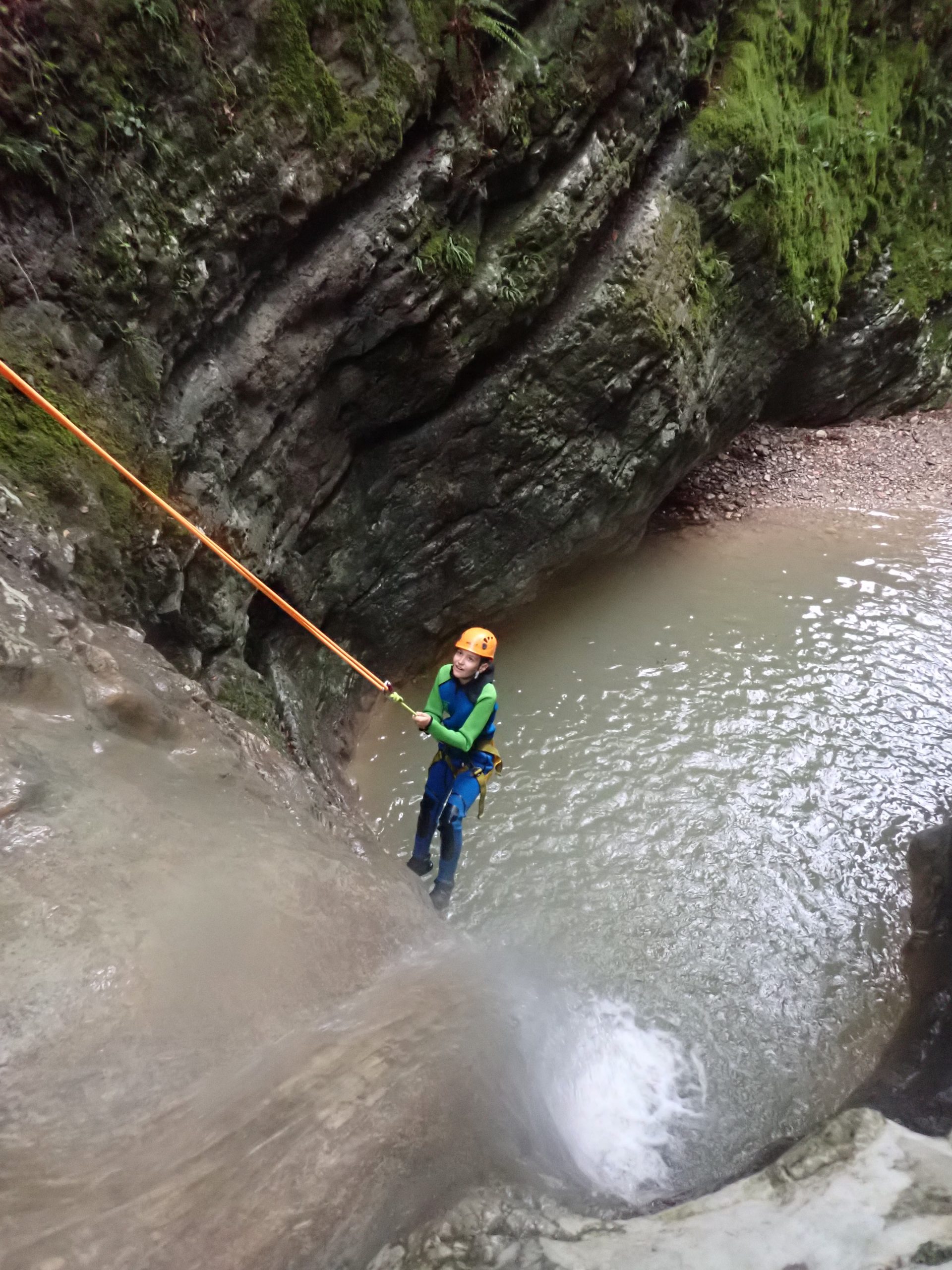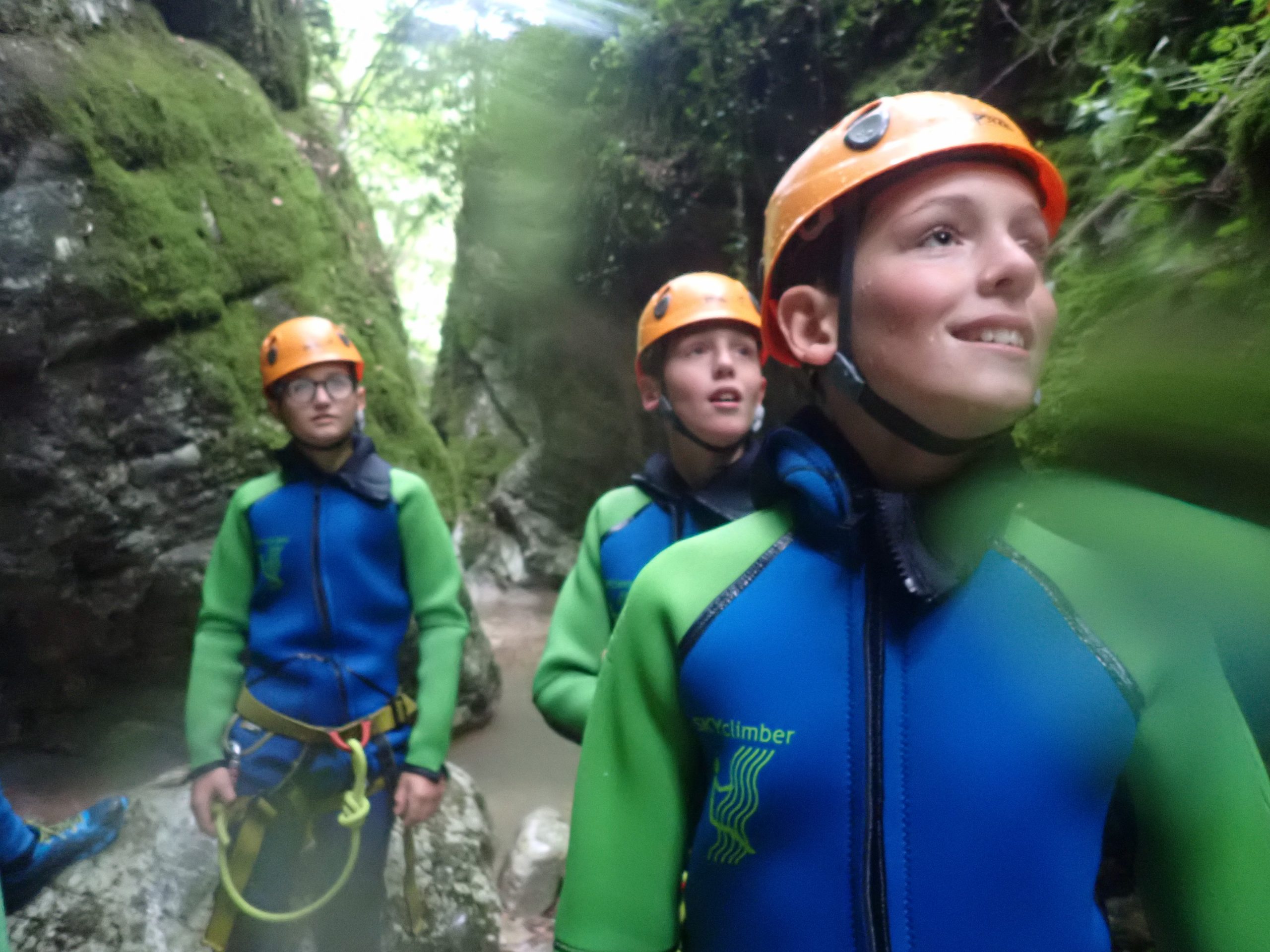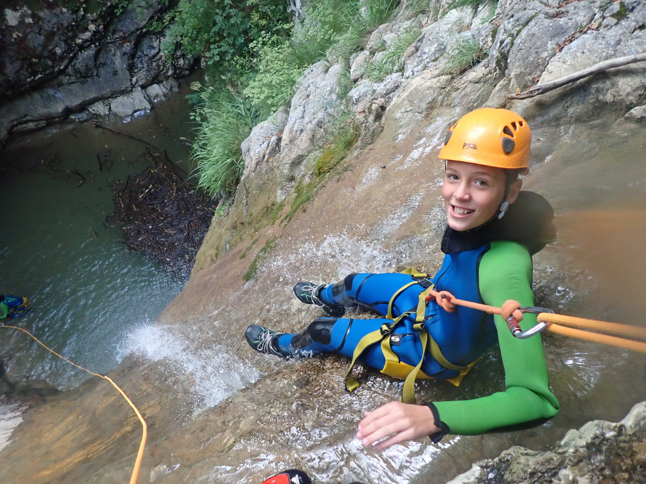 Justus, Hugo und Henri im nächsten langen und steilen Abseiler mit finalem Abgang per Rutscher in die tiefe Gumpe