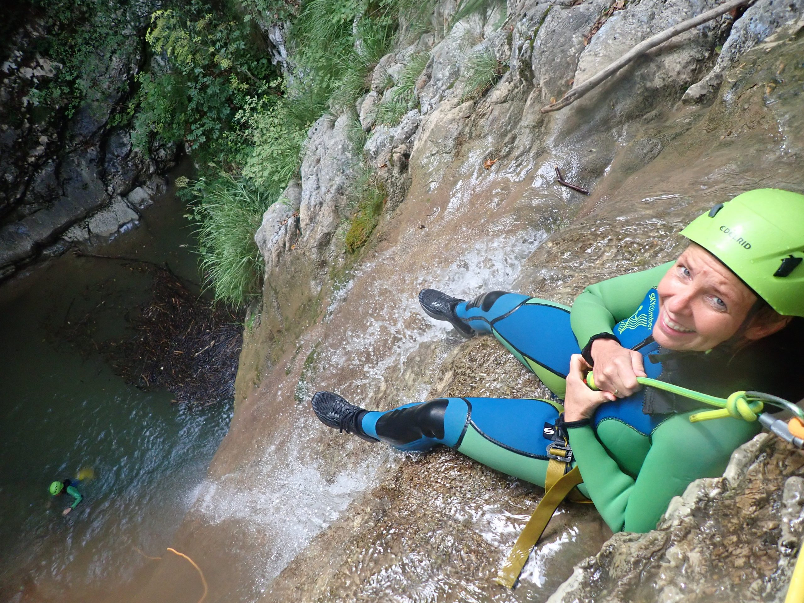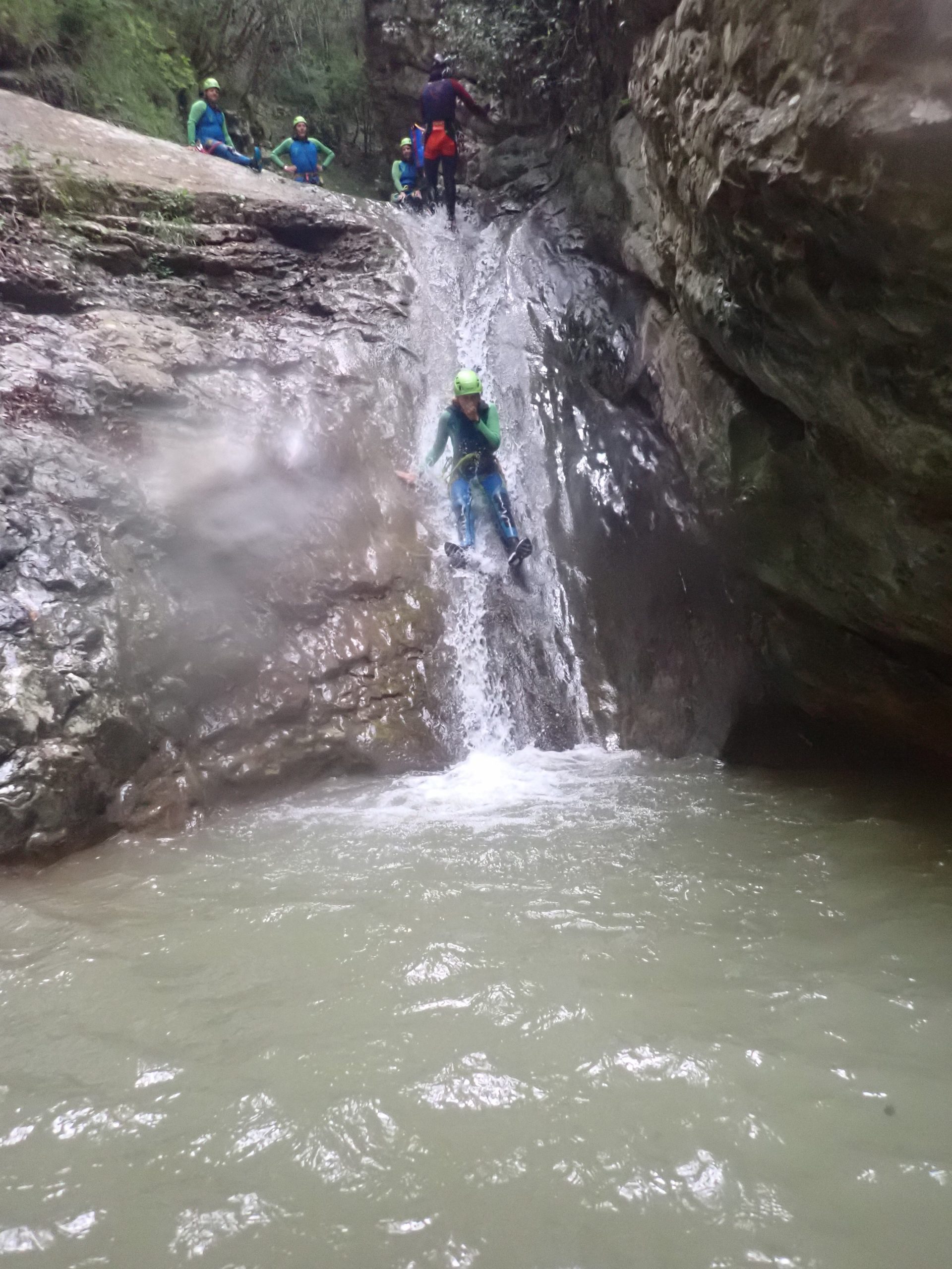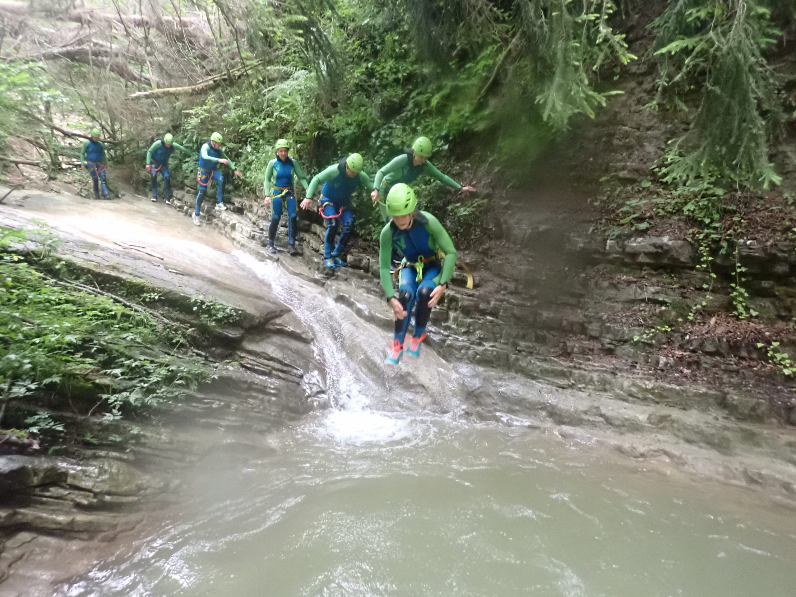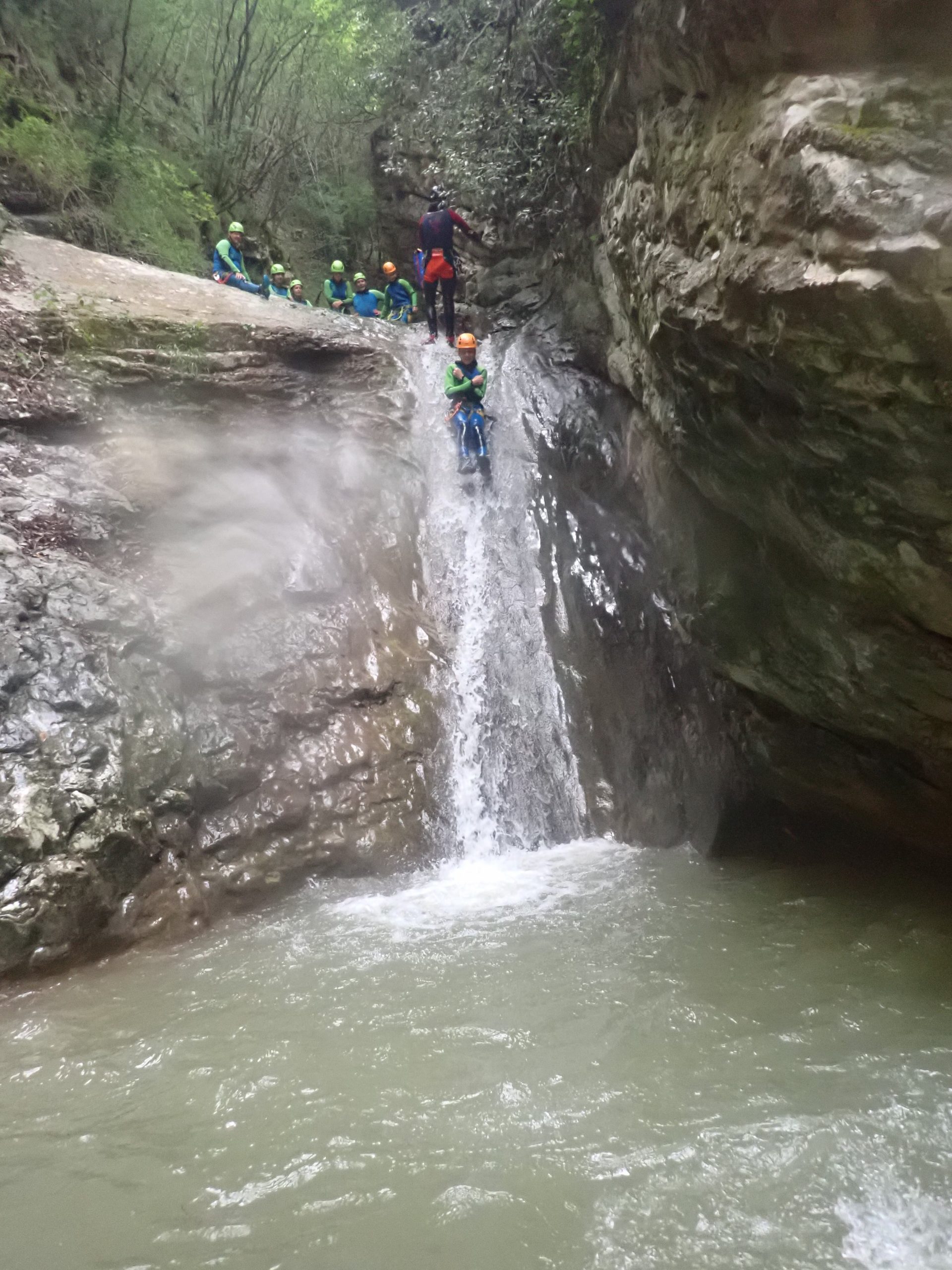 Justus, Hugo und Henri im nächsten langen und steilen Abseiler mit finalem Abgang per Rutscher in die tiefe Gumpe