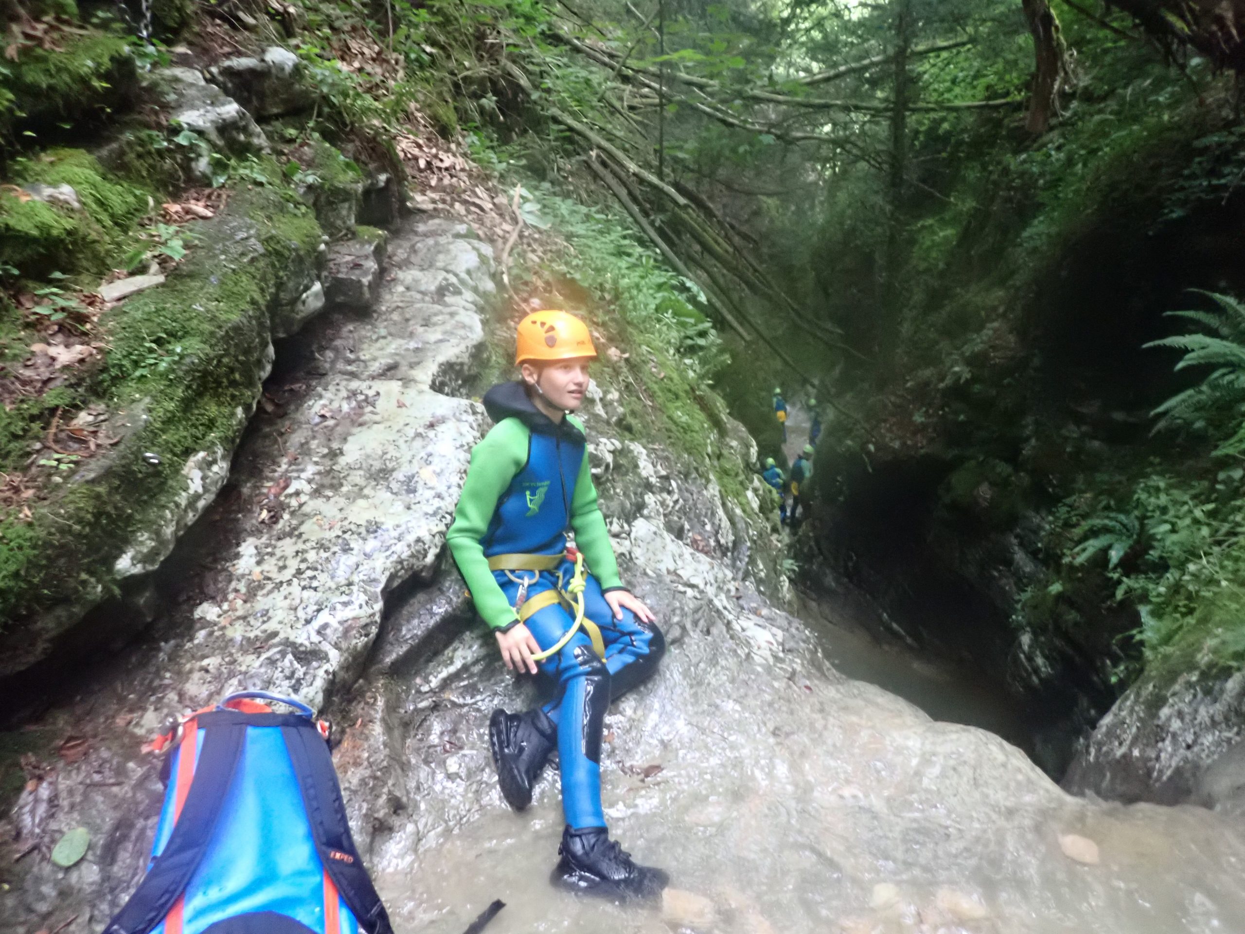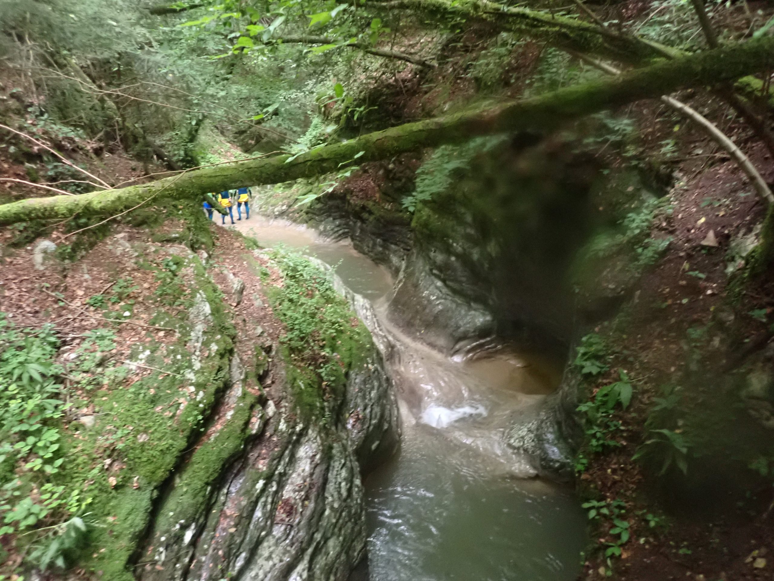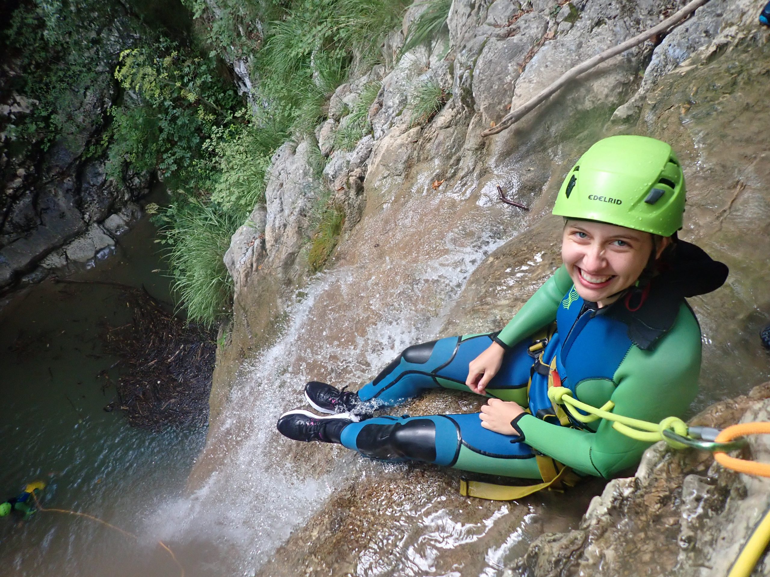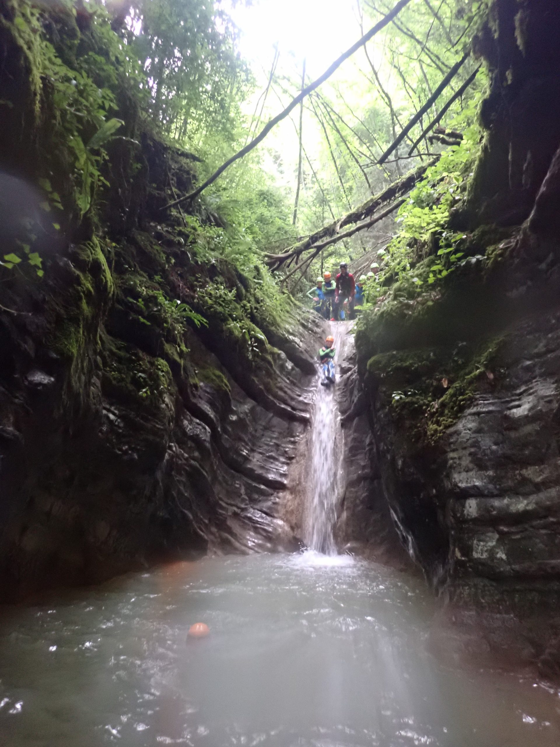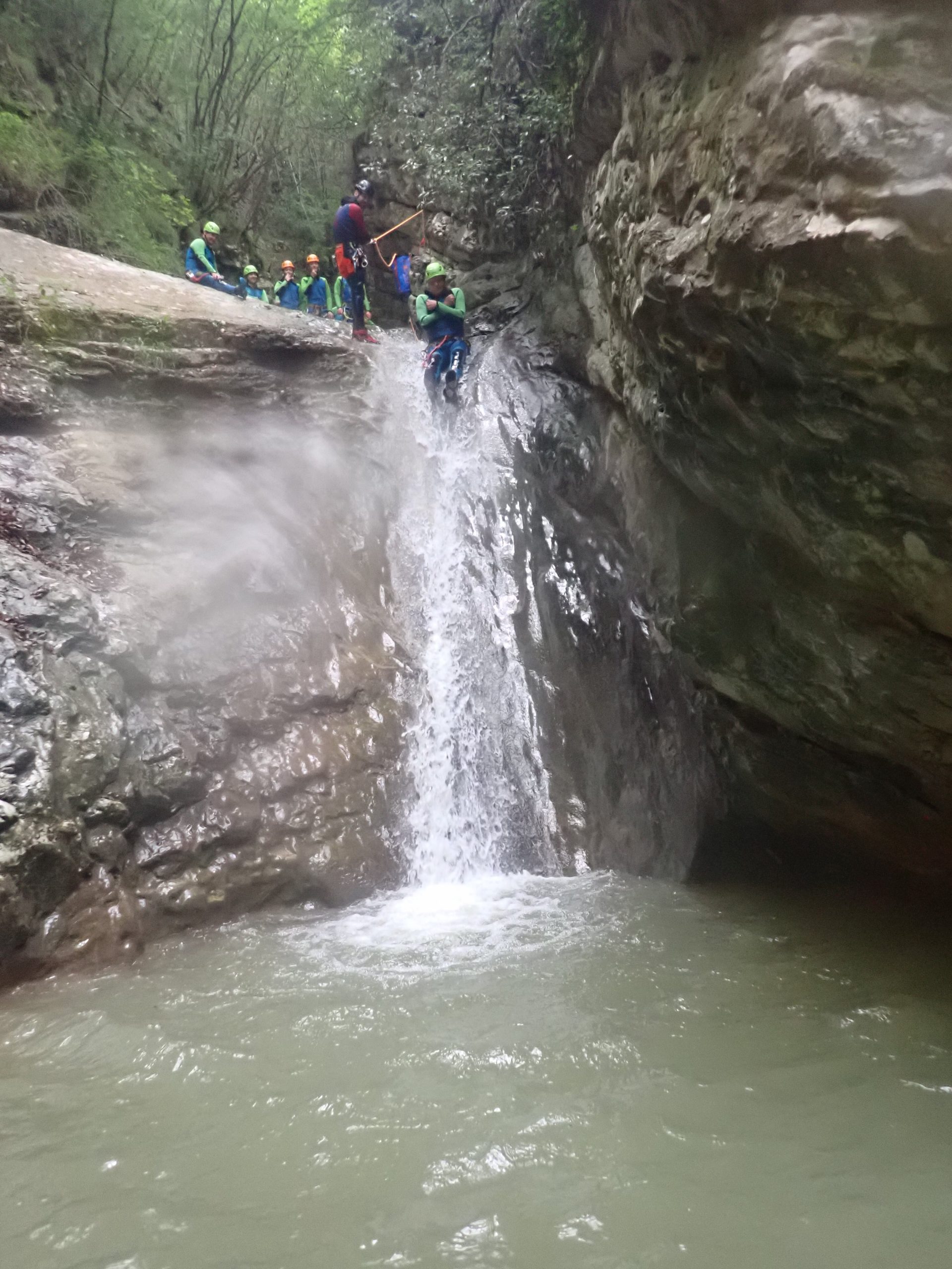 Justus, Hugo und Henri im nächsten langen und steilen Abseiler mit finalem Abgang per Rutscher in die tiefe Gumpe