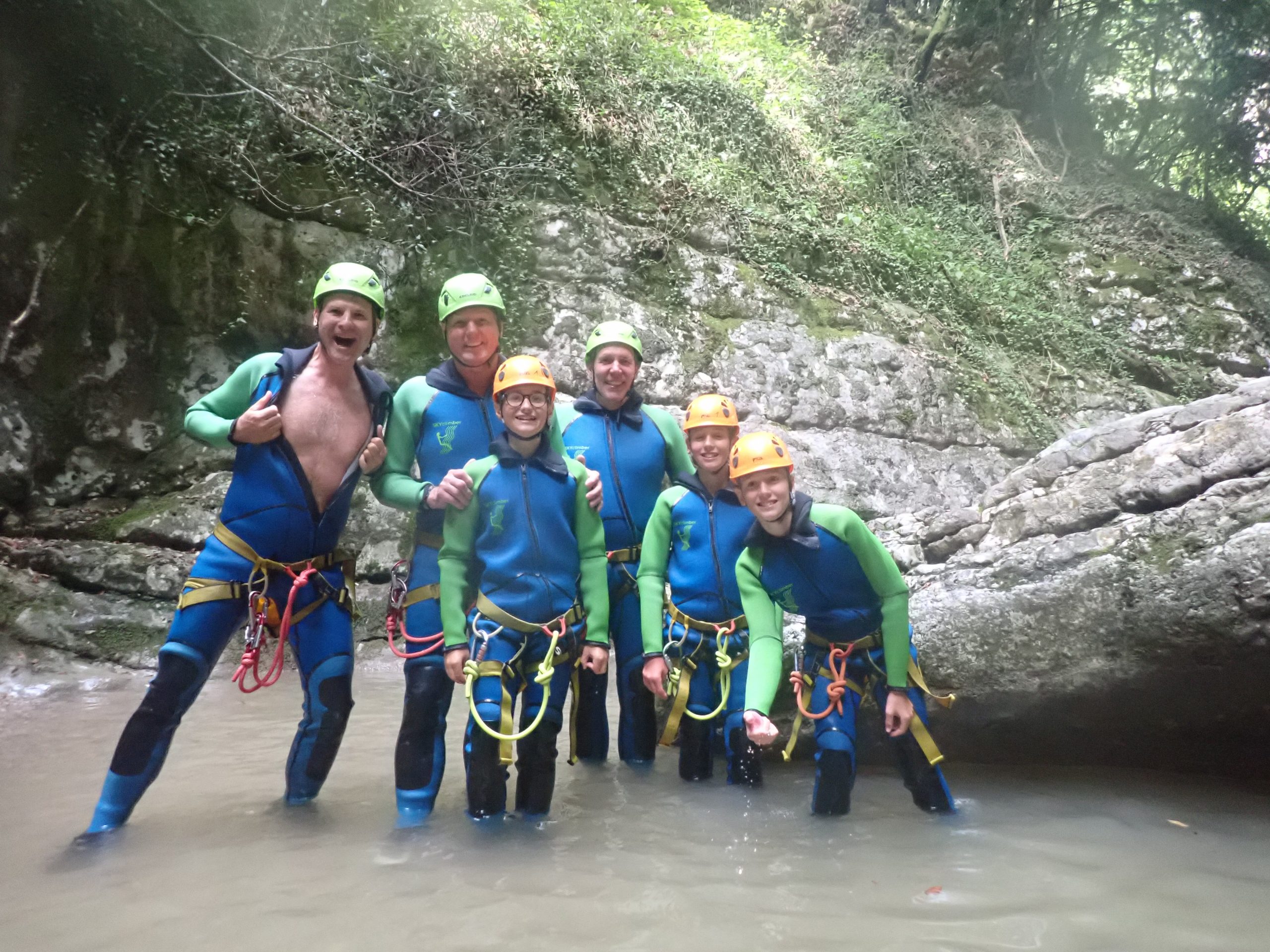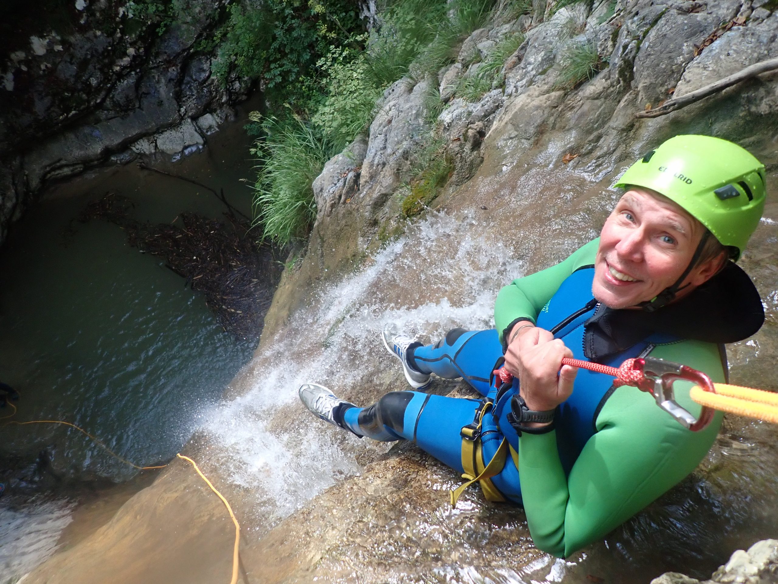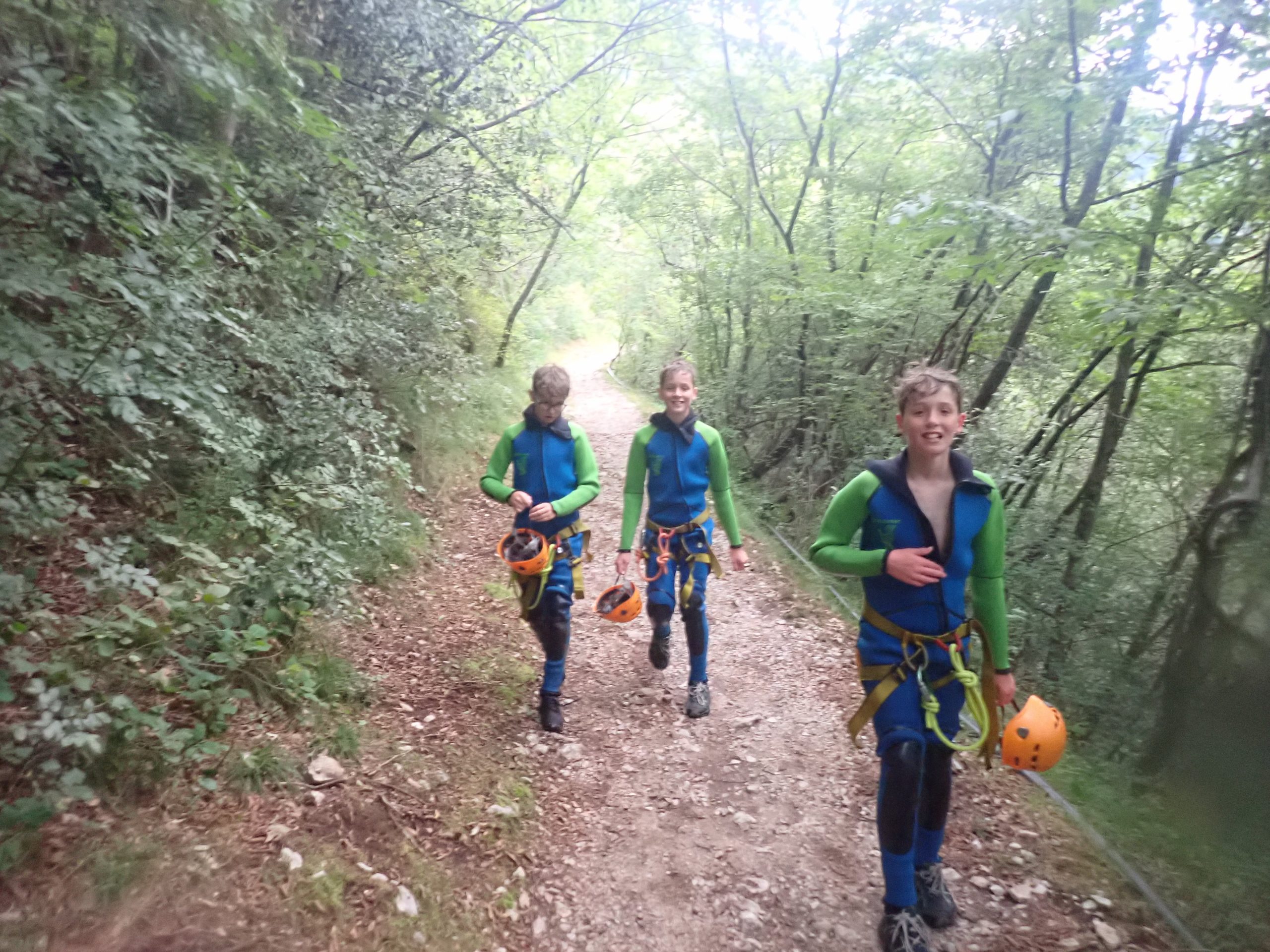 Während unseres gemeinsamen Gardasee Urlaubs Mitte Juli nehmen Mathias, Werner und ich die heranwachsenden zwei Pubertiers Hugo und Henri sowie meinem Neffen Justus zu einem aufregenden Abenteuer im Wildbach Vione in die große Schlucht zwischen Tignale und Gargnano mit. Beim zuverlässigen Canyoning Dienstleister Sky Climber - mit dem ich schon in früheren Jahren sehr gute Erfahrungen gemacht habe - buchen wir die beliebte Gumpenfieber Route. Eine sehr schöne Tour, die gut drei Stunden dauert, und besonders dem Canyoning Einsteiger alles bietet, was schönes Schluchteln ausmacht. Von flotten Rutschpartien, über durchaus ambitionierte Sprünge aus mehreren Metern Höhe in tiefe Gumpen sowie spannende Abseiler an Steilwänden ist alles dabei. Anstrengend war für mich, daß man ab dem Parkplatz, an dem wir Neoprenanzüge, Füsslinge, Sicherheitsgurte und Helme angezogen haben, noch eine gute halbe Stunde bergauf wandern und steigen mussten, um bis zum Einstieg unserer Tour zu kommen. Dies war für mich durch meine aktuelle Atemwegs Problematik schon zum Anfang eine ziemliche Herausforderung. Mit dem in Innsbruck lebenden Kärtner Studenten Max hatten wir einen versierten und geprüften österreichischen Schluchtenführer als Guide dabei, der unsere große 10er Gruppe sicher durch die Tücken des Wildbachs Vione leitete. Mit uns waren auch noch eine nette Familie aus Steinfurt - Vater Harry und Mutter Andrea sowie ihre beiden Töchter Emma und Anni - mit von der Partie. Viel Spaß und sportliche Betätigung, etwas trübes Wasser nach den Regenfällen zum Anfang der Woche und viele Äste im Weg ... es hat dennoch sehr viel Spaß gemacht und wir kamen - trotz mit 15° Grad sehr niedrigen Wassertemperaturen - alle gesund und munter von unserem Ausflug wieder zurück.