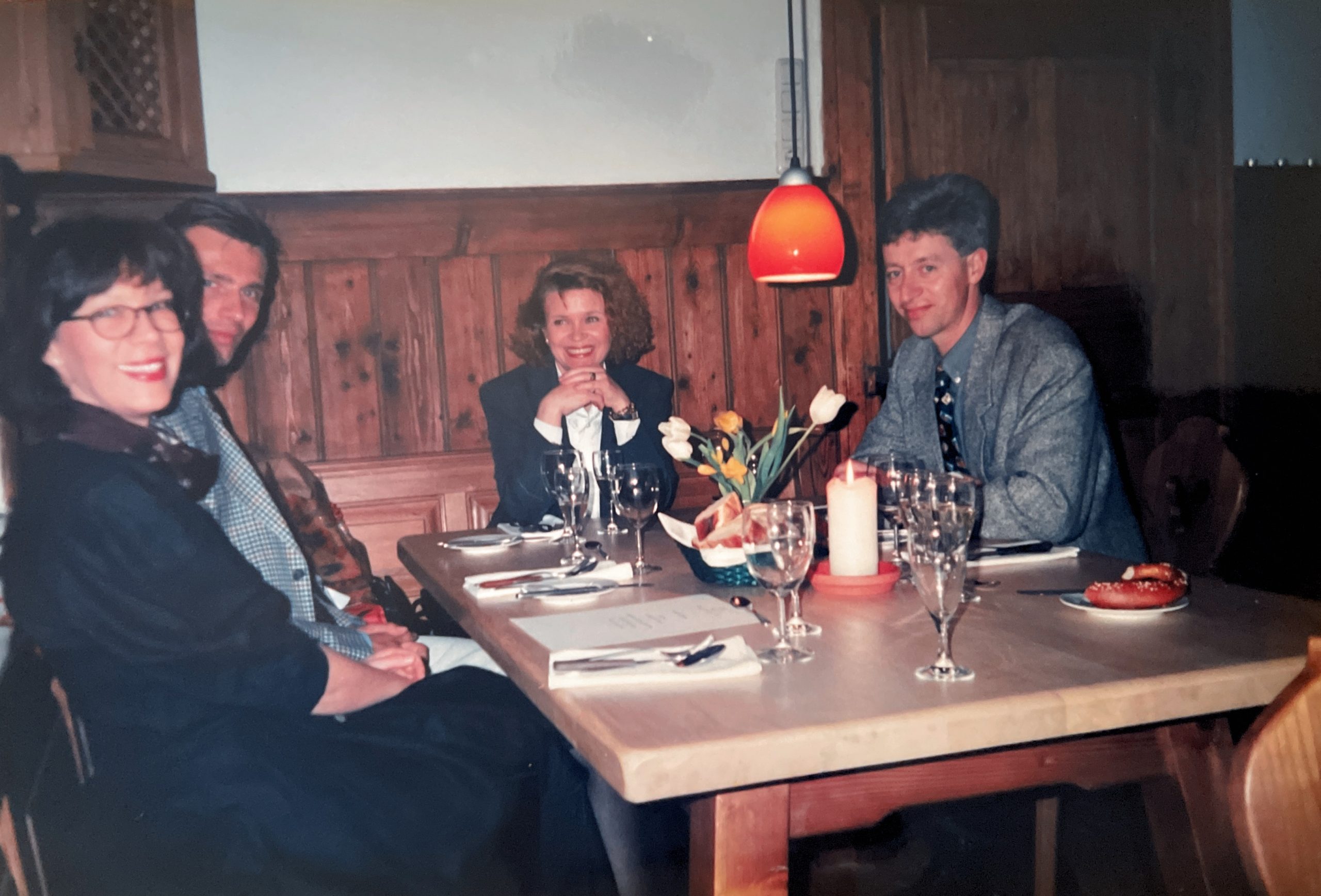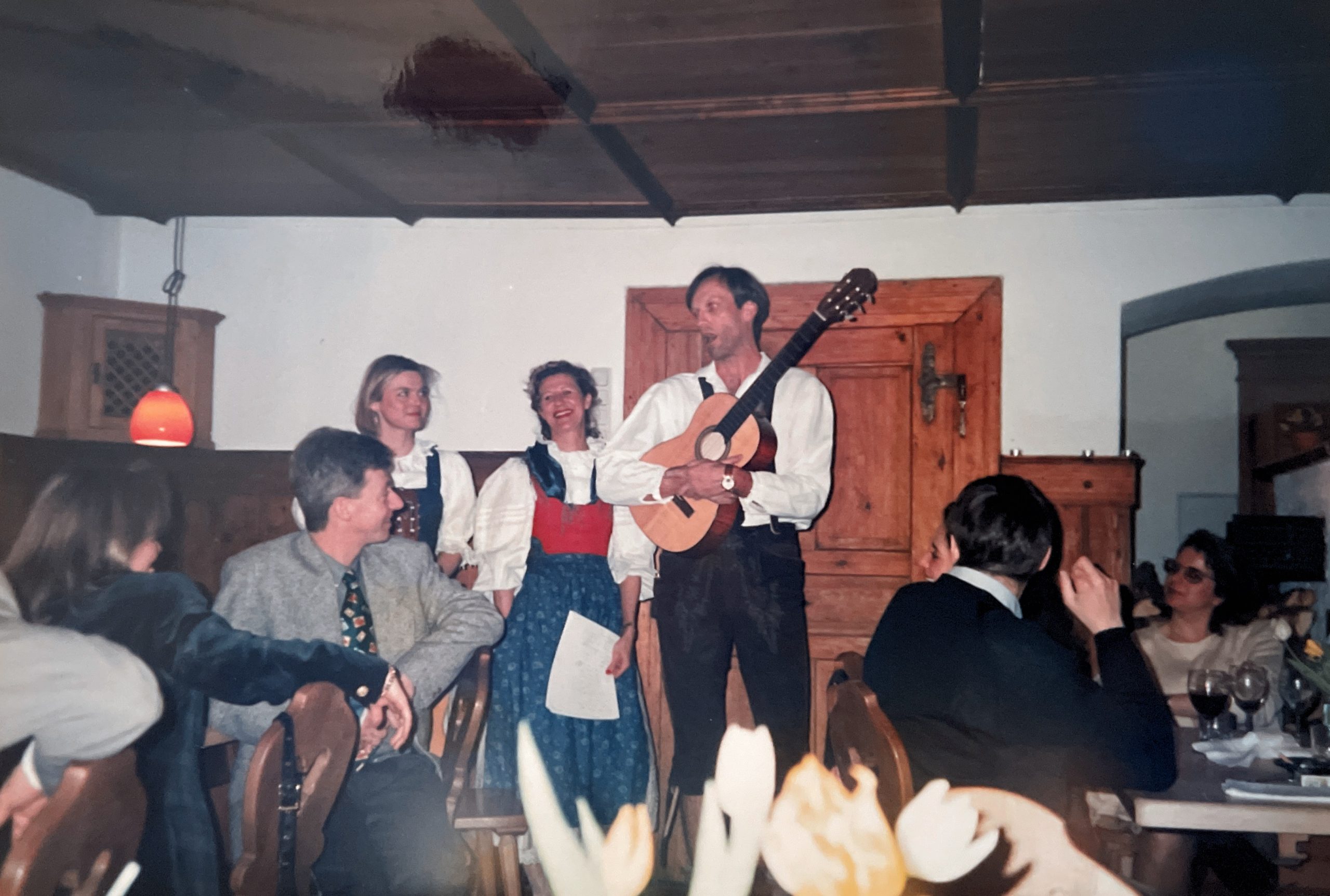 Caro feiert ihren 34. Geburtstag. Wir sind mit einem Schwung Freunde im tiefen Wald im Forsthaus Höhlmühle - einer gemütlichen Wirtschaft an einer kleinen Nebenstarsse zwischen Murnau und Sindelsdorf, die es heute leider nicht mehr gibt. Elke & Hans-Peter Quodt geben ein Ständchen mit Gitarre und Gesang. Es wurde ein lustiger, spritziger, ausgelassener und sehr feucht fröhlicher Abend, keine Ahnung, wie wir da später heim gekommen sind. Aber; das sind wir. Und alle in der Zwischenzeit ein paar Jährchen älter geworden...