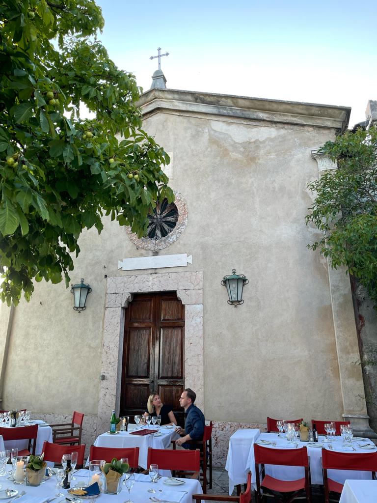Die kleine Kirche von San Vigilio stammt aus dem 15. Jahrhundert und zwischen ihr und dem See ist der Garten des Restaurants