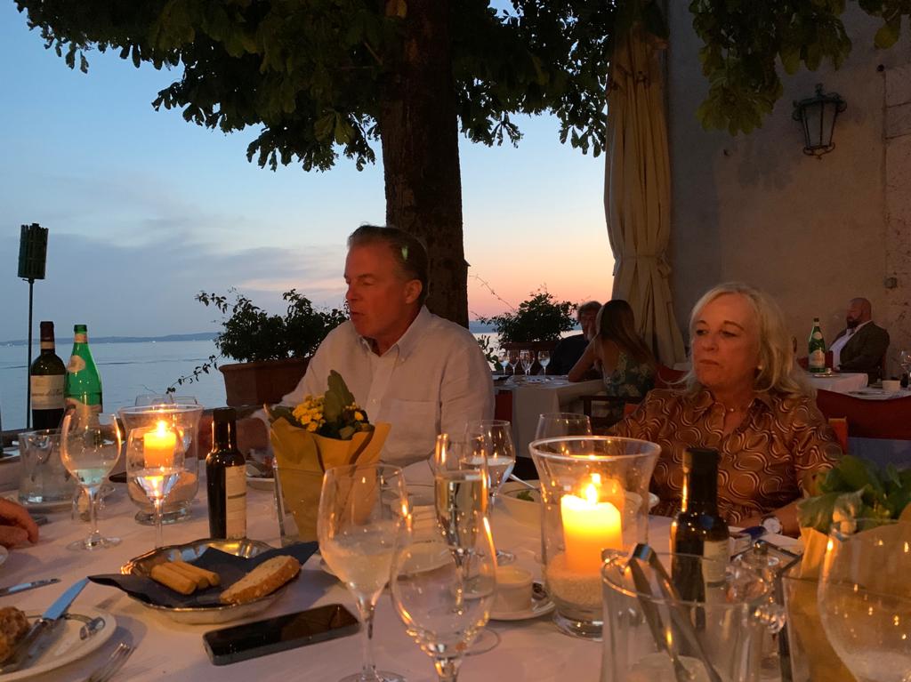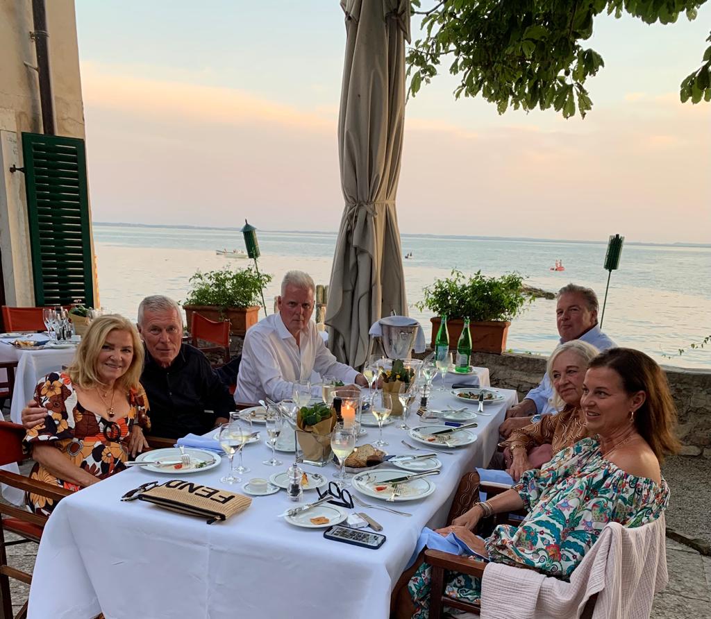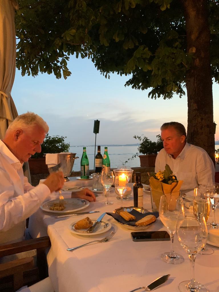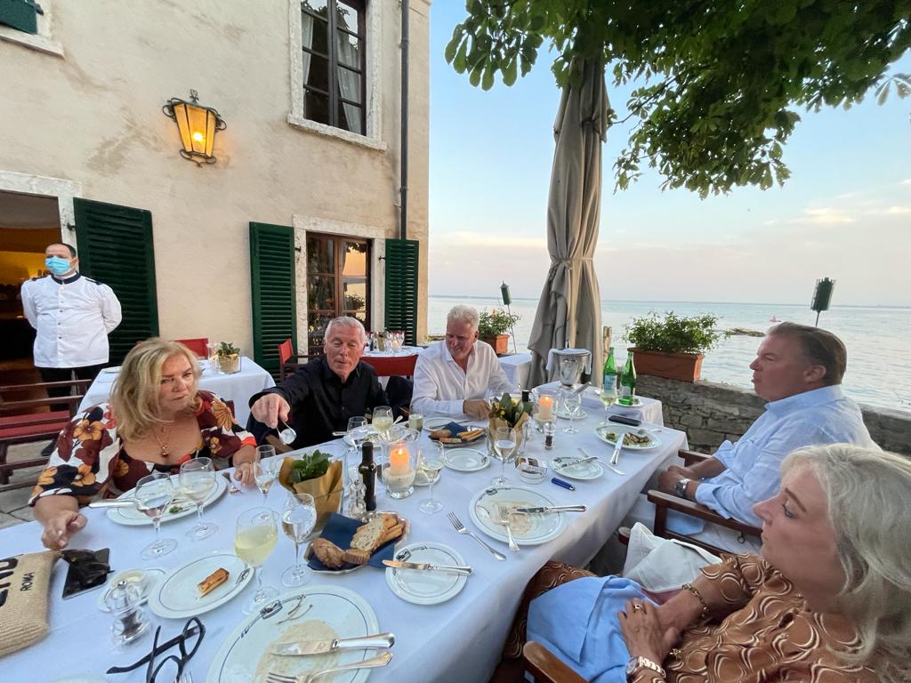 Anläßlich von Karl Pohlers Geburtstag sind wir - gemeinsam mit Michaela und Kurt Wolf aus Heubach - zu einem wunderbaren Abendessen in das Restaurant des Hotels San Vigilio am Ostufer eingeladen. Von Salò aus geht´s mit Karls Boot rüber auf die andere Seeseite. Die Punta San Vigilio ist eine kleine Landzunge am Gardasee zwischen Garda und Torri del Benaco am Fuße des Monte Baldo und ragt nach der Halbinsel Sirmione am weitesten in den See hinaus. Die Punta, italienisch für Spitze, besteht heute aus der Villa Guarienti di Brenzone, der Locanda San Vigilio mit einer Kirche gleichen Namens und einem kleinen Hafen mit edlem Hotel, Restaurant und der Taverne auf einer Mole. Im Norden schließt sich die Baia delle Sirene an, die als schönste Badebucht des ganzen Sees gilt. Mit seinen Tischen entlang dem kleinen Hafen ist die Taverne - wo wir uns zunächst einen herrlichen Aperitif gönnen - ein charmanter Ort, um sich bei einem Drink zu entspannen und den wunderbaren Seeblick zu geniessen. Während des Tages erhält man Erfrischungen und kleine Snacks und abends, wenn der Sonnenuntergang den Himmel färbt und das Wasser in Regenbogenfarben strahlt, ist es richtig romantisch. Das schöne Restaurant befindet sich in einem eleganten Speisesaal mit Sitzgelegenheiten am Wasser und serviert traditionelle italienische Gerichte, die mit frischen Produkten der Saison zubereitet werden. Im Sommer kann man im Freien im Innenhof der Kirche San Vigilio aus dem 15. Jahrhundert, speisen. Die intime Umgebung bietet einen herrlichen Blick auf den See mit spektakulären Sonnenuntergängen, die man von jedem Tisch aus sieht. Das Restaurant steht auch zur privaten Vermietung zur Verfügung. Wir sind mit die ersten Gäste, haben wie immer einen hervorragenden Tisch und werden von dem aufmerksamen Personal optimal verwöhnt