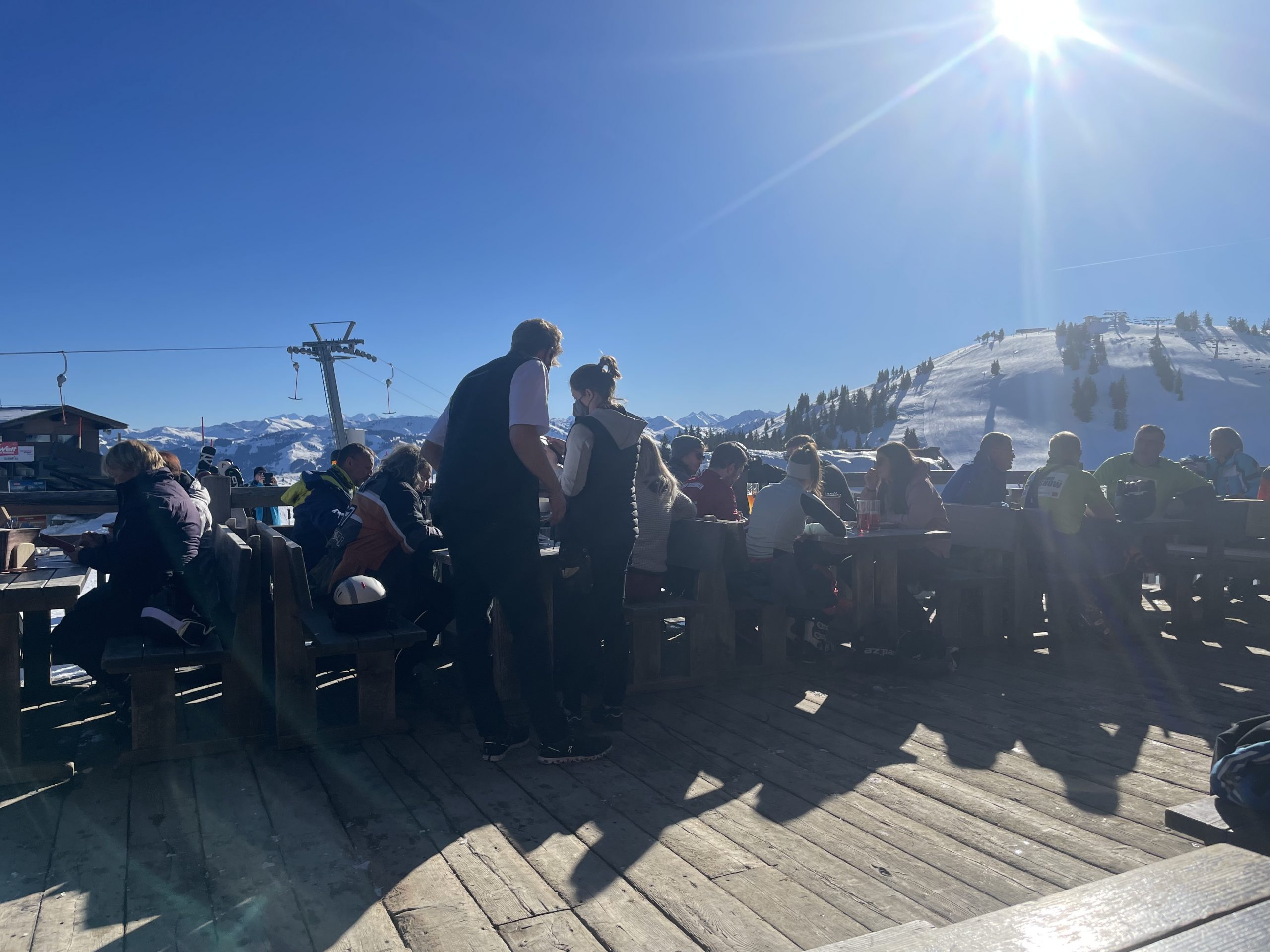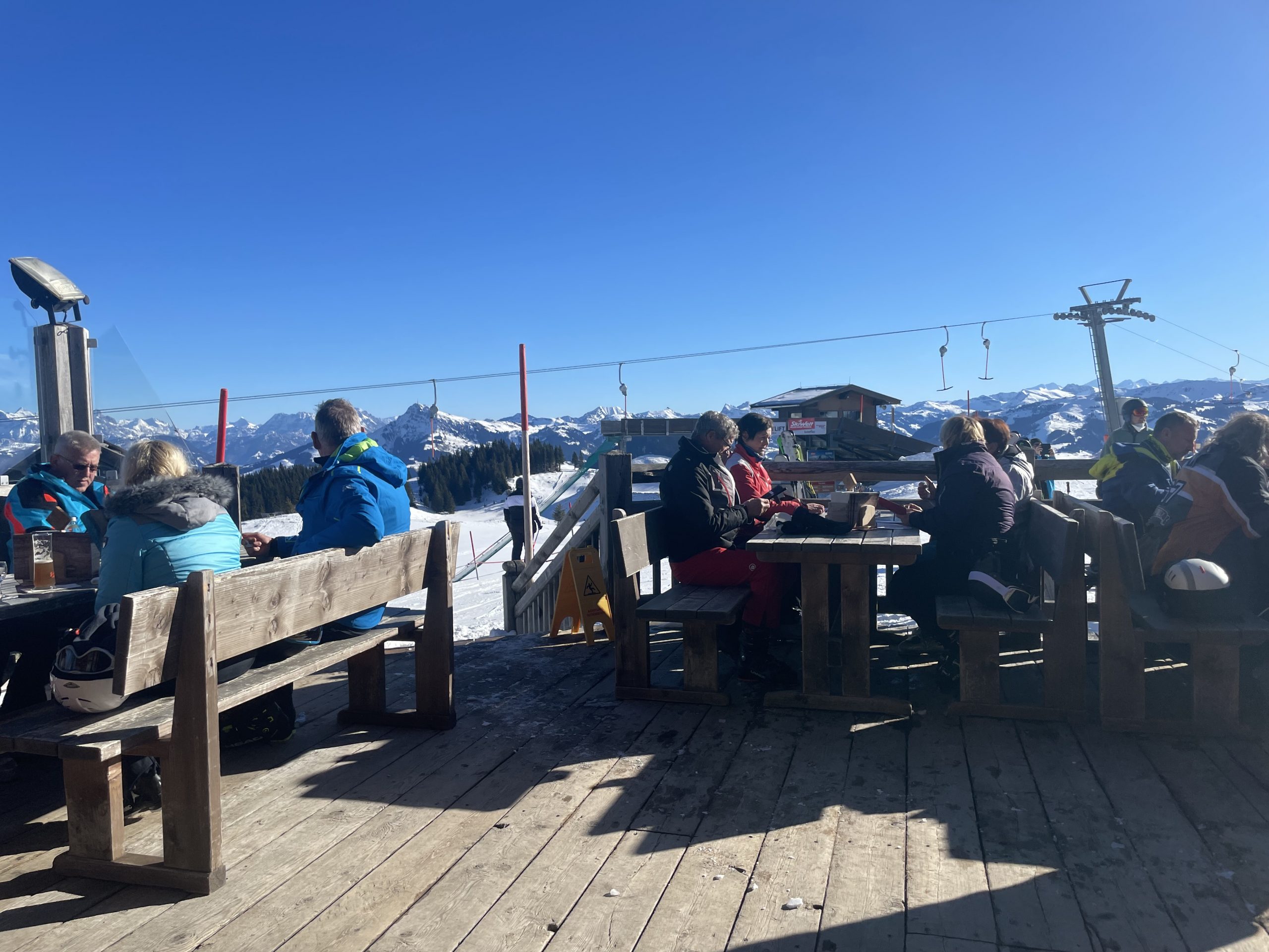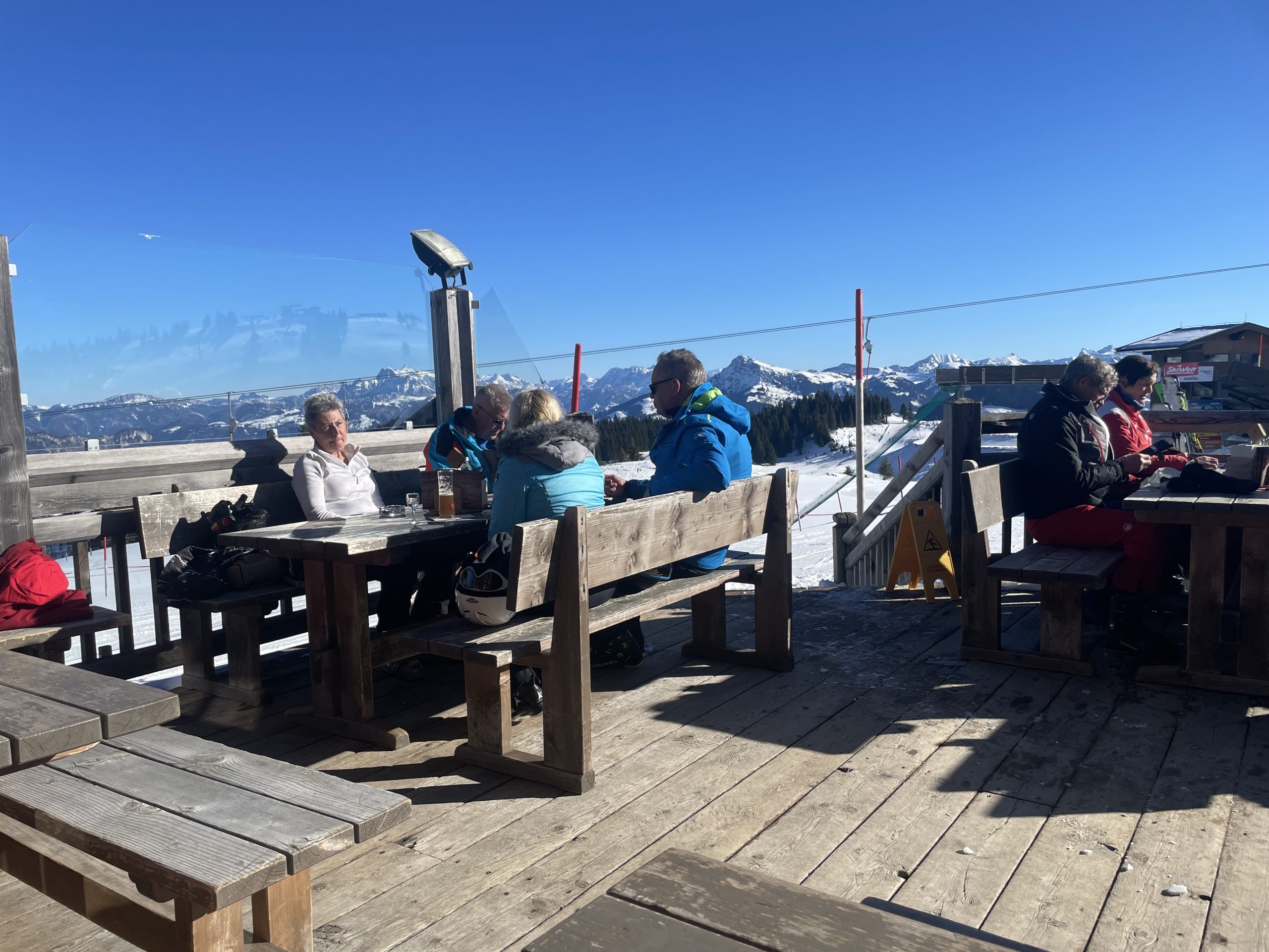 Unser beim Chef persönlich reservierter Platz an der Sonne empfängt sechs Skifahrer, die sich eine Pause verdient haben