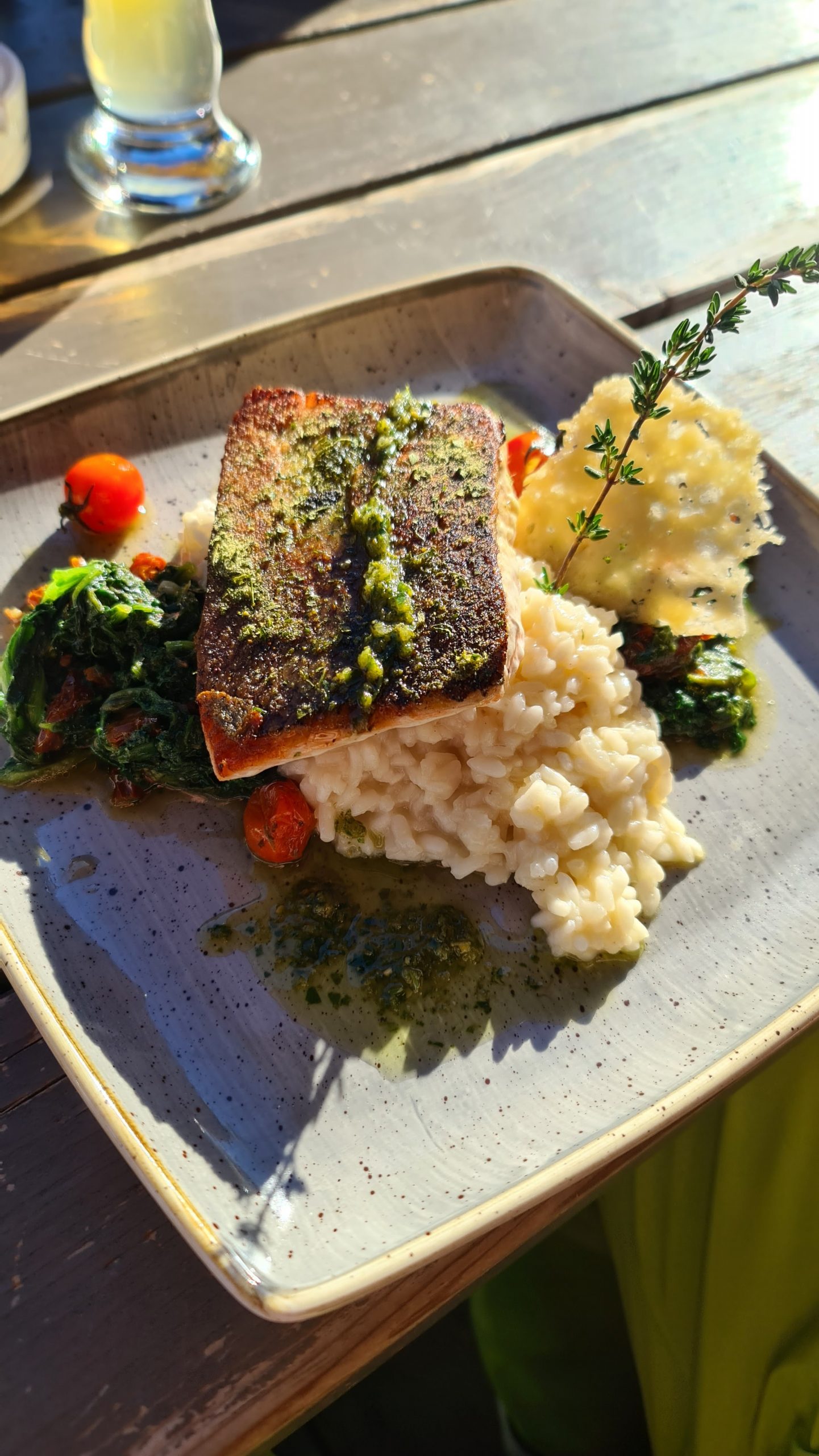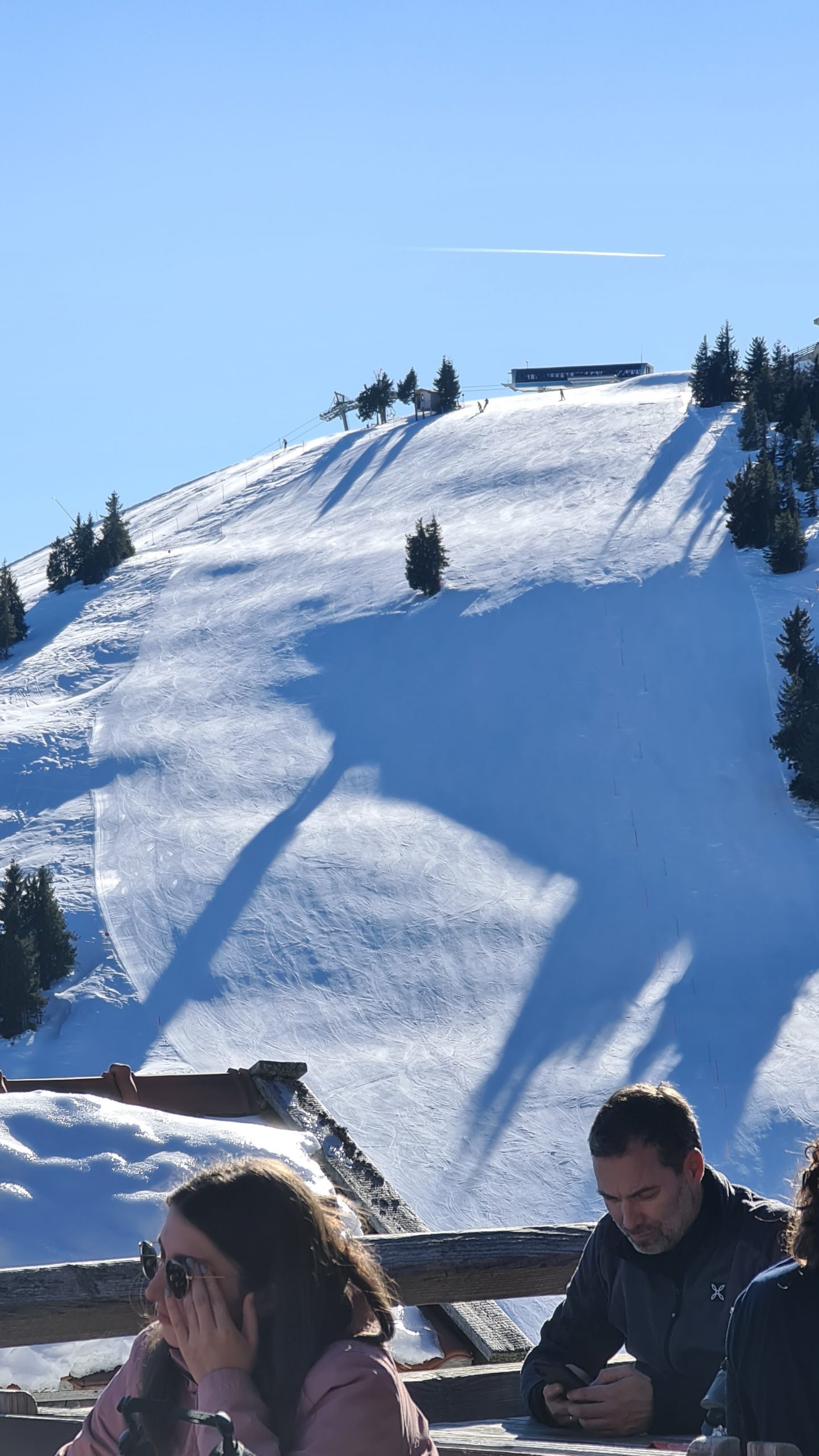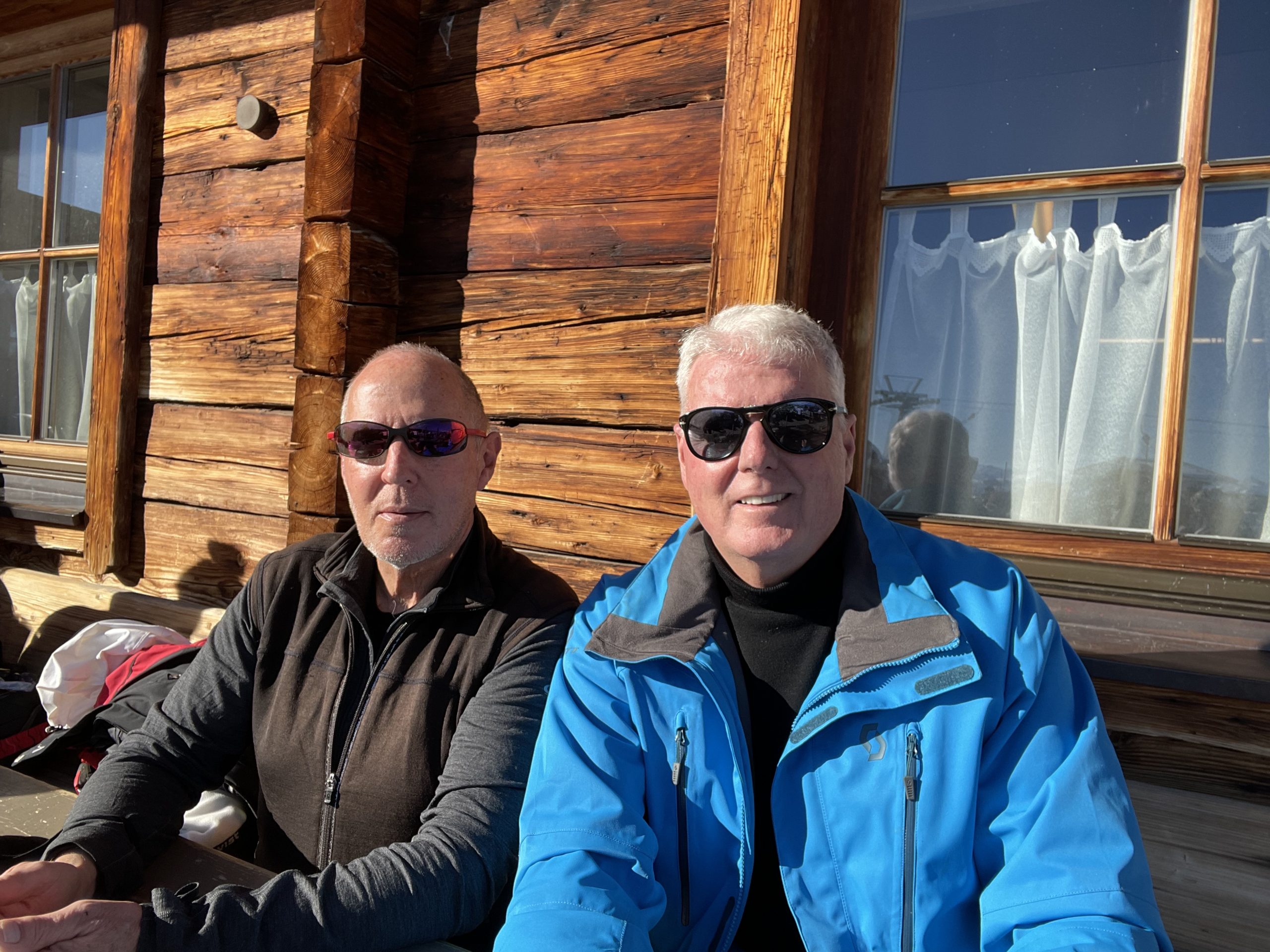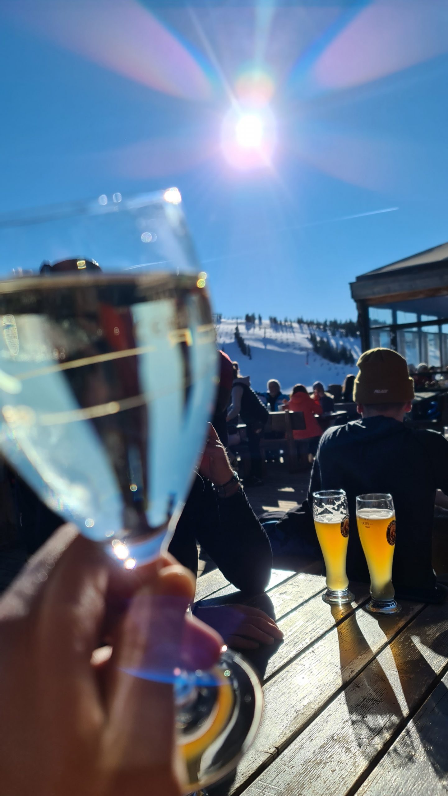 Unser beim Chef persönlich reservierter Platz an der Sonne empfängt sechs Skifahrer, die sich eine Pause verdient haben